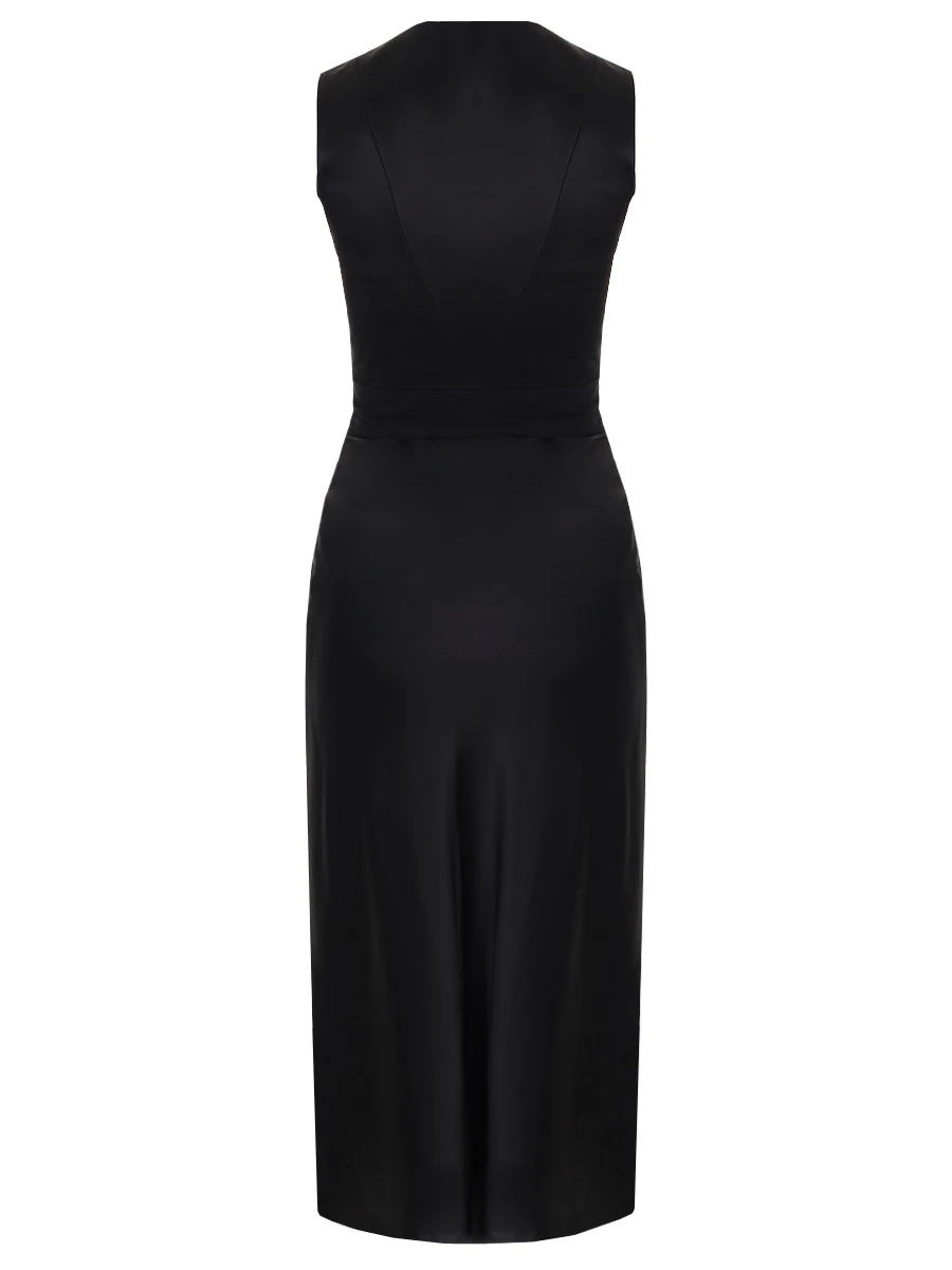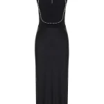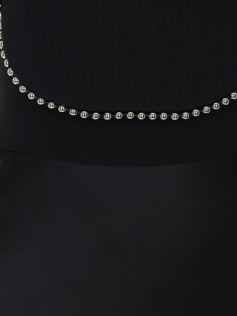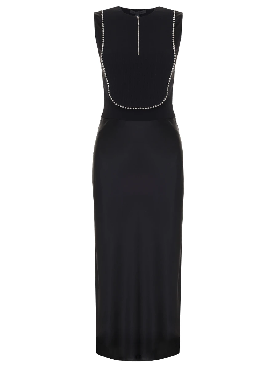 -Черное комбинированное платье из вискозы и шелка от ALEXANDER WANG. -Модель с акцентом кроя на талии, без рукавов, круглым вырезом горловины, декором и застежкой на молнию на груди. -Вечерний образ дополнят сдержанная бижутерия и миниатюрная сумка на плечо.