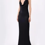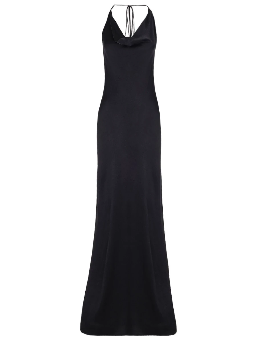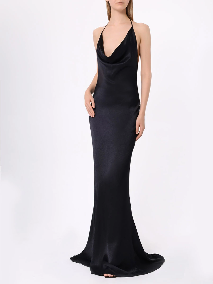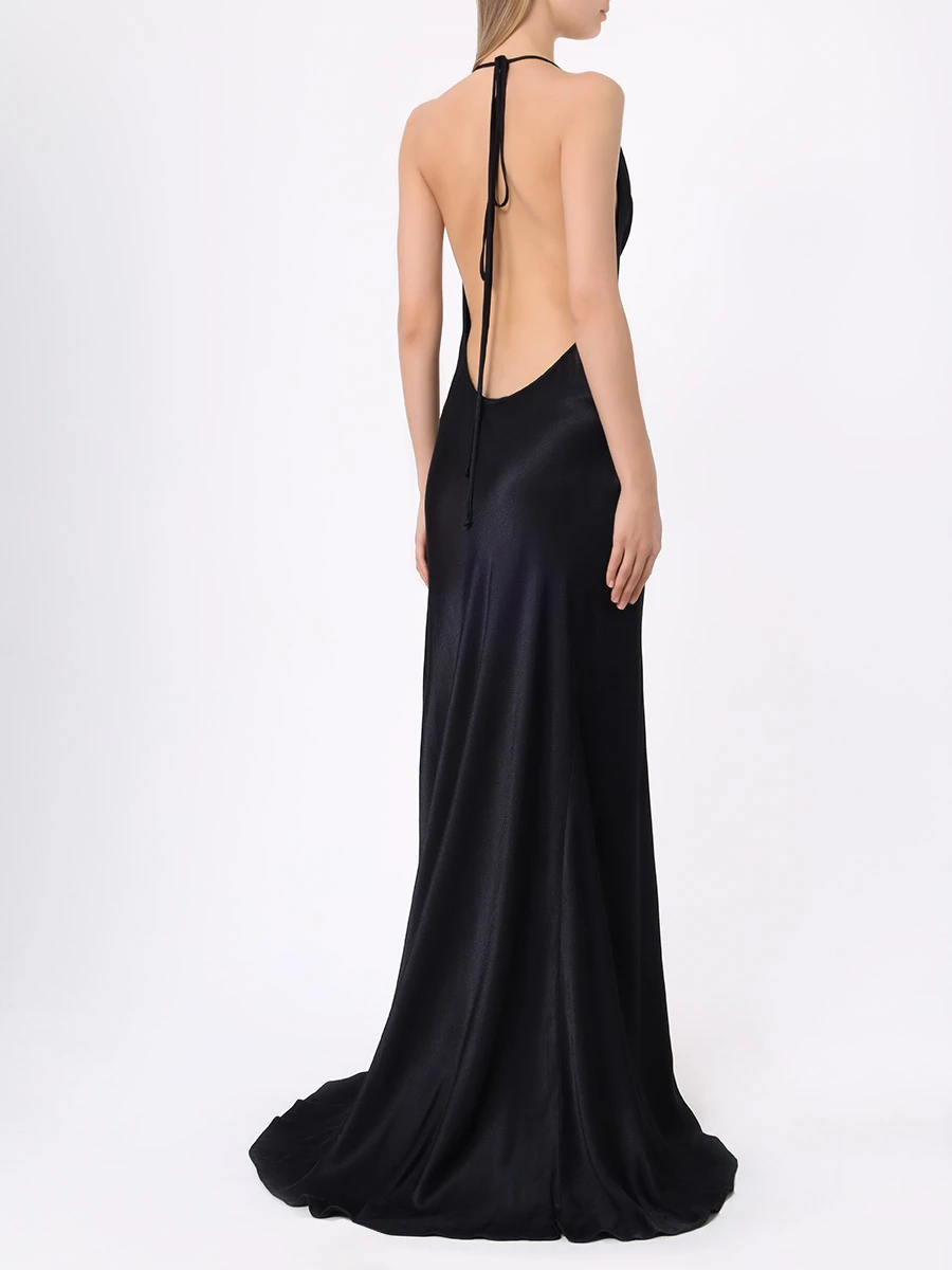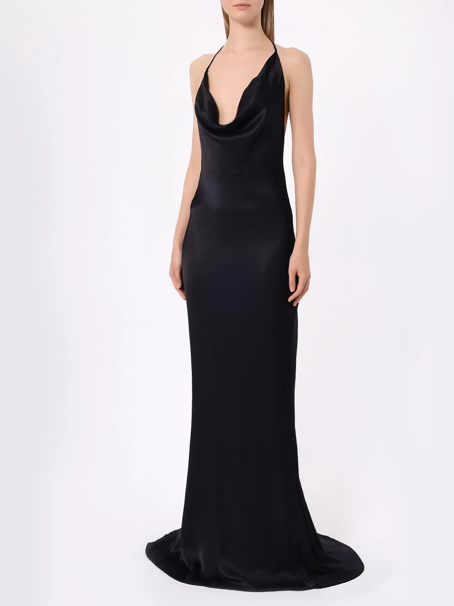 -Черное платье в пол из струящейся вискозы от THEONE BY SVETLANA ERMAK. -Модель с кроем по фигуре, расклешенным подолом, драпировкой на груди, бретелью-халтер и открытой спиной. -Классические линии кроя платья идеально обрисовывают женственный силуэт. Доставка товара осуществляется при условии предварительной оплаты картой на сайте (кроме заказов на самовывоз в городе Москва)