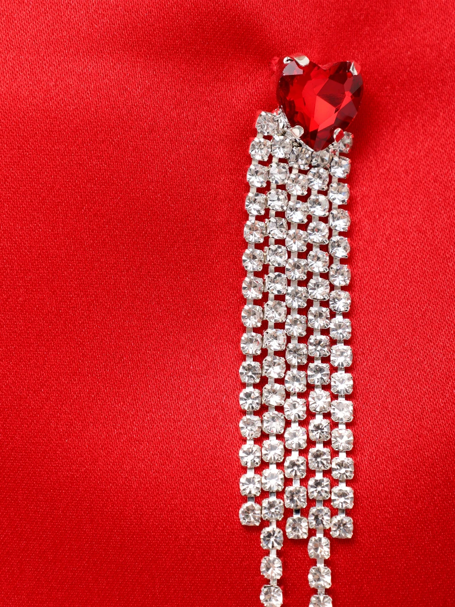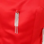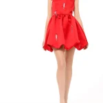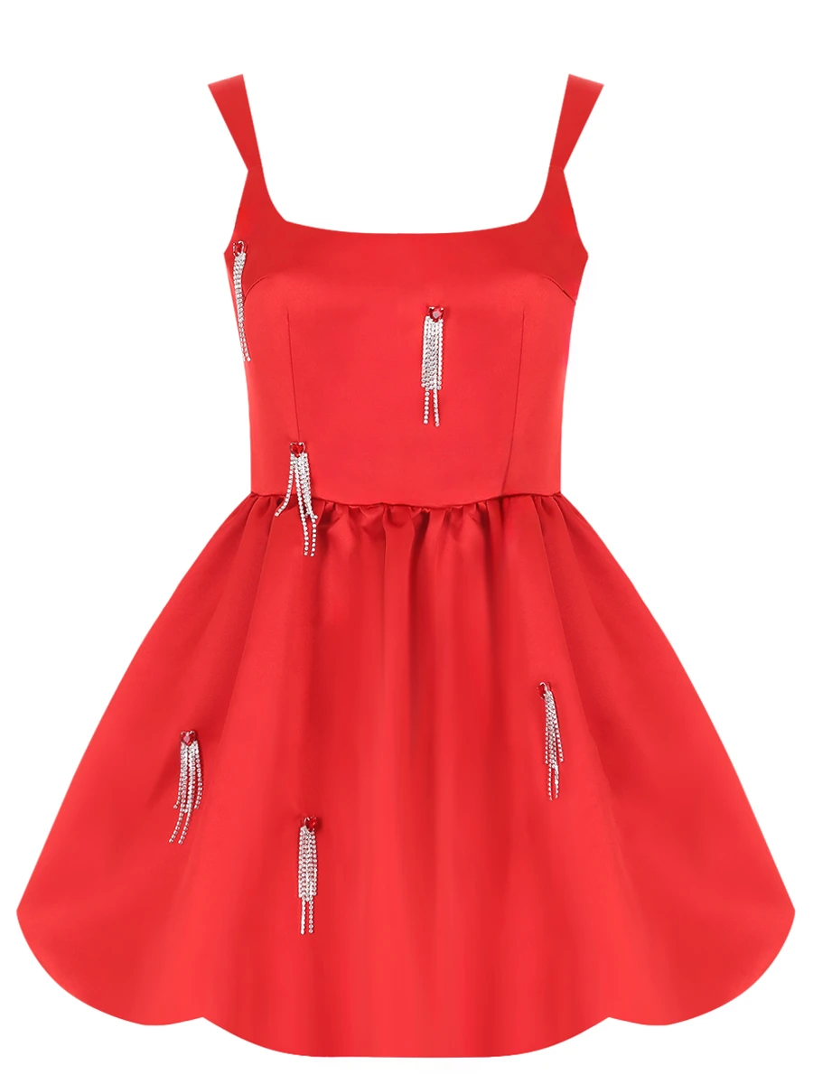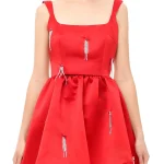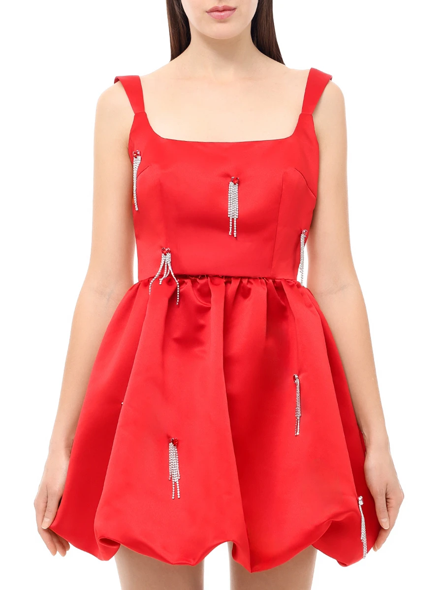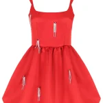 -Красное мини-платье из смесовой вискозы от BOTROIS. -Модель с акцентом кроя на высокой отрезной талии, расклешенной юбкой, широкими бретелями на плечах, застежкой на потайную молнию сзади. -Декор стразовой лентой добавляет образу лёгкие блики.