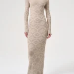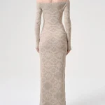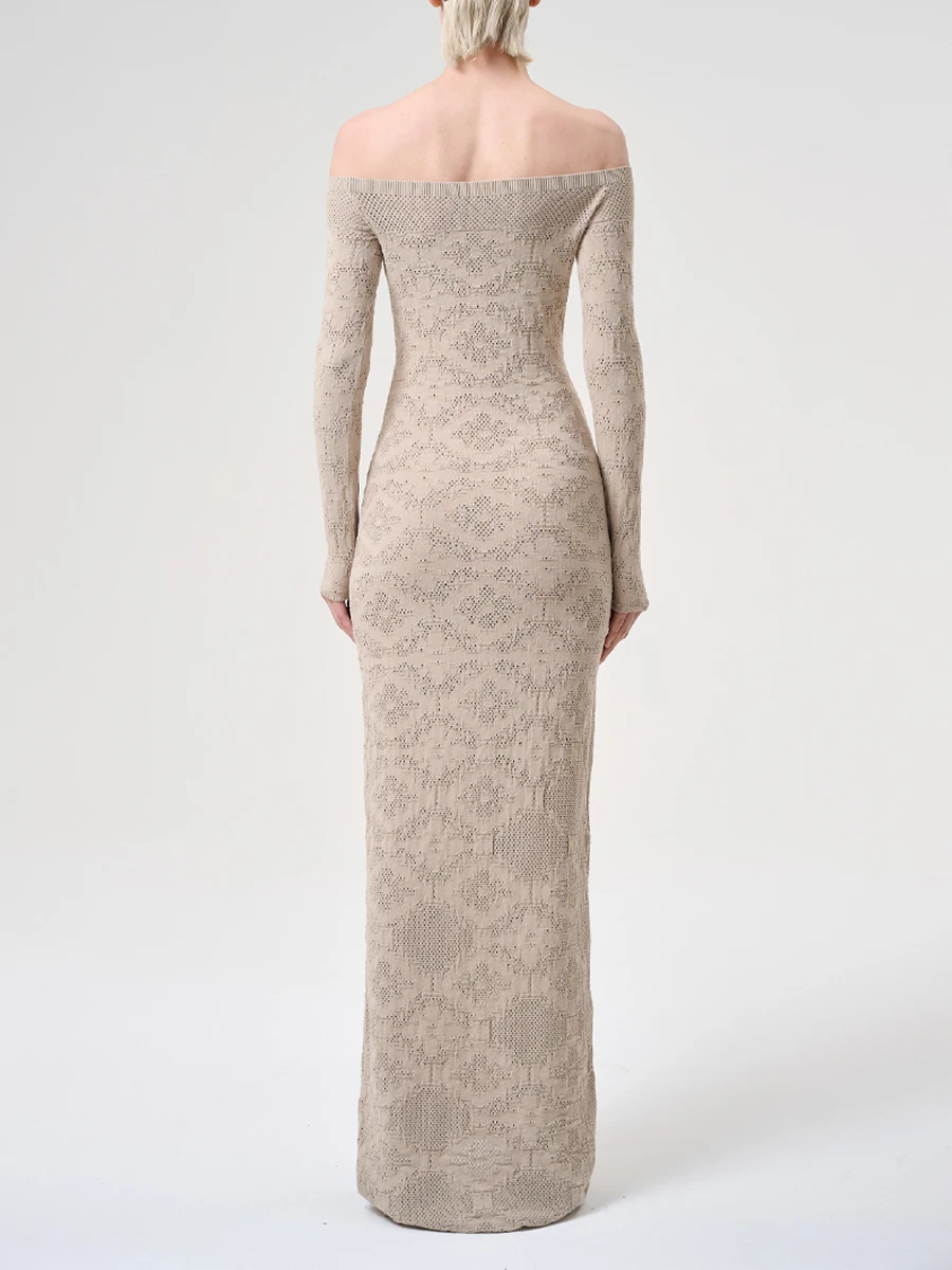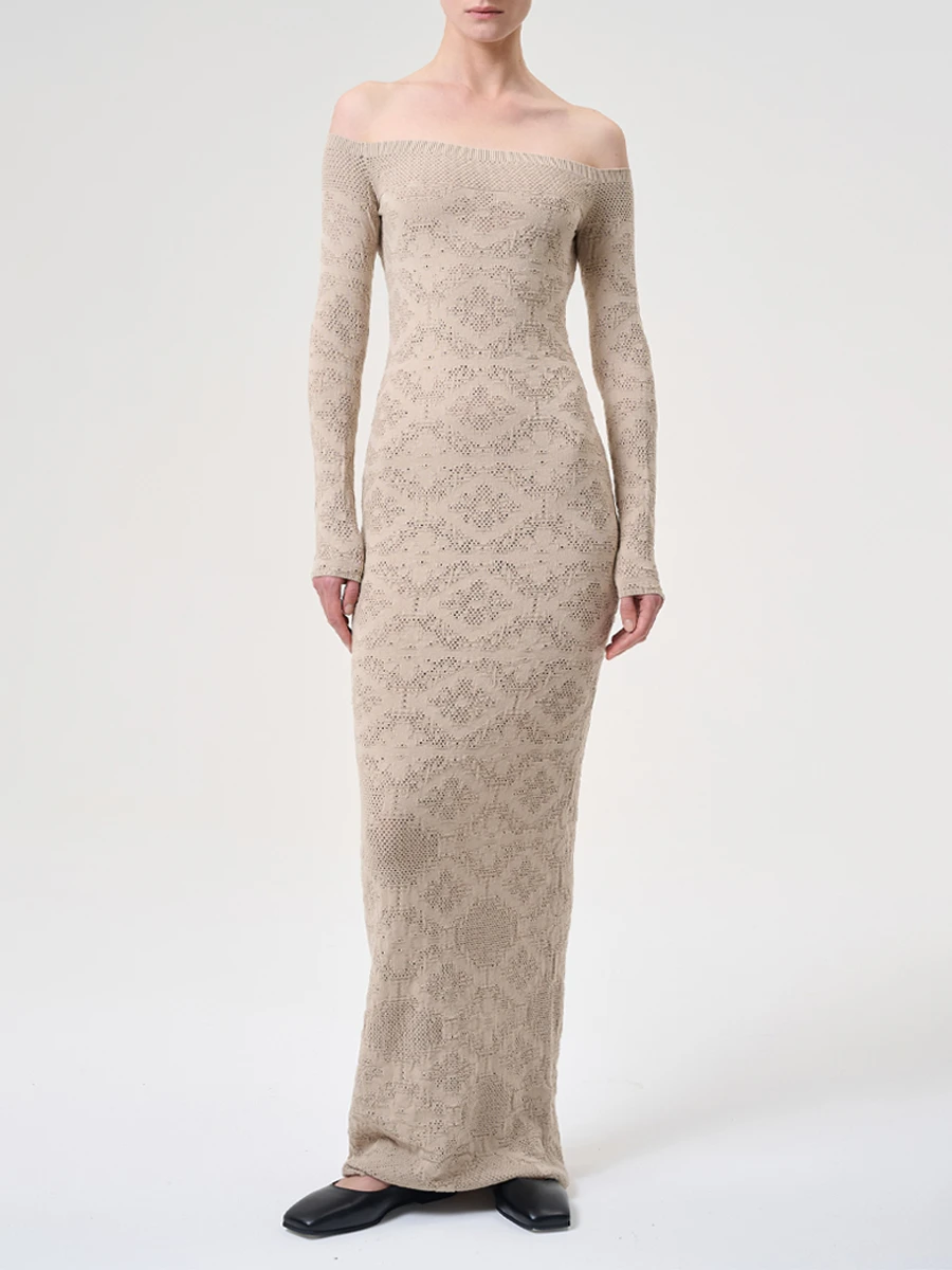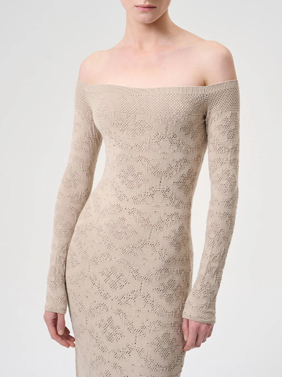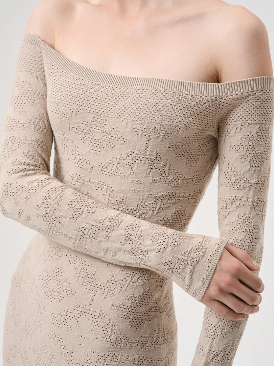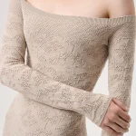 -Бежевое платье ажурной вязки из смесовой вискозы от CEPHEYA. -Модель полуприлегающего кроя с открытой линией плеч и длинными рукавами. -Эластичный трикотаж превосходно тянется, помогая модели безупречно облегать фигуру, органично подстраиваясь под движения. -Платье подойдет девушкам с размерами с 40 по 44.