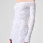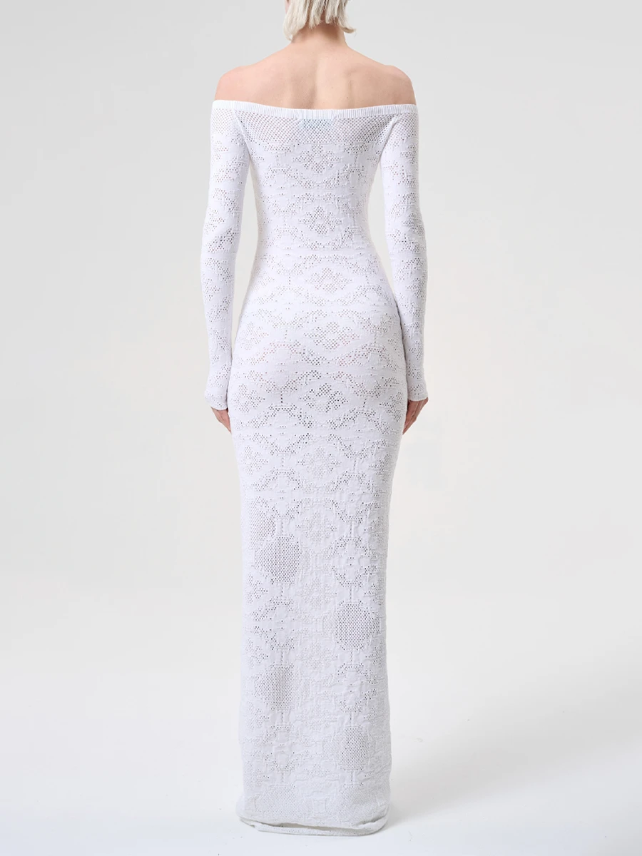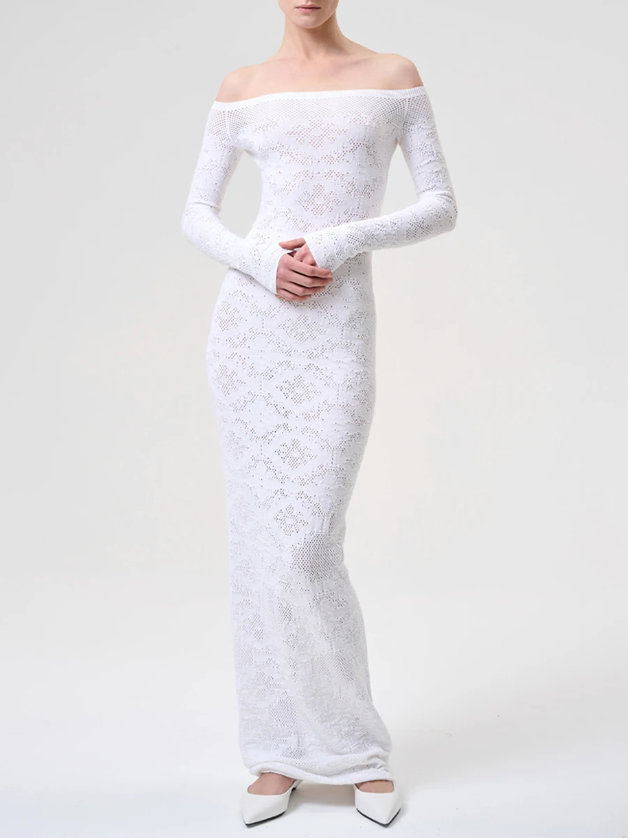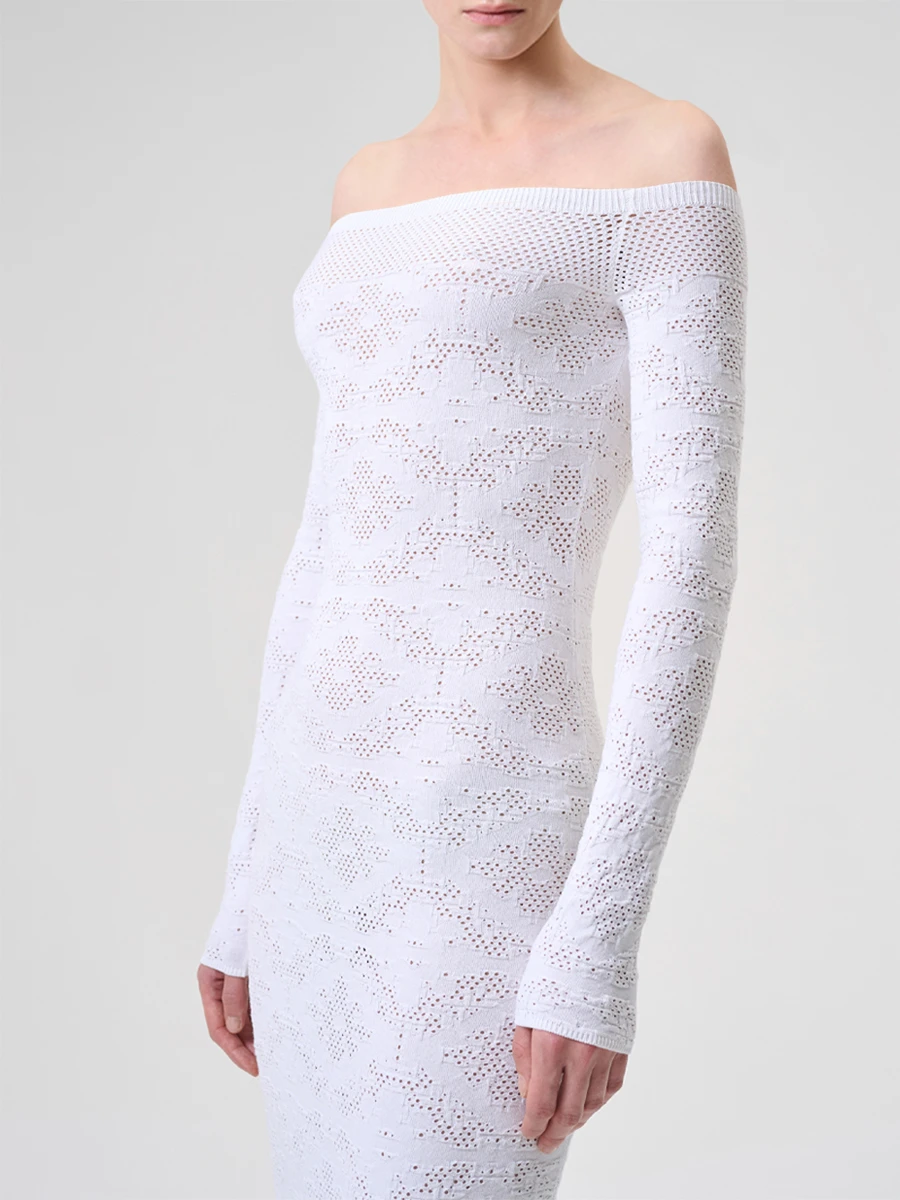 -Белое платье ажурной вязки из смесовой вискозы от CEPHEYA. -Модель полуприлегающего кроя с открытой линией плеч и длинными рукавами. -Эластичный трикотаж превосходно тянется, помогая модели безупречно облегать фигуру, органично подстраиваясь под движения. -Платье подойдет девушкам с размерами с 40 по 44.