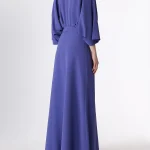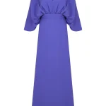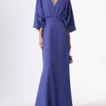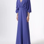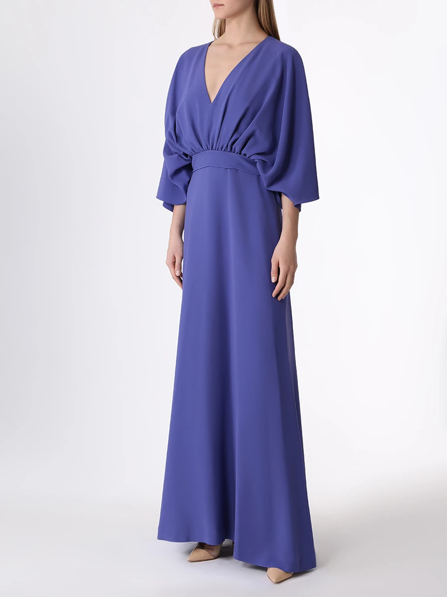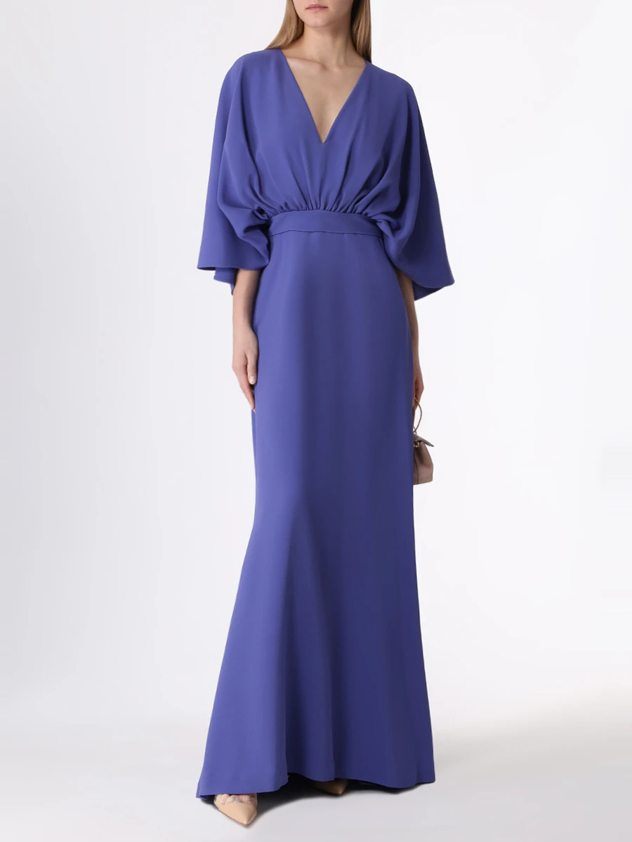 -Сиреневое платье-макси из смесовой вискозы от ELIE SAAB. -Модель приталенного кроя с юбкой А-силуэта, ниспадающими рукавами, V-образным вырезом на груди и застежкой на потайную молнию сзади. -Вечерний образ с платьем гармонично дополнит базовая обувь и миниатюрная сумка.