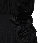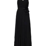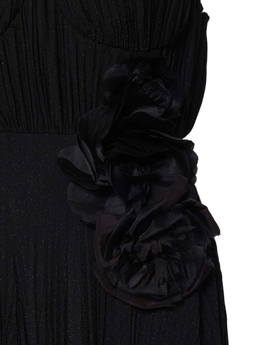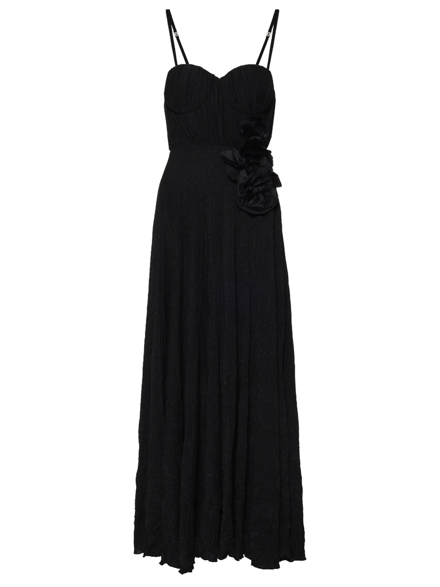 -Черное платье-макси из смесовой вискозы от ELISABETTA FRANCHI. -Модель приталенного кроя с чашечками на узких бретелях и юбкой в пол с крупными складками, придающие силуэту мягкость. -Люрекс придает образу легкий блеск и изысканность. -Аппликация в виде цветка с вышивкой сбоку добавляет уникальности и романтичности.
