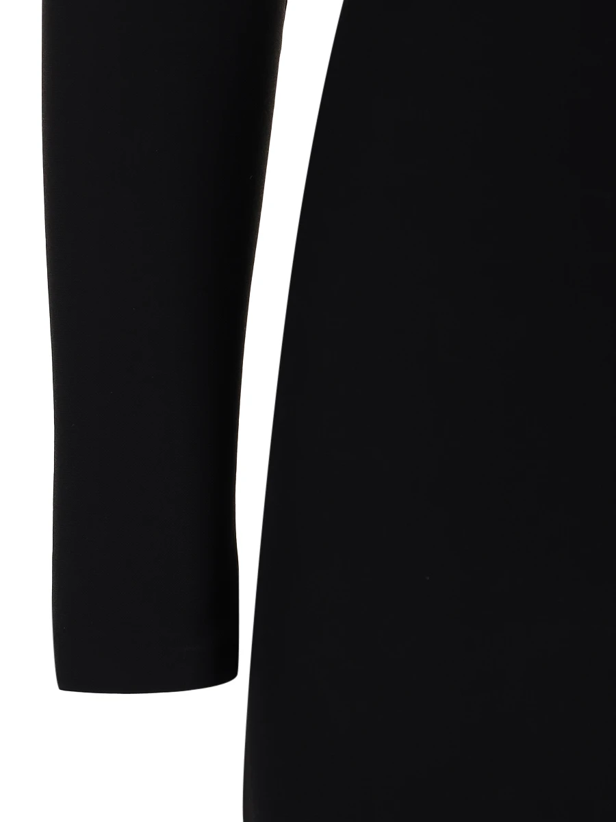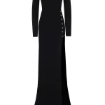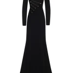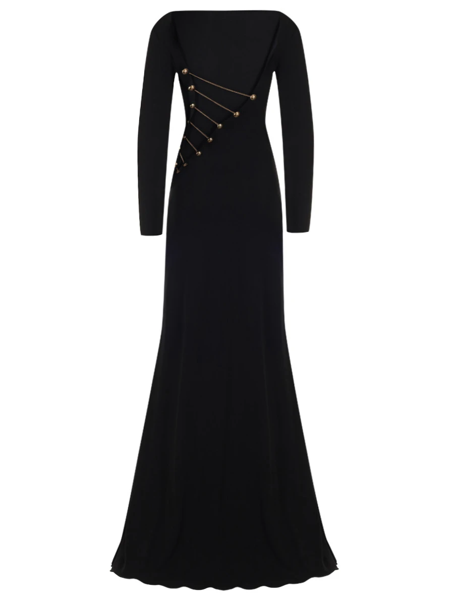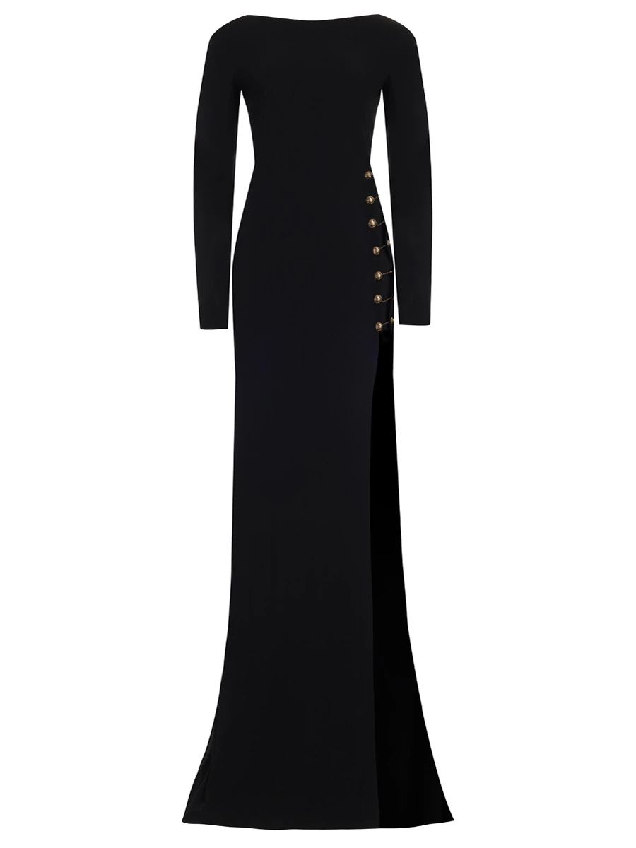 -Черное платье из вискозы от EMILIO PUCCI. -Модель в пол приталенного кроя с длинными рукавами и высоким разрезом до бедра спереди и вырезом на спине, декорированной золотистой металлофурнитурой. -Классические линии кроя платья идеально обрисовывают женственный силуэт.
