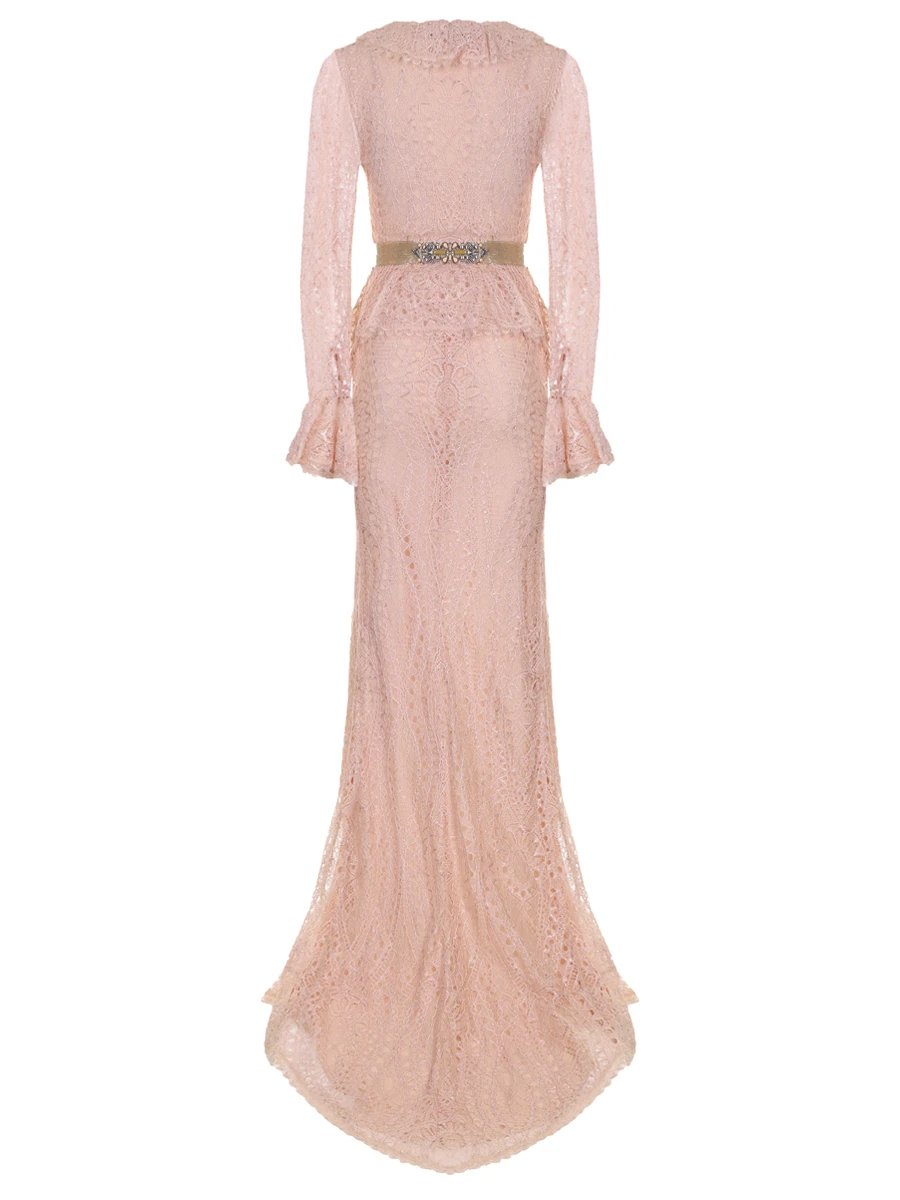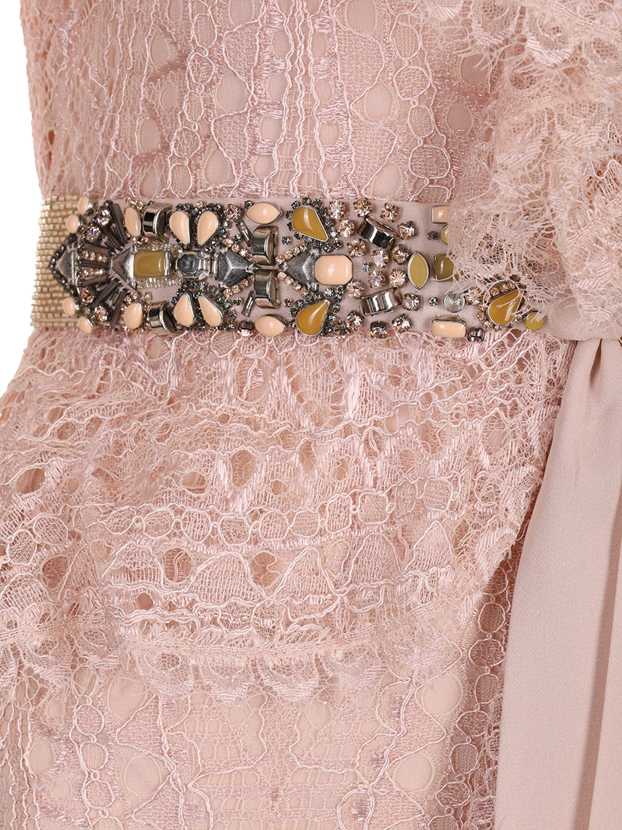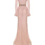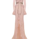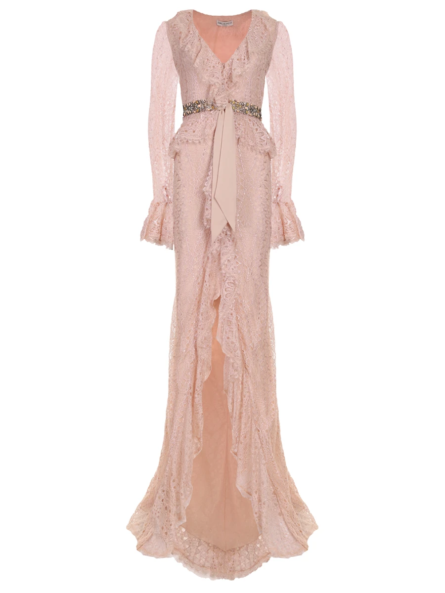 -Бежевое платье из смесовой вискозы от EMILIO PUCCI. -Элегантный и правильный крой с длинными рукавами подчеркнёт достоинства фигуры, а высокий разрез на бедре добавит ноту провокации в паре со смелым глубоким декольте. -Контрастным пояс подчеркнет талию и структуриует силуэт. -Вечерний образ дополнят босоножки на высоком каблуке, сдержанная бижутерия и миниатюрная сумка на плечо.