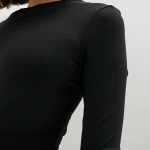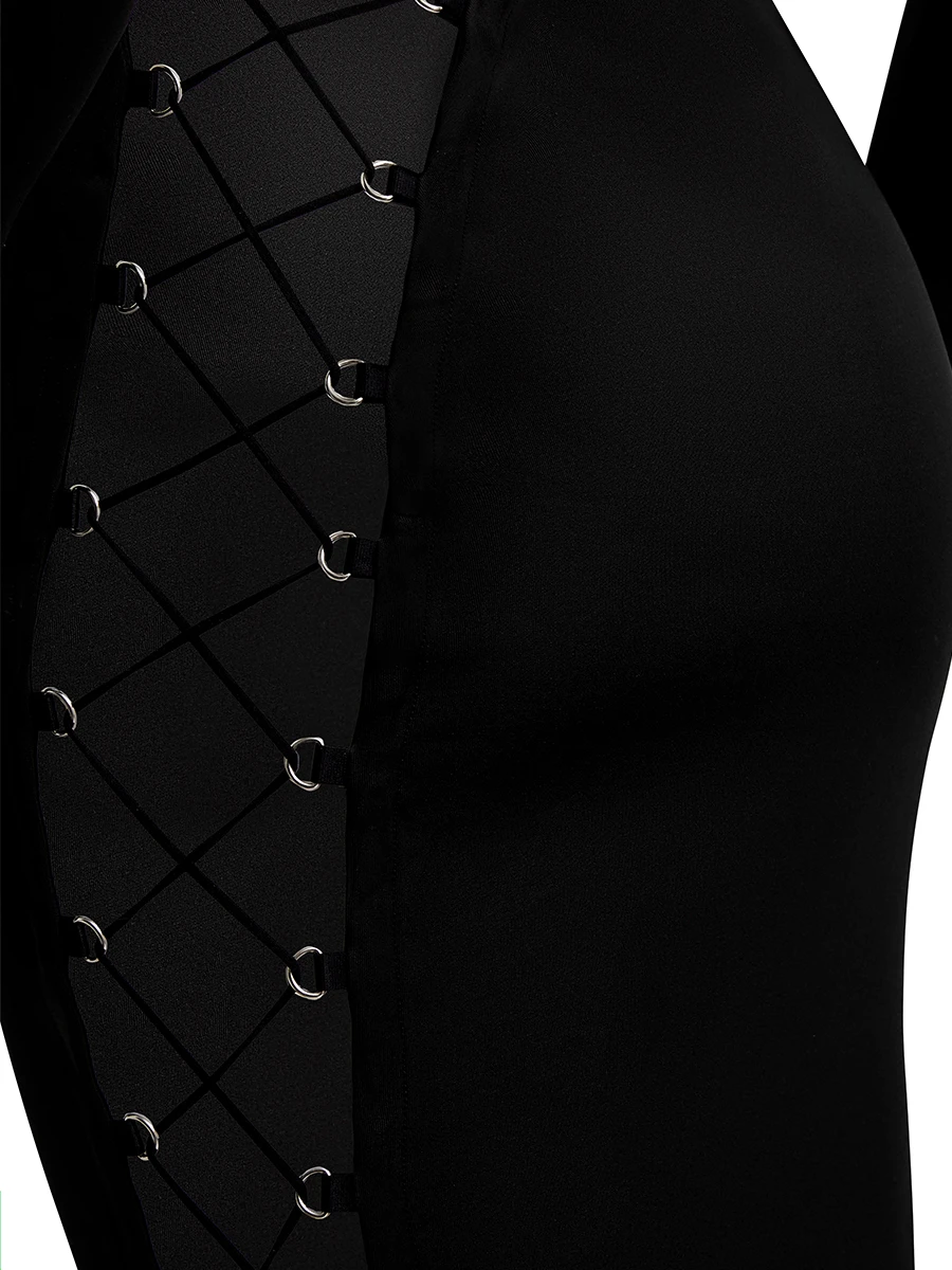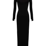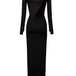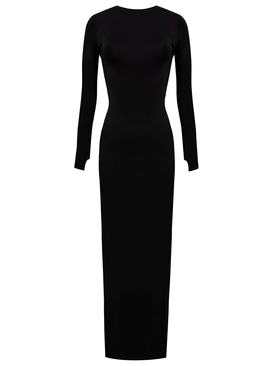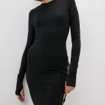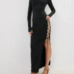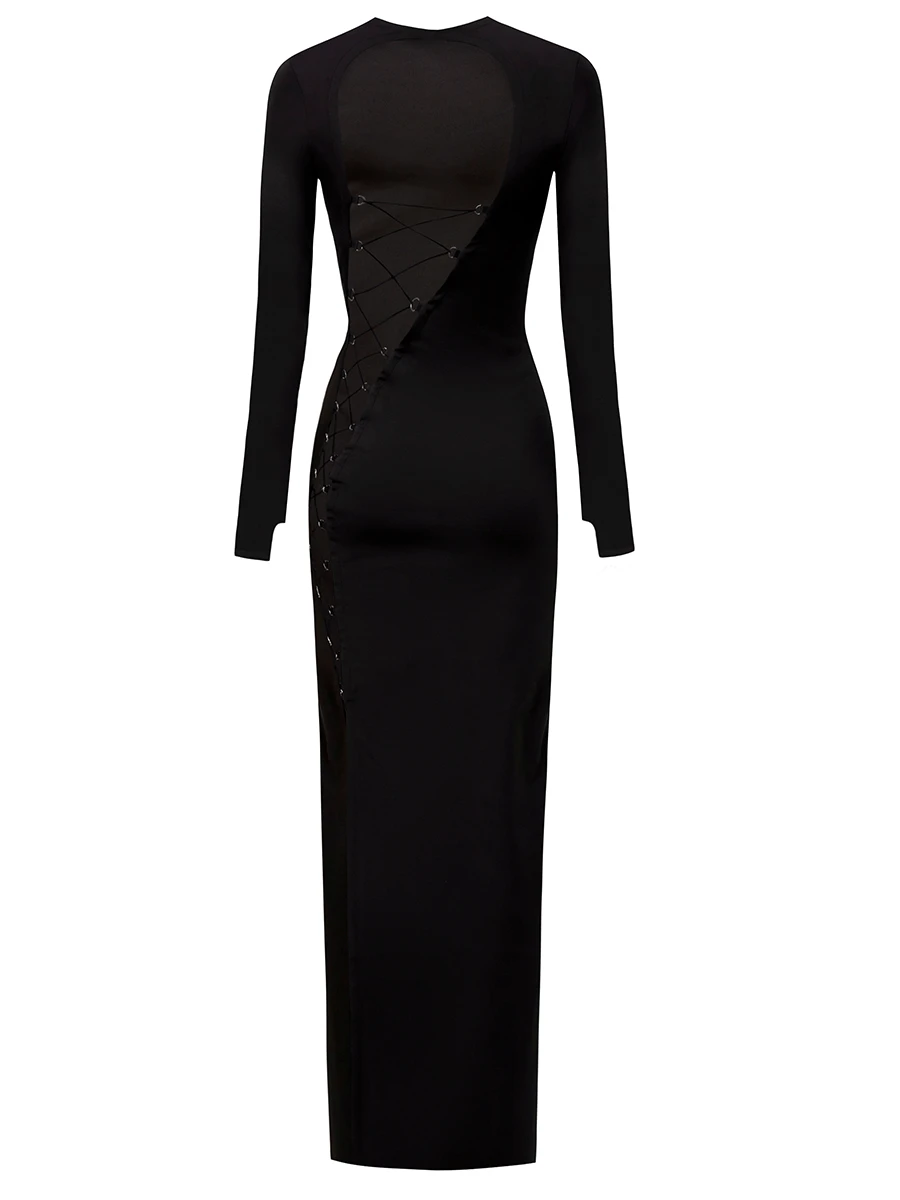 -Черное платье-макси из эластичной смесовой вискозы от LI LAB. -Длинное платье прилегающего силуэта со шнуровкой по спине, переходящей на боковой шов. -Длинные рукава-митенки дополнены прорезью для большого пальца.
