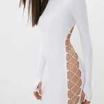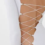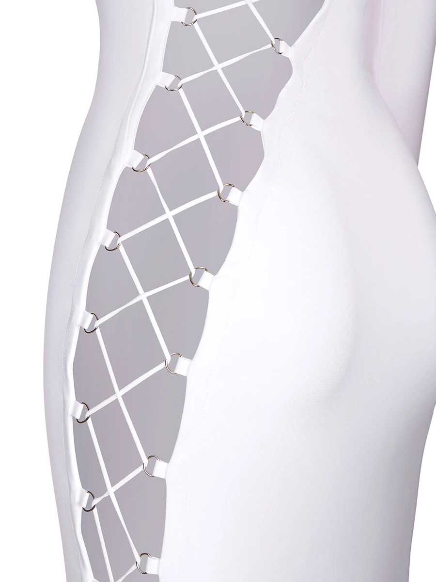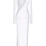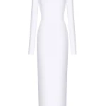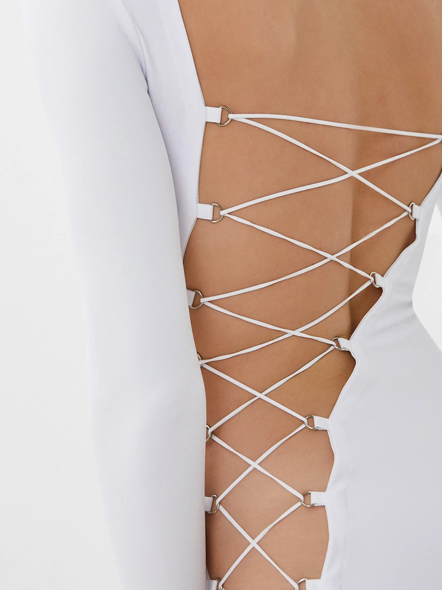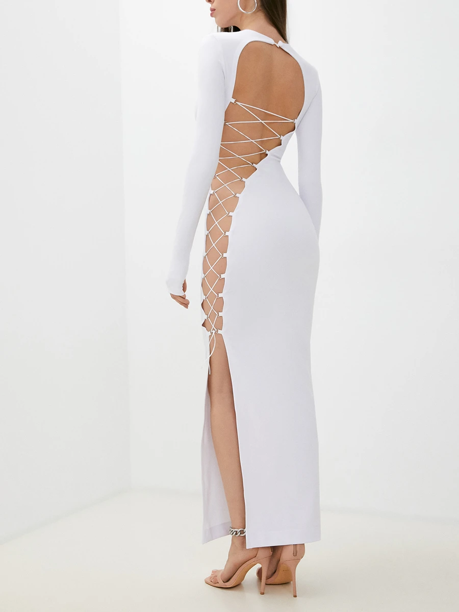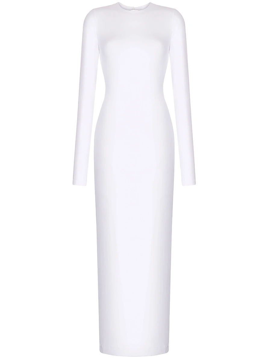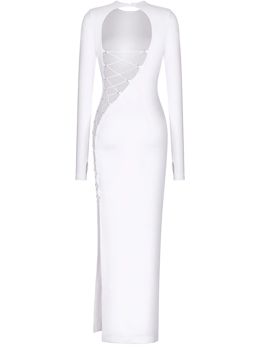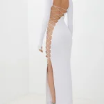 -Белое платье-макси из эластичной смесовой вискозы от LI LAB. -Длинное платье прилегающего силуэта со шнуровкой по спине, переходящей на боковой шов. -Длинные рукава-митенки дополнены прорезью для большого пальца.
