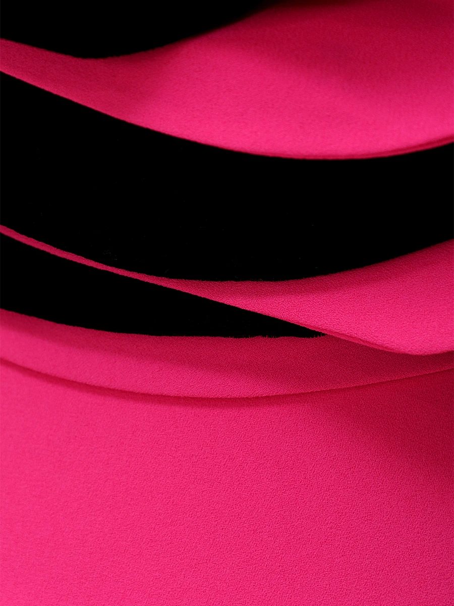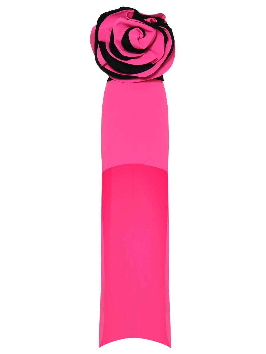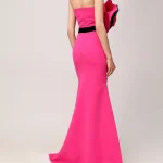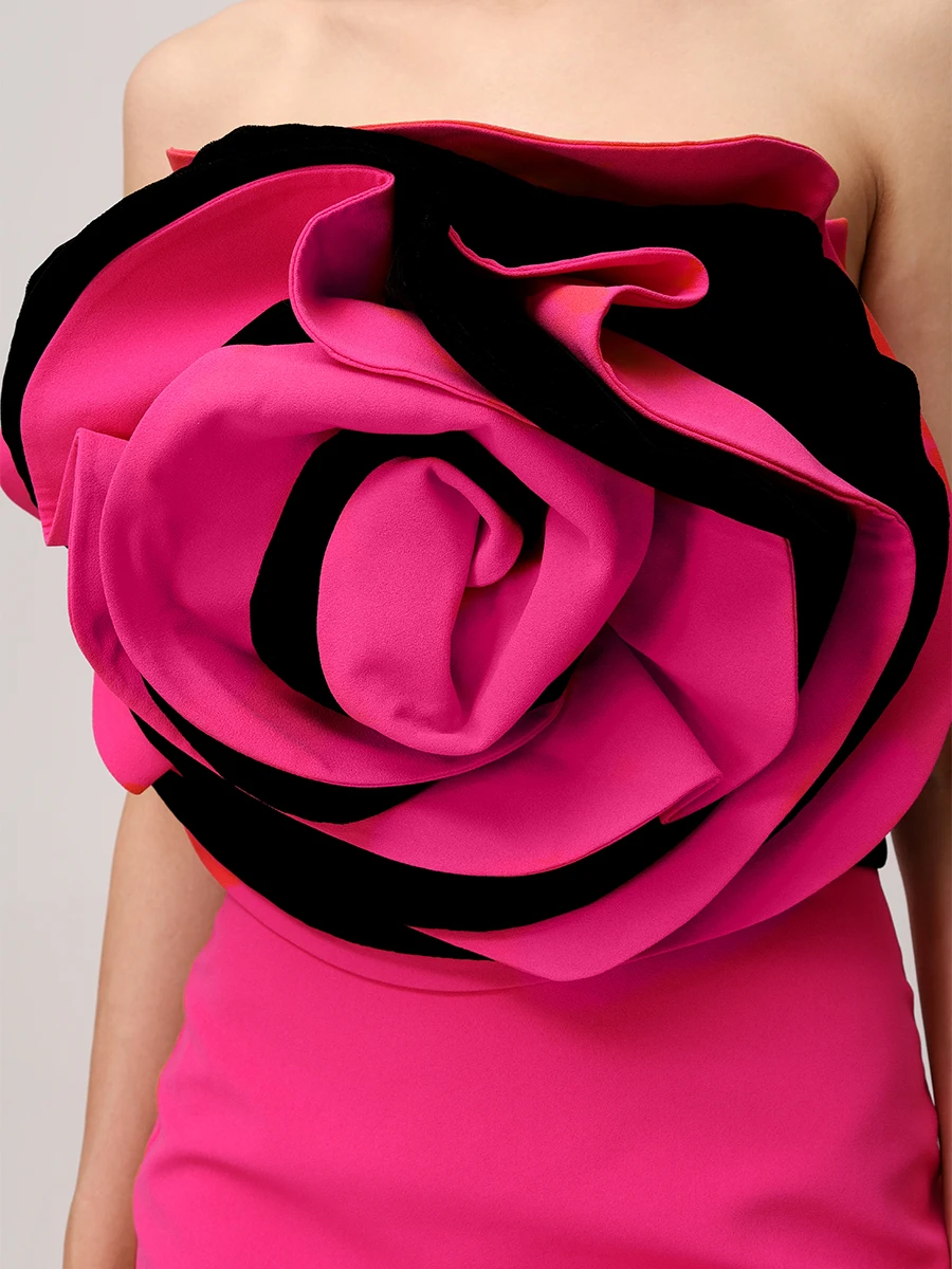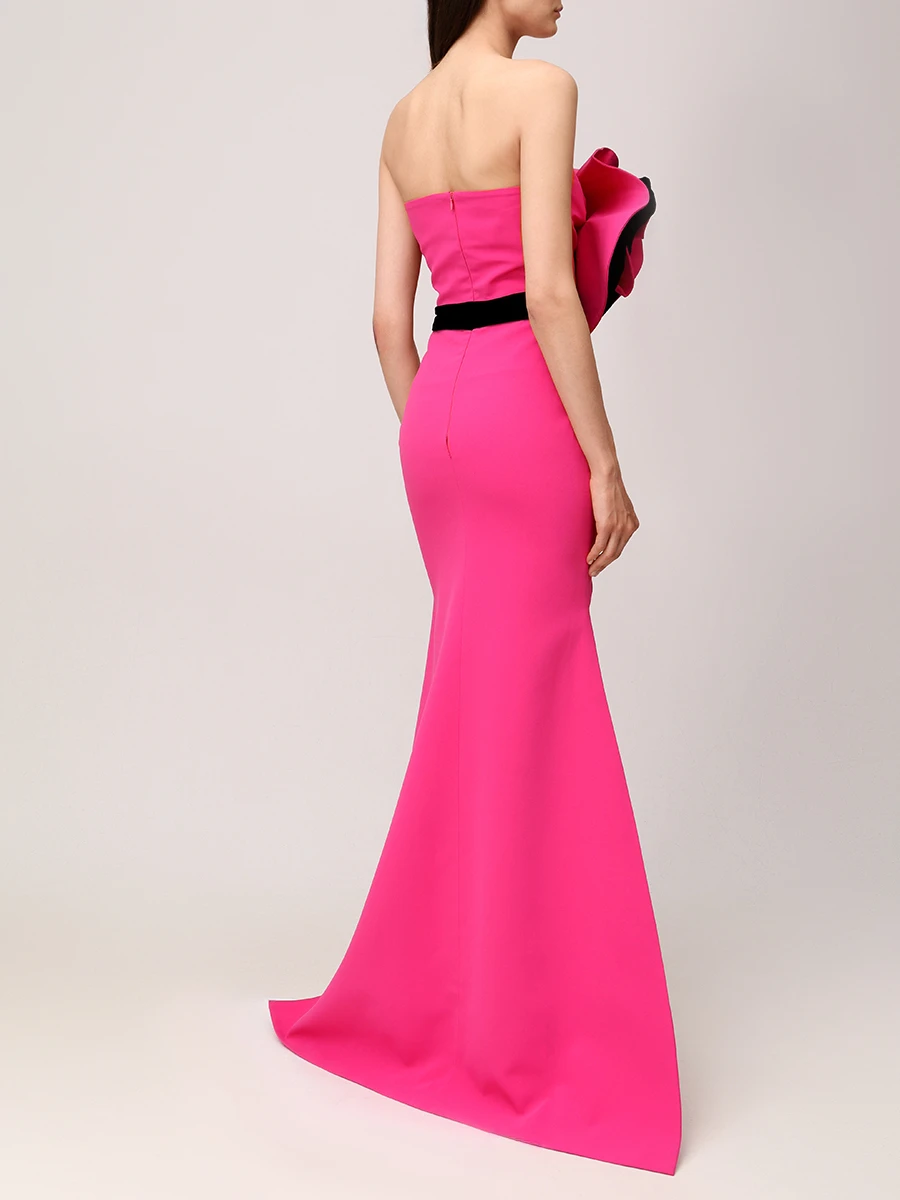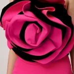-Коллекционное розовое платье из мягкого вискозного крепа от KAMILLA PURSHIE. -Модель облегающего кроя с открытыми плечами, асимметричным подолом со шлейфом, застежкой на потайную молнию и объемной розой на груди с отделкой из черного бархата. -Эффектное платье подчеркнет все достоинства фигуры и превратит каждый выход в незабываемое событие.