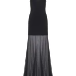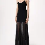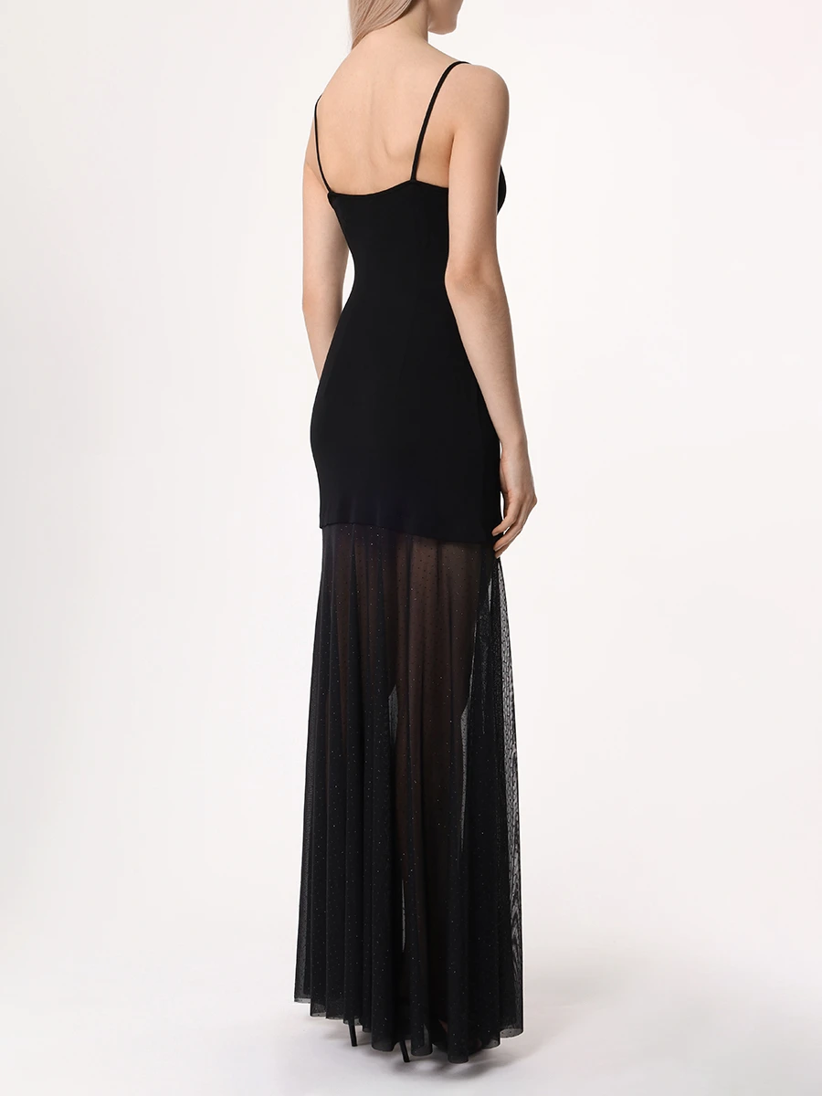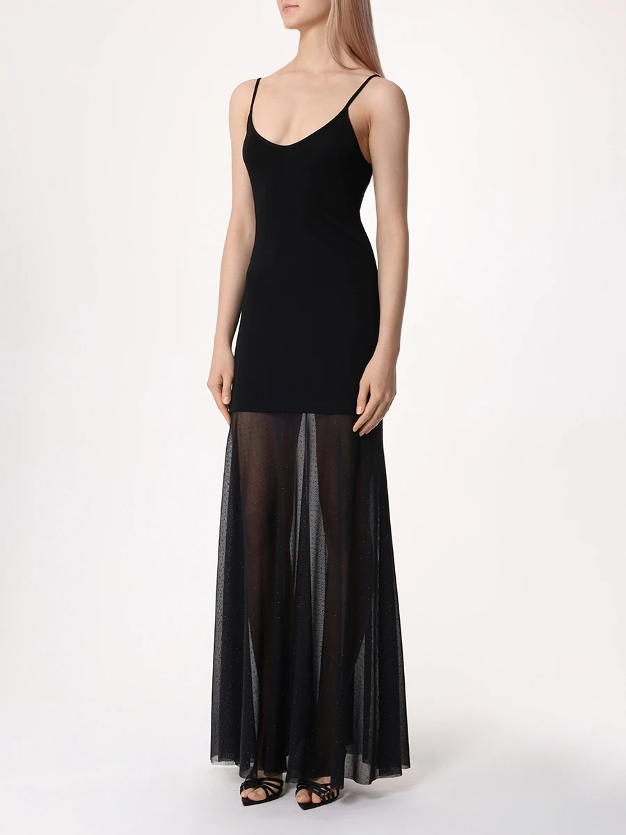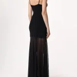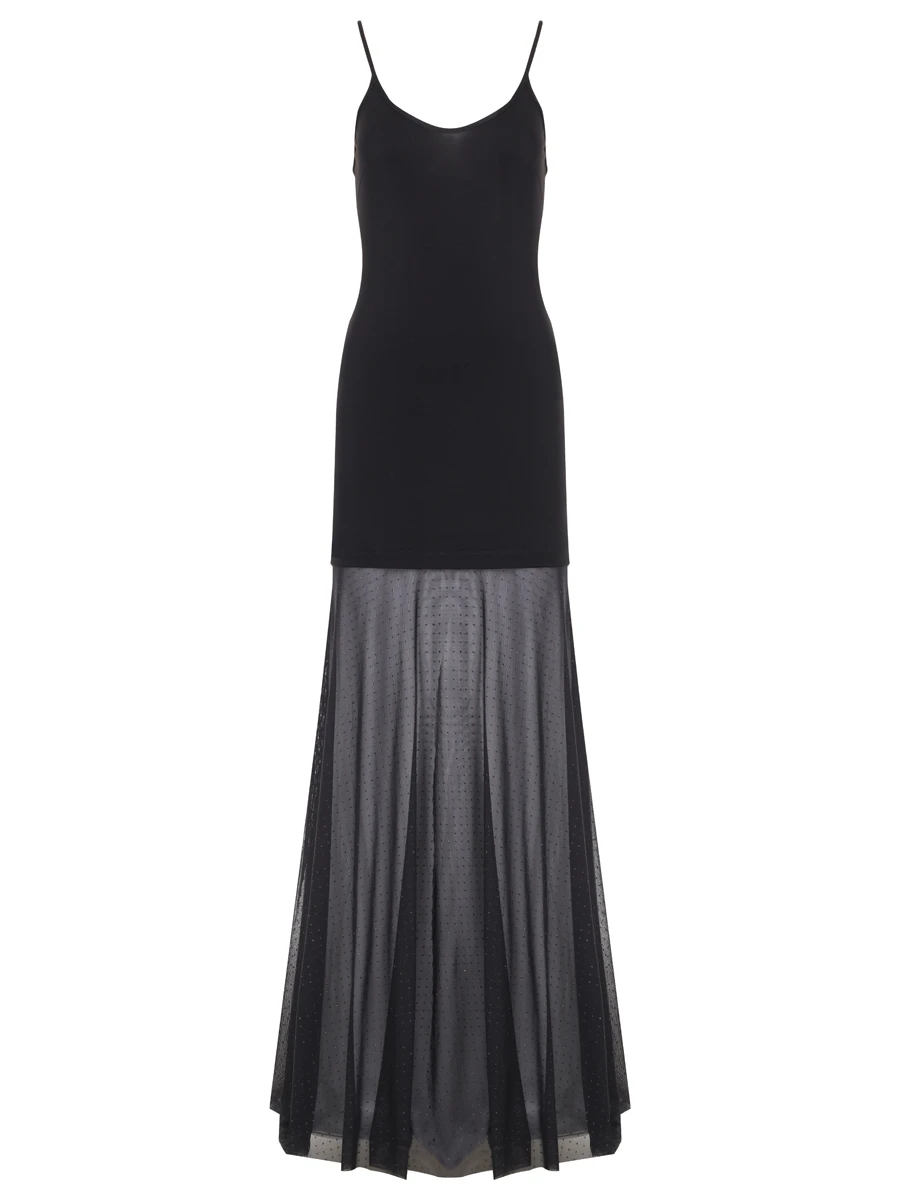 -Черное платье-макси из вискозы от LOST GENOME. -Модель приталенного силуэта с полупрозрачной юбкой клеш создает образ изысканной женственности и легкости и добавляет изделию динамики. -Бретели подчеркивают линию плеч, делая образ еще более утонченным.