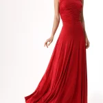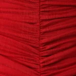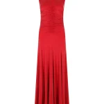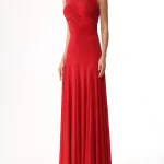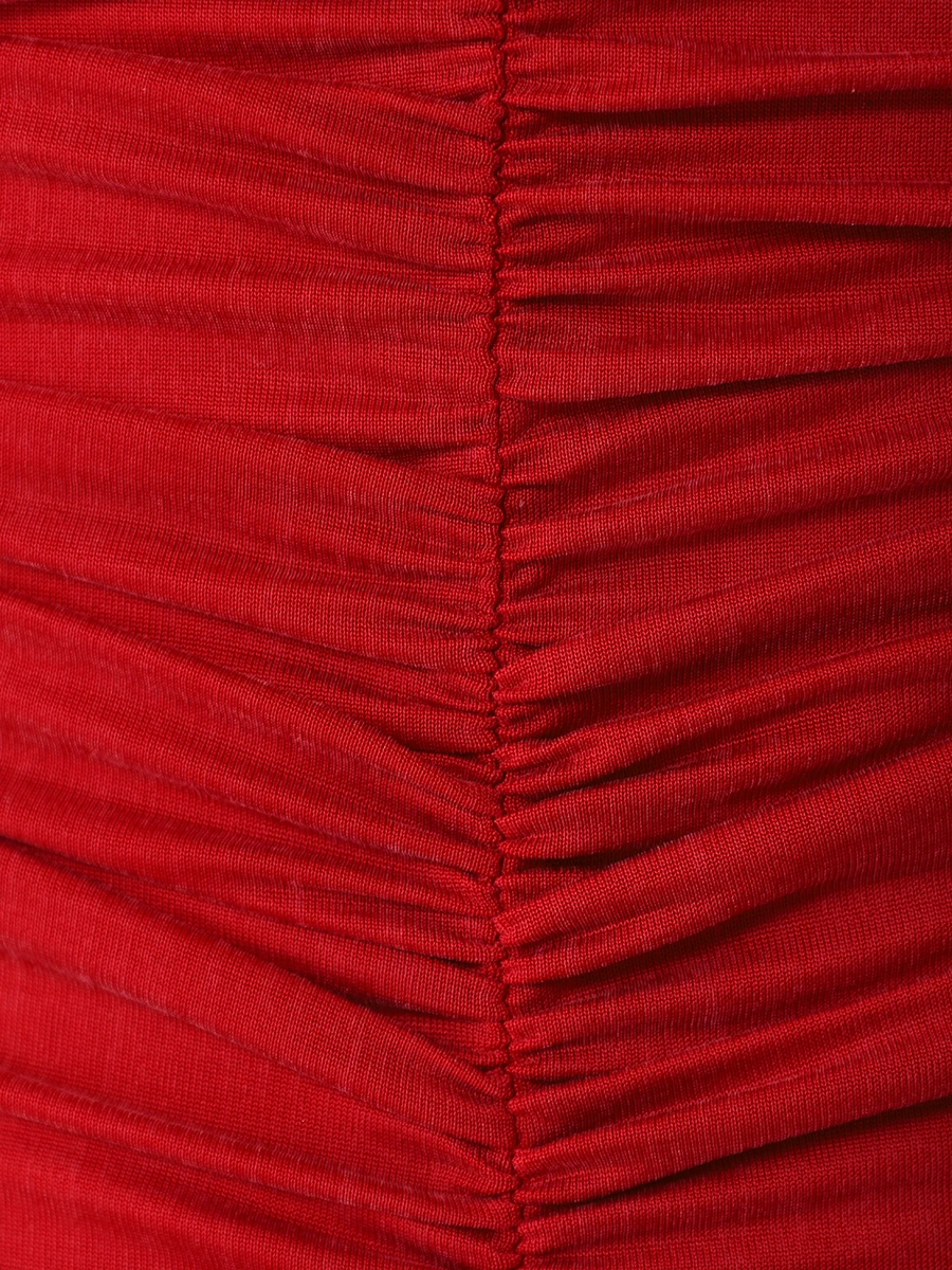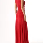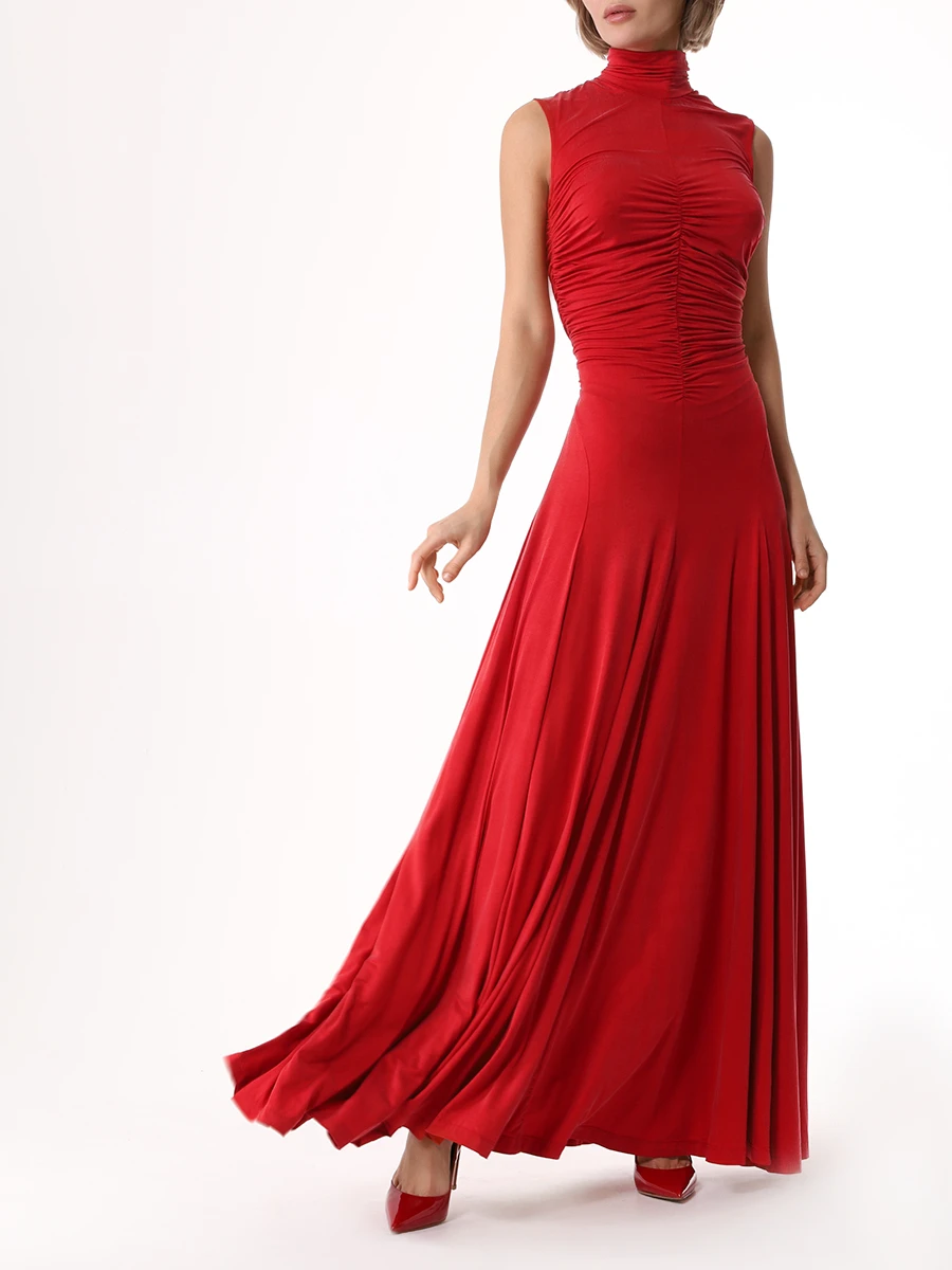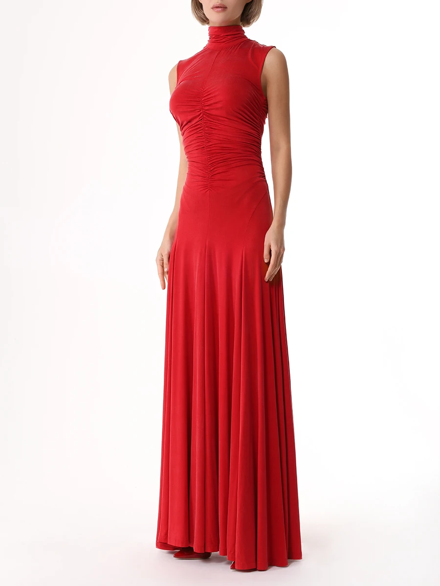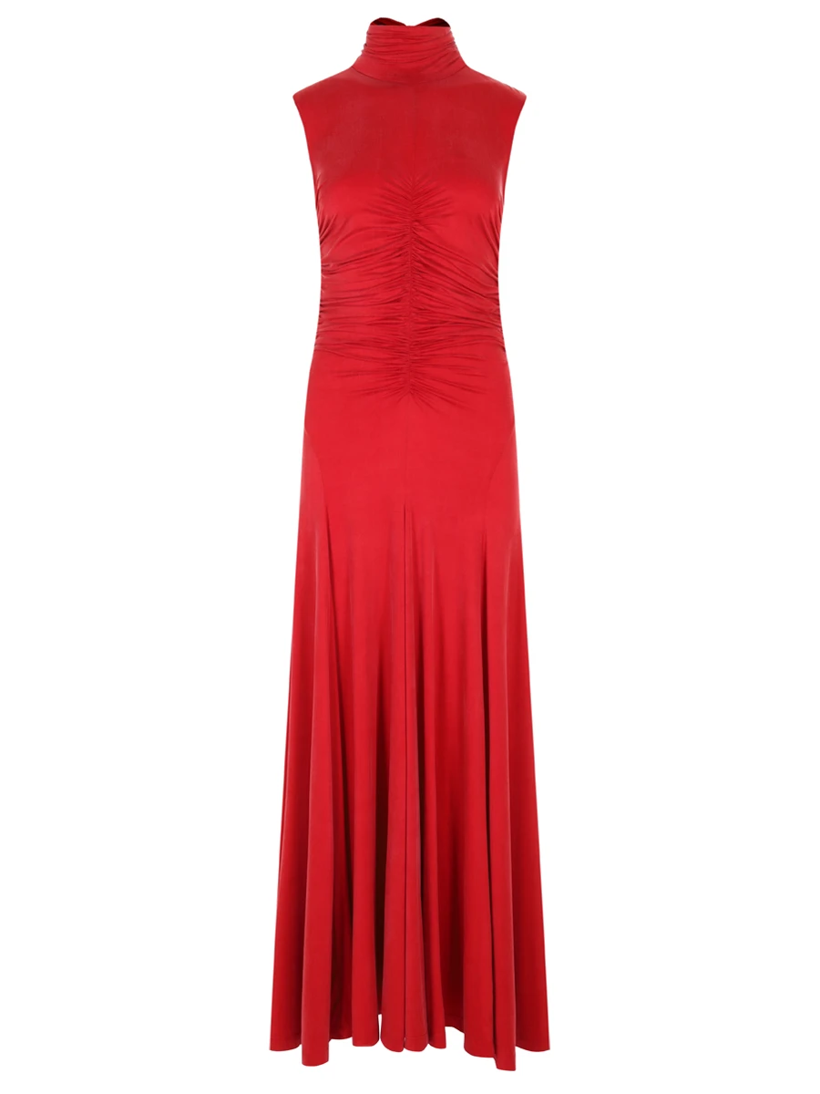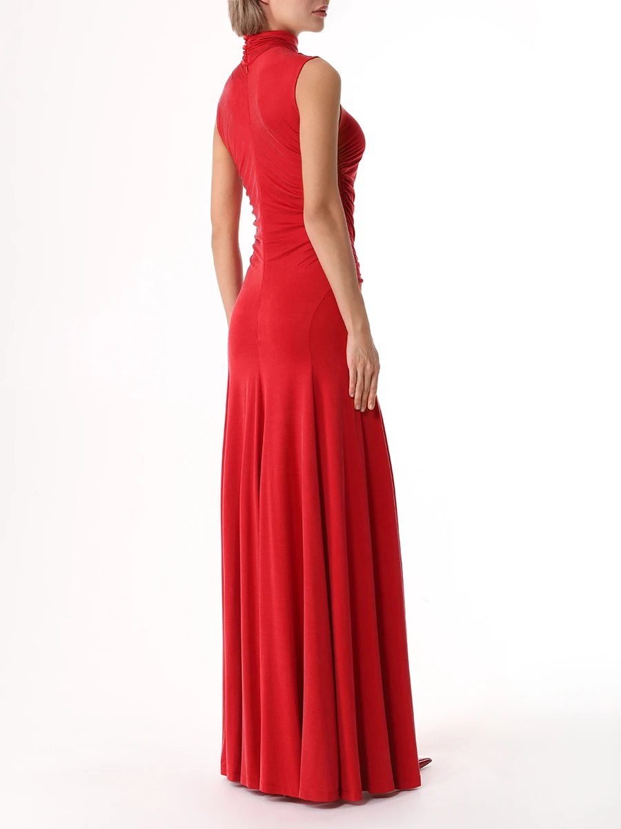 -Красное трикотажное платье из вискозы от LOST GENOME. -Модель облегающего кроя с летящей расклешенной юбкой, американской проймой, высоким воротником со сборкой, густой драпировкой на лифе, фигурными рельефами, подчеркивающими женскую фигуру, застежкой на потайную молнию и пуговицы. -Нежный трикотаж из вискозы хорошо пропускает воздух, не раздражает кожу и придает изделию приятный шелковистый эффект.
