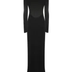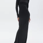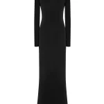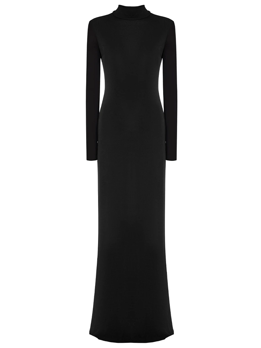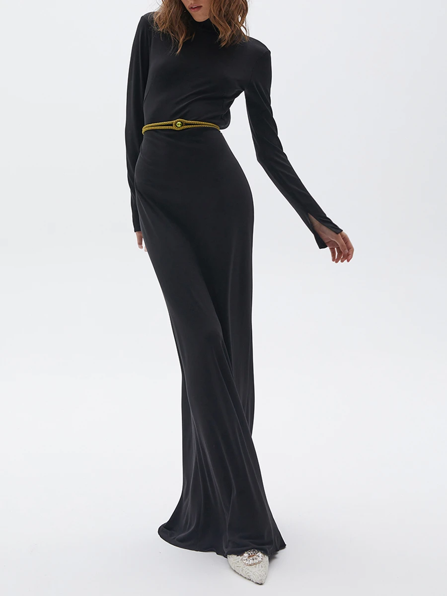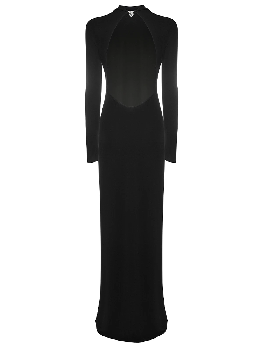 -Черное трикотажное платье из легкой вискозы от MAISON ESVE. -Модель приталенного силуэта с открытой спинкой, длинными рукавами с разрезами и воротником-стойкой. -Платье застегивается с помощью изысканного ювелирного карабина и декоративного элемента из навесной бусины.