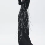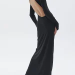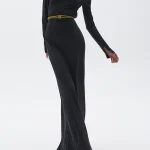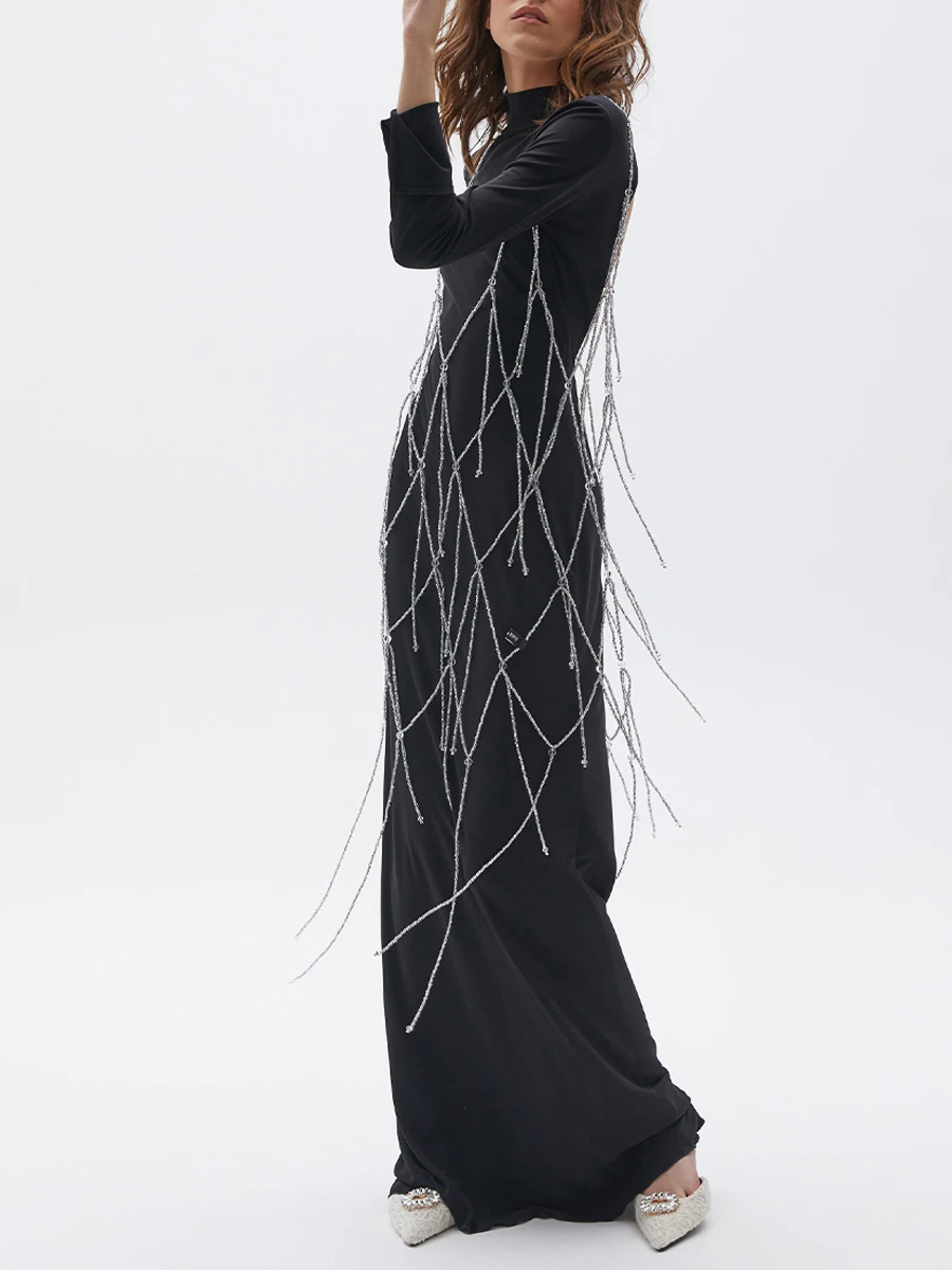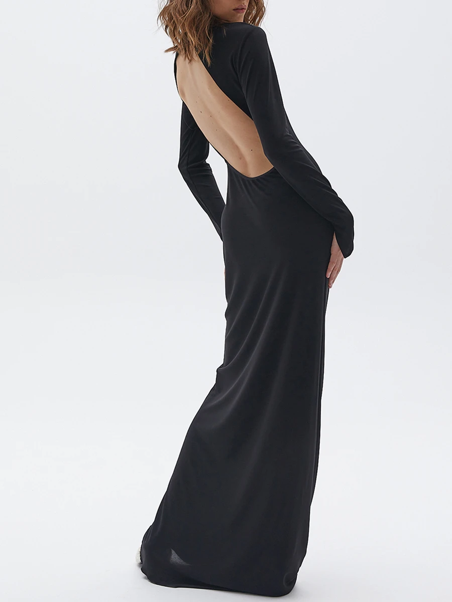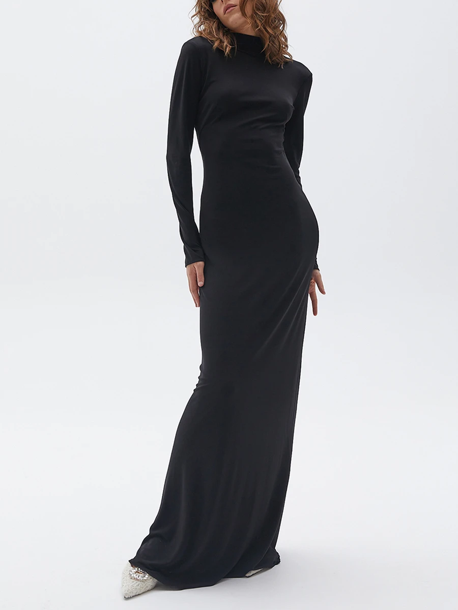 -Черное трикотажное платье из легкой вискозы от MAISON ESVE. -Модель приталенного силуэта с открытой спинкой, длинными рукавами с разрезами и воротником-стойкой. -Платье застегивается с помощью изысканного ювелирного карабина и декоративного элемента из навесной бусины.