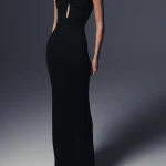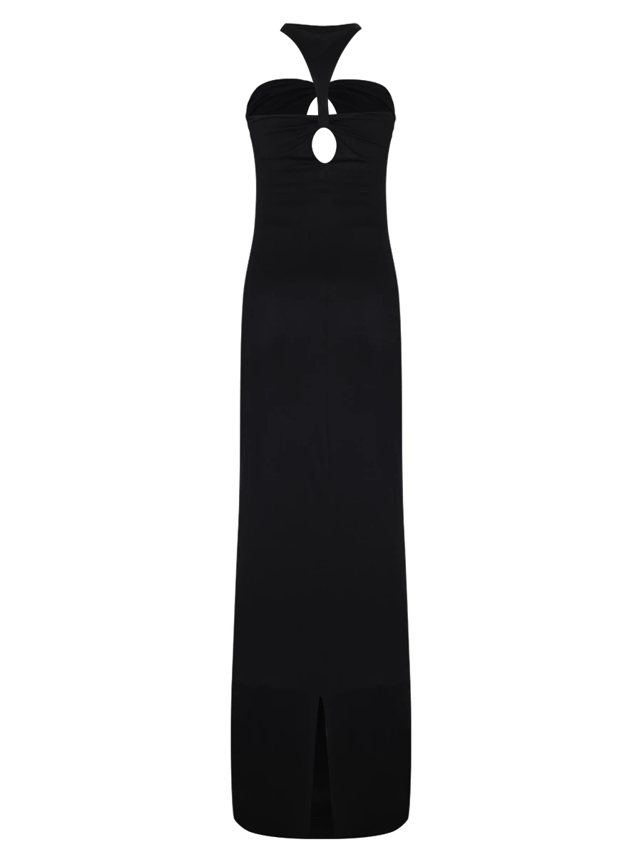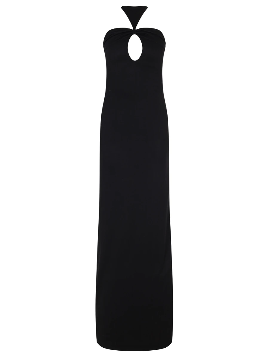 -Черное платье-халтер из вискозы от MASTERSUIT. -Модель приталенного силуэта с фигурным декольте и каплевидными вырезами спереди и на спинке, невысоким разрезом сзади. -Классические линии кроя платья идеально обрисовывают женственный силуэт. Возможен индивидуальный пошив. Стоимость согласовывается отдельно.