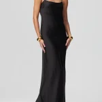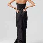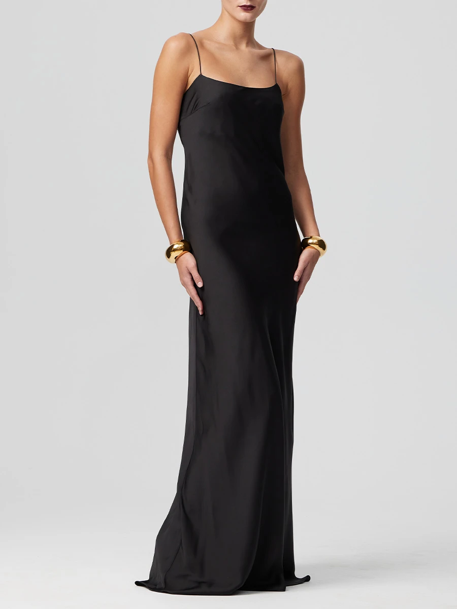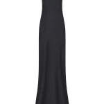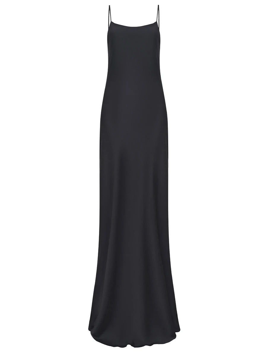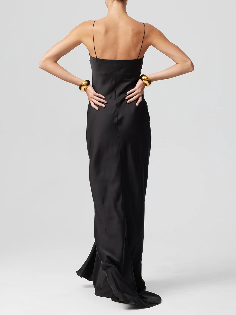 -Черное платье-макси выполнено из премиального шелка. -Изысканный приталенный силуэт и тонкие бретельки подчеркивают утонченность. -Аккуратные вытачки по переду структурируют силуэт, а глубокий вырез раскрывает женственность. -Роскошный шлейф и безупречная обработка низа.