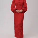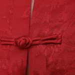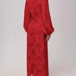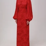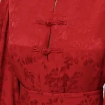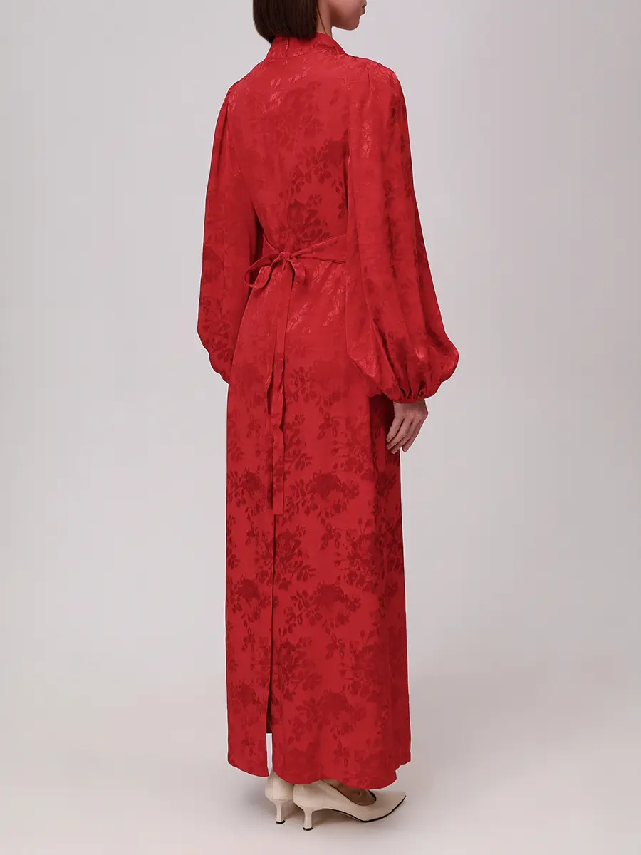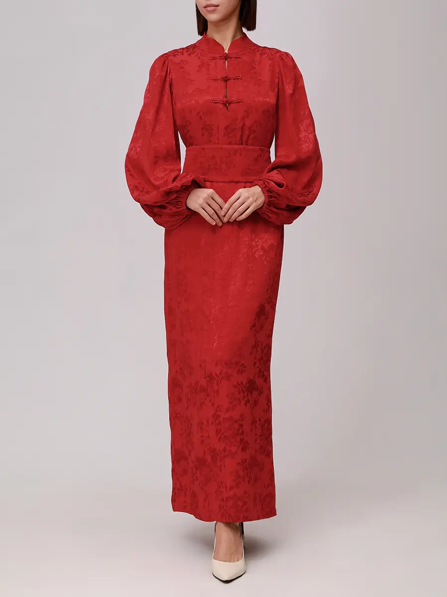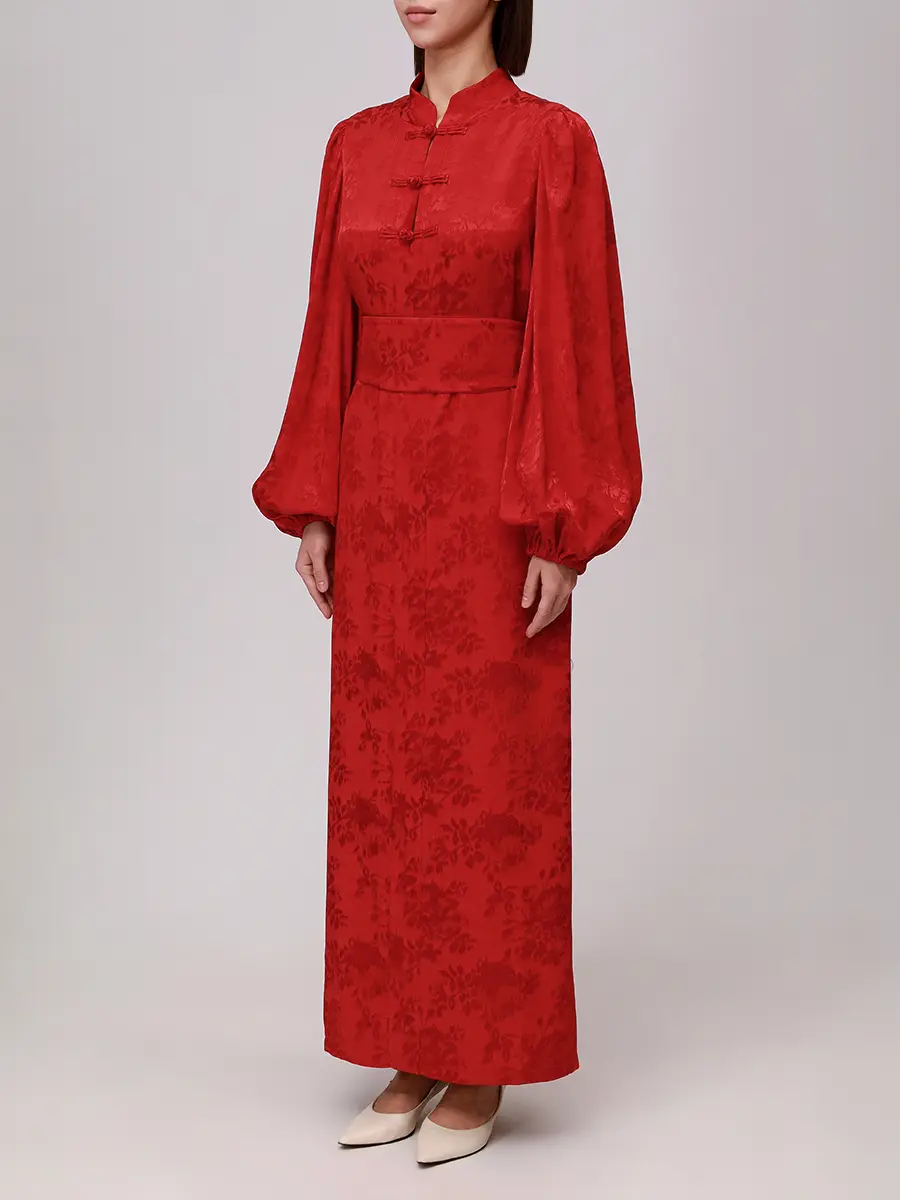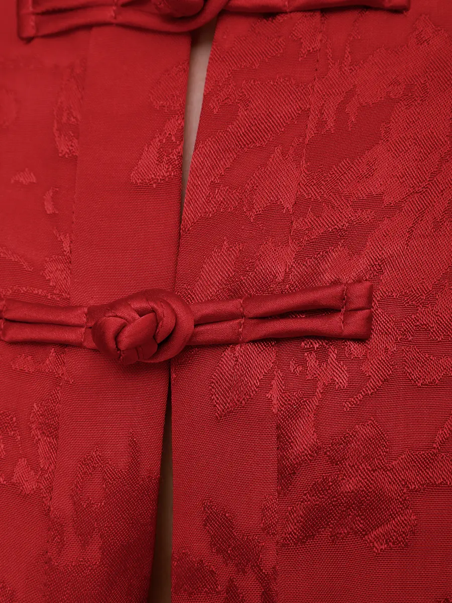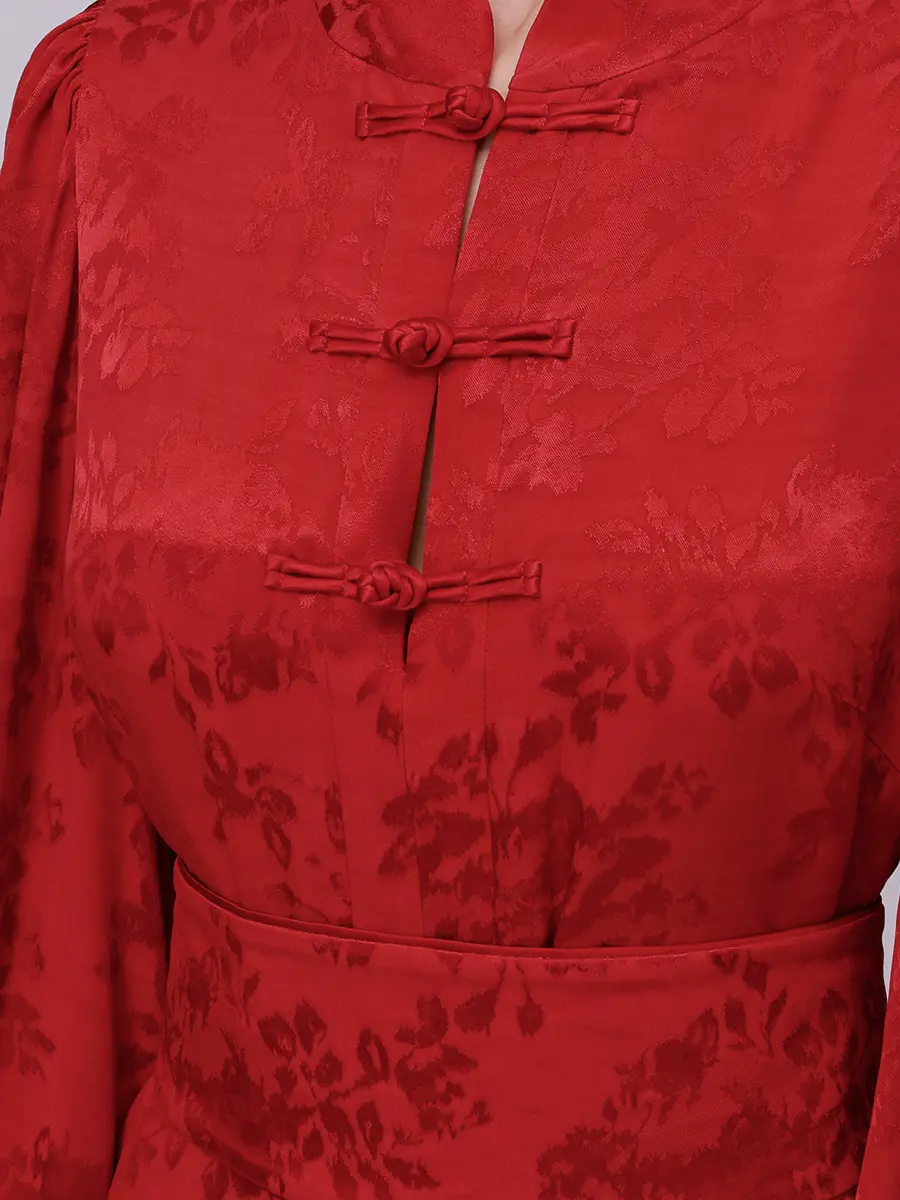 -Красное элегантное платье из жаккарда купажированного состава от OLOLOL. -Модель с отрезным силуэтом, выполненная в восточной эстетике. -Изысканный узор-«розы», воротник-стойка и декоративная планка с пуговицами ручной работы подчеркивают лаконичный крой, создавая яркий образ для особых случаев.