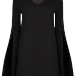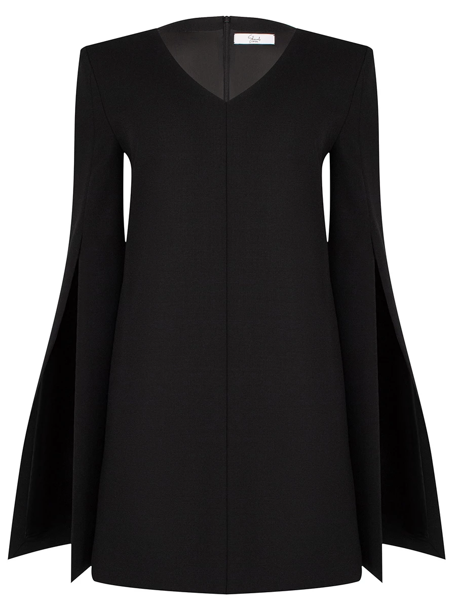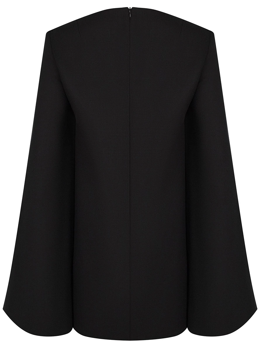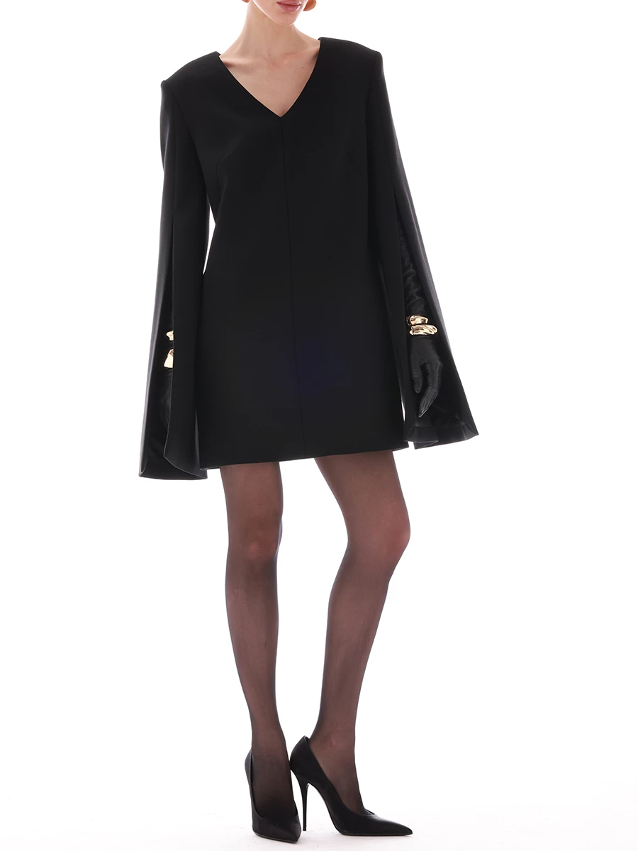 -Черное изысканное платье-кейп кутюрной коллекции из тонкой смесовой шерсти от SHERVARLI OFFICIAL. -Модель олицетворяет в себе элегантную роскошь, способную стать акцентным предметом Вашего гардероба. -Длина мини, вытачки, подчеркивающие линию груди, оригинальный крой рукава создают из платья благородный арт-объект.