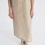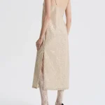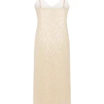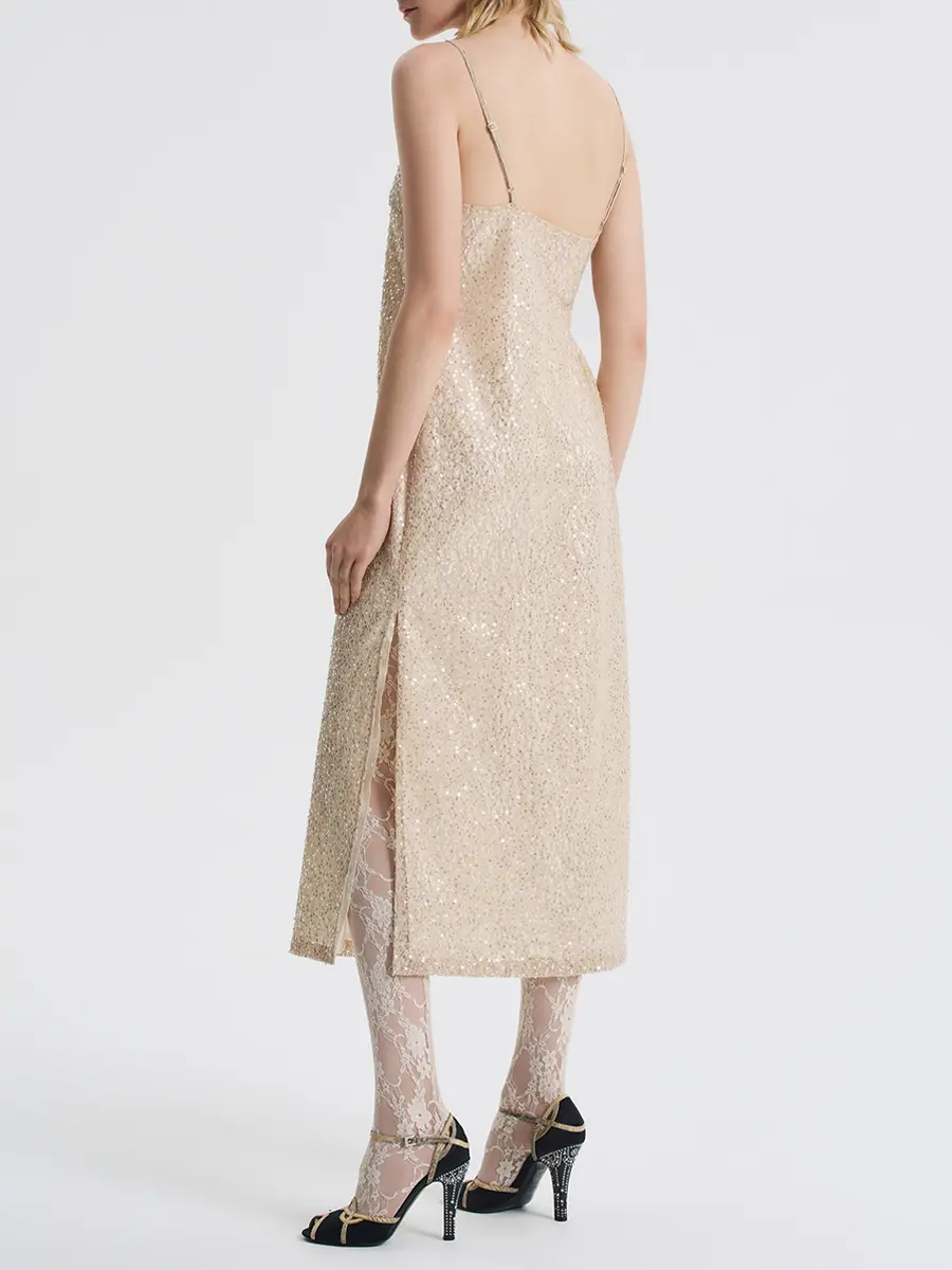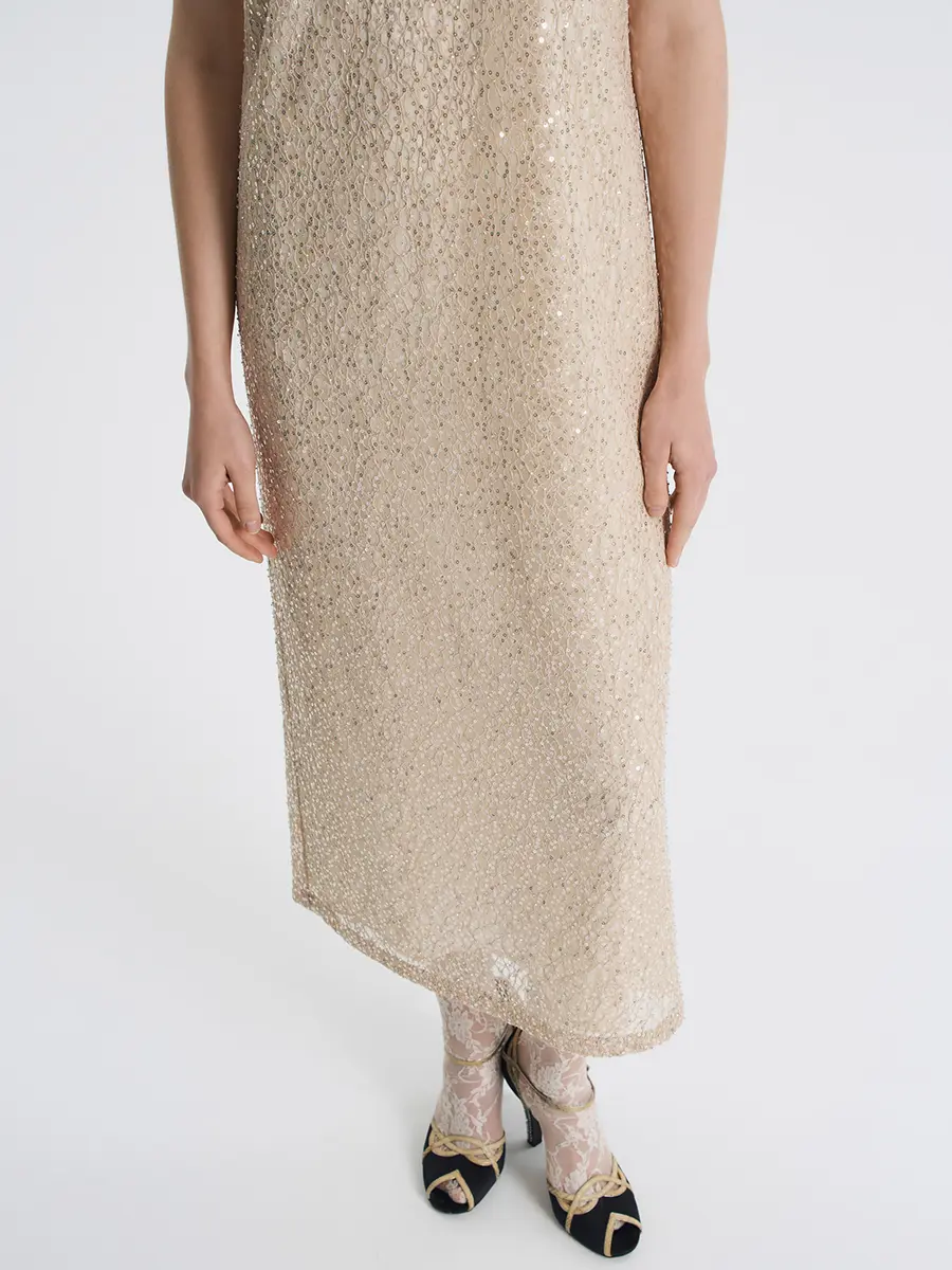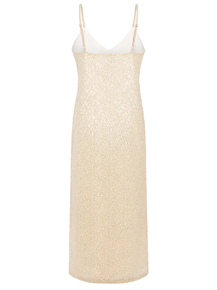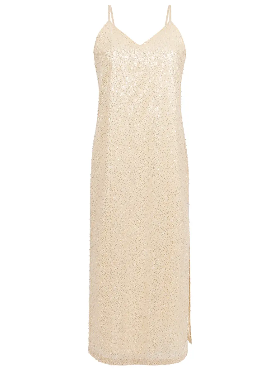 -Платье-комбинация в бежевом цвете, расшитое пайетками от FASHION REBELS. -В вашу коллекцию драгоценностей: платье-комбинация из ткани, расшитой бисером и пайетками. -Поверхность деликатно блестит и переливается, создавая эффект роскошного сияния под светом софитов. -Прямой крой с боковым разрезом и регулируемые бретели подчеркнут элегантность, а отлетная подкладка гарантирует комфорт. -Платье ручной работы.