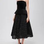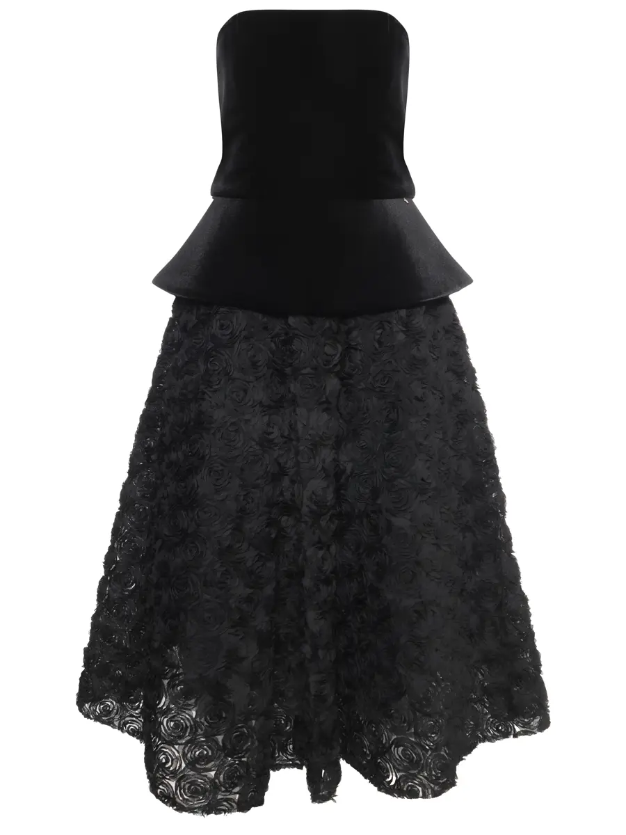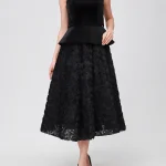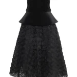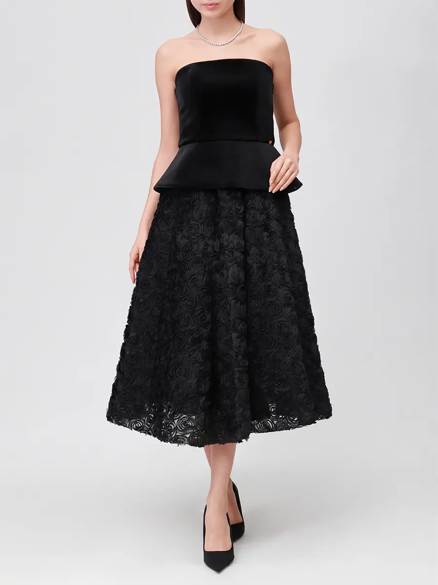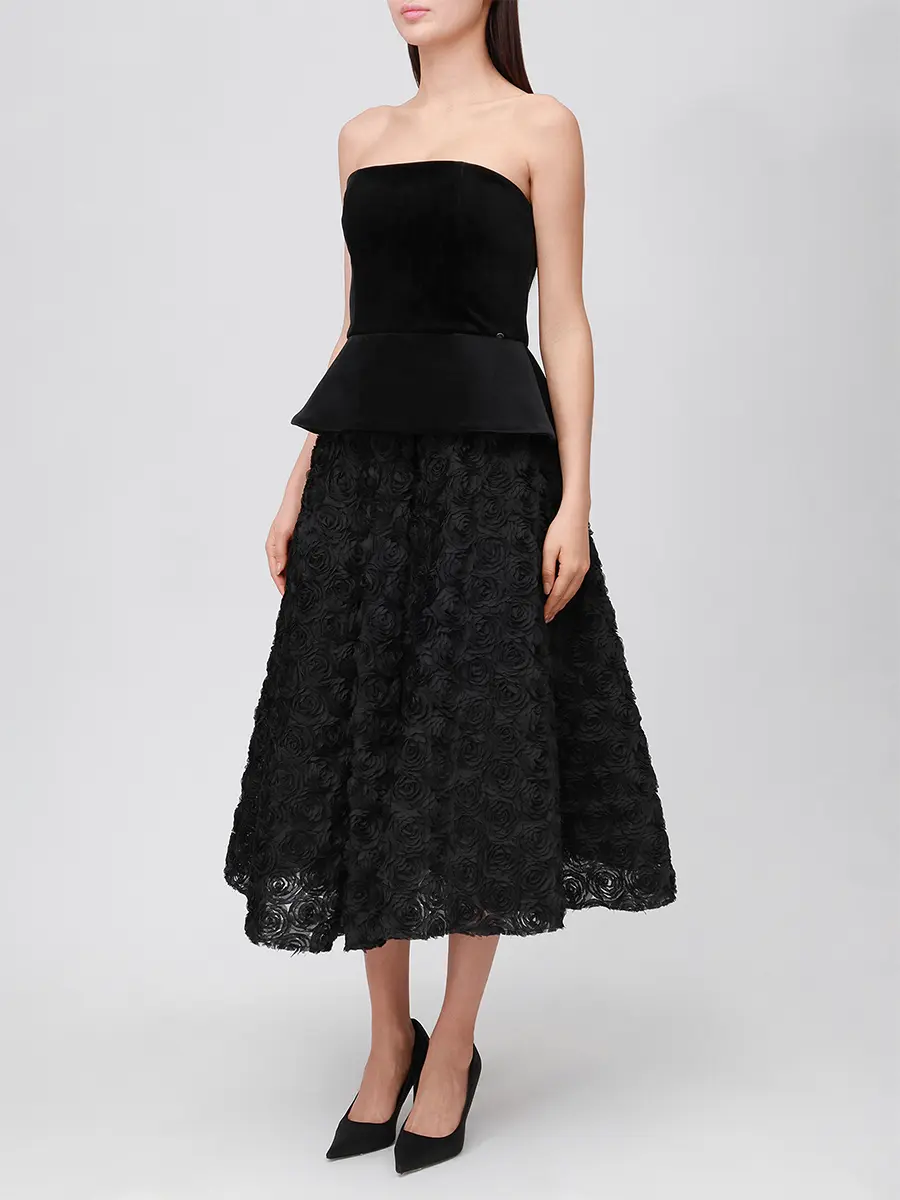 -Черное комбинированное платье от NISSA. -Модель приталенного силуэта с баской и расклешенной объемной юбкой, расшитой лепестками, открытой линией плеч и шнуровкой на спинке. -Эффектное платье мгновенно притягивает взгляды, идеально садится по фигуре и дарит ощущение праздника с первого взгляда.