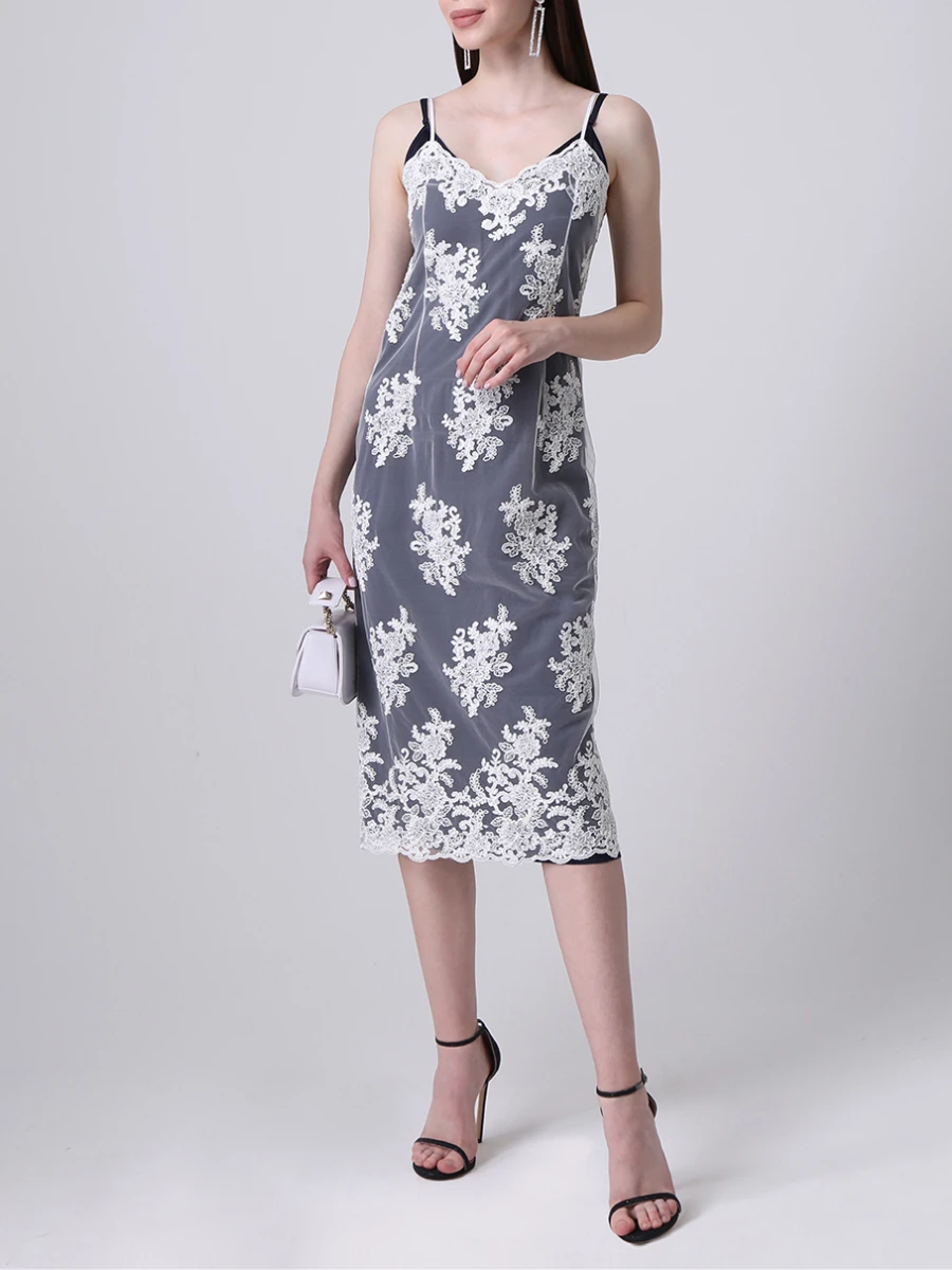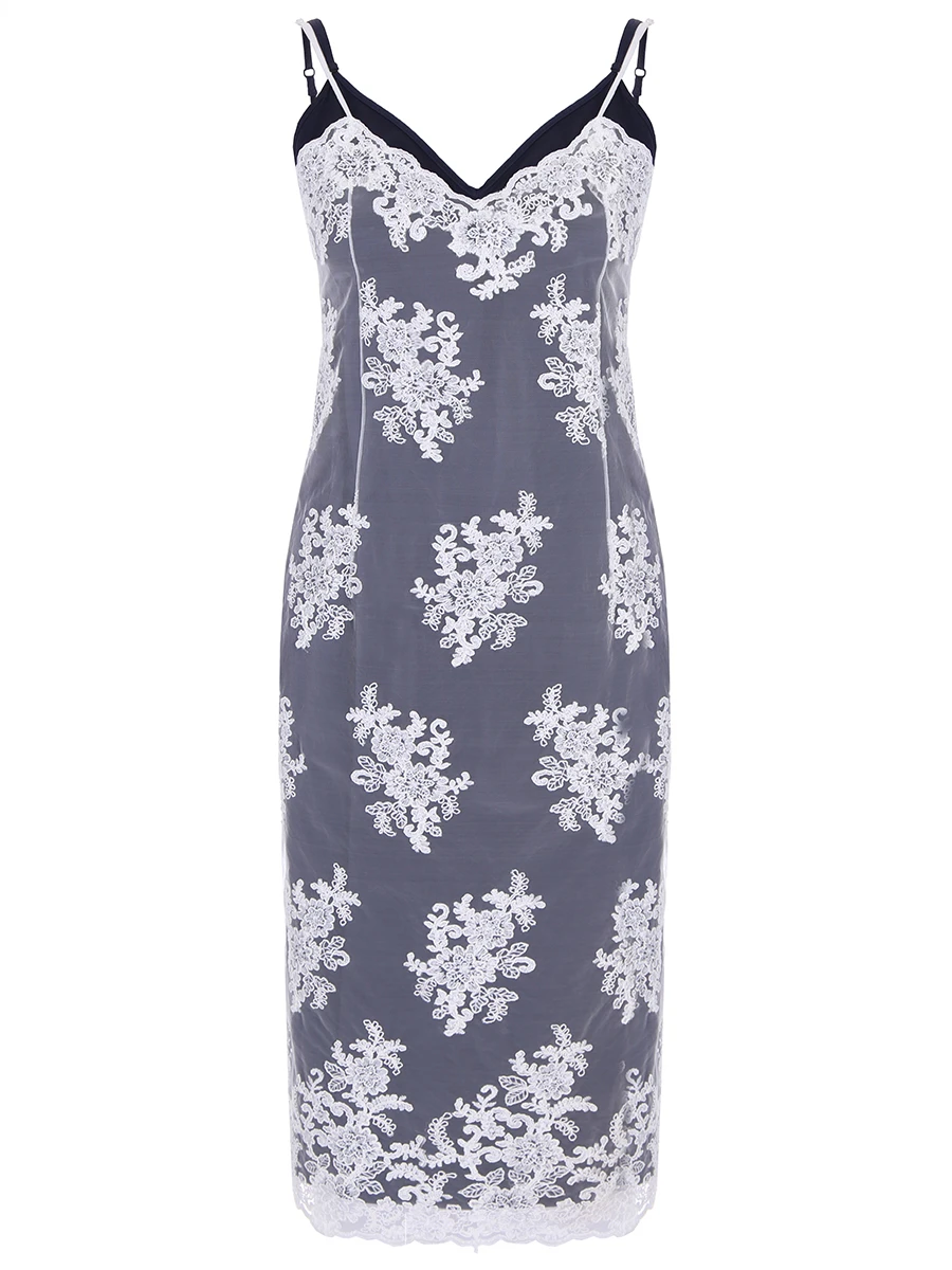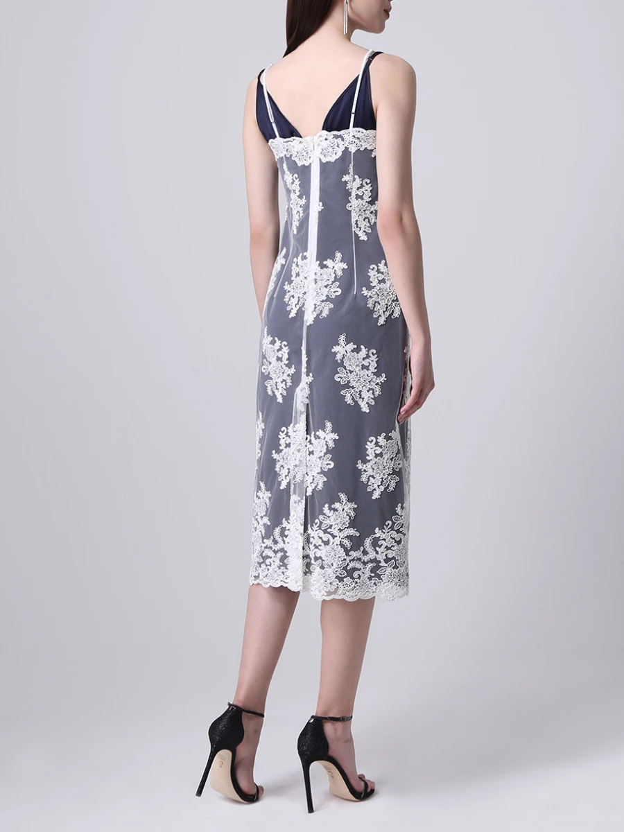 -Оригинальное платье в бельевом стиле от GRAVITEIGHT. -Базовое нижнее платье из шелка синего цвета с логотипом, верхнее платье из изящного кружевного полотна белого цвета, узкие регулируемые бретели, длина миди.