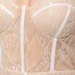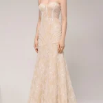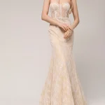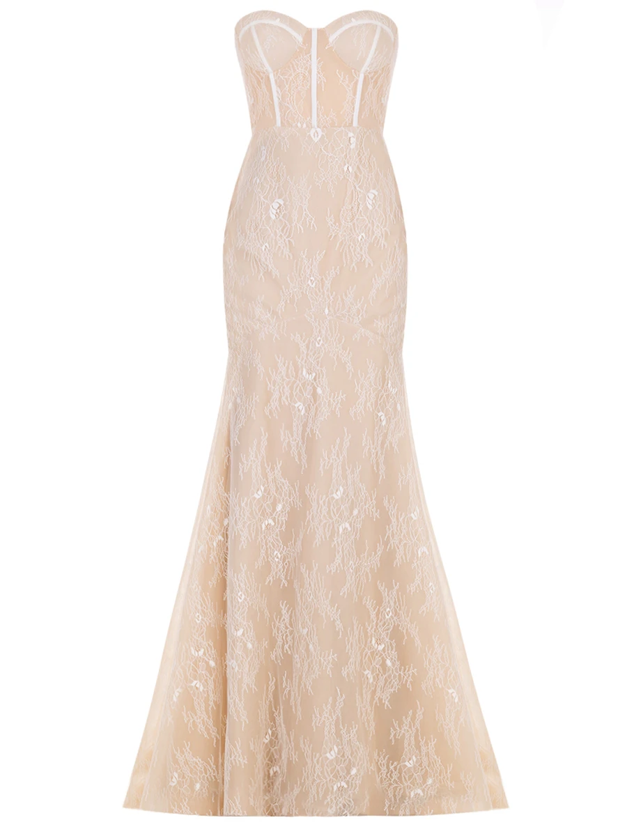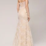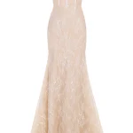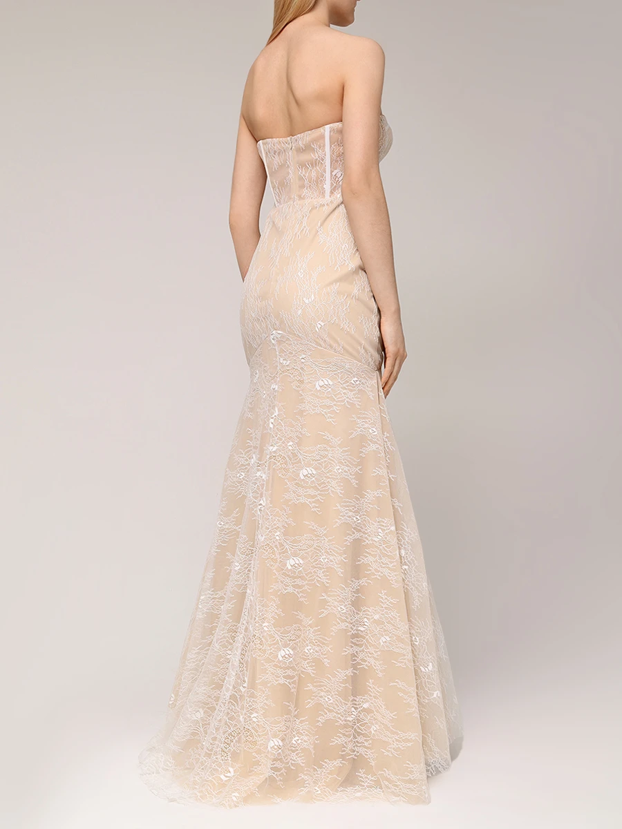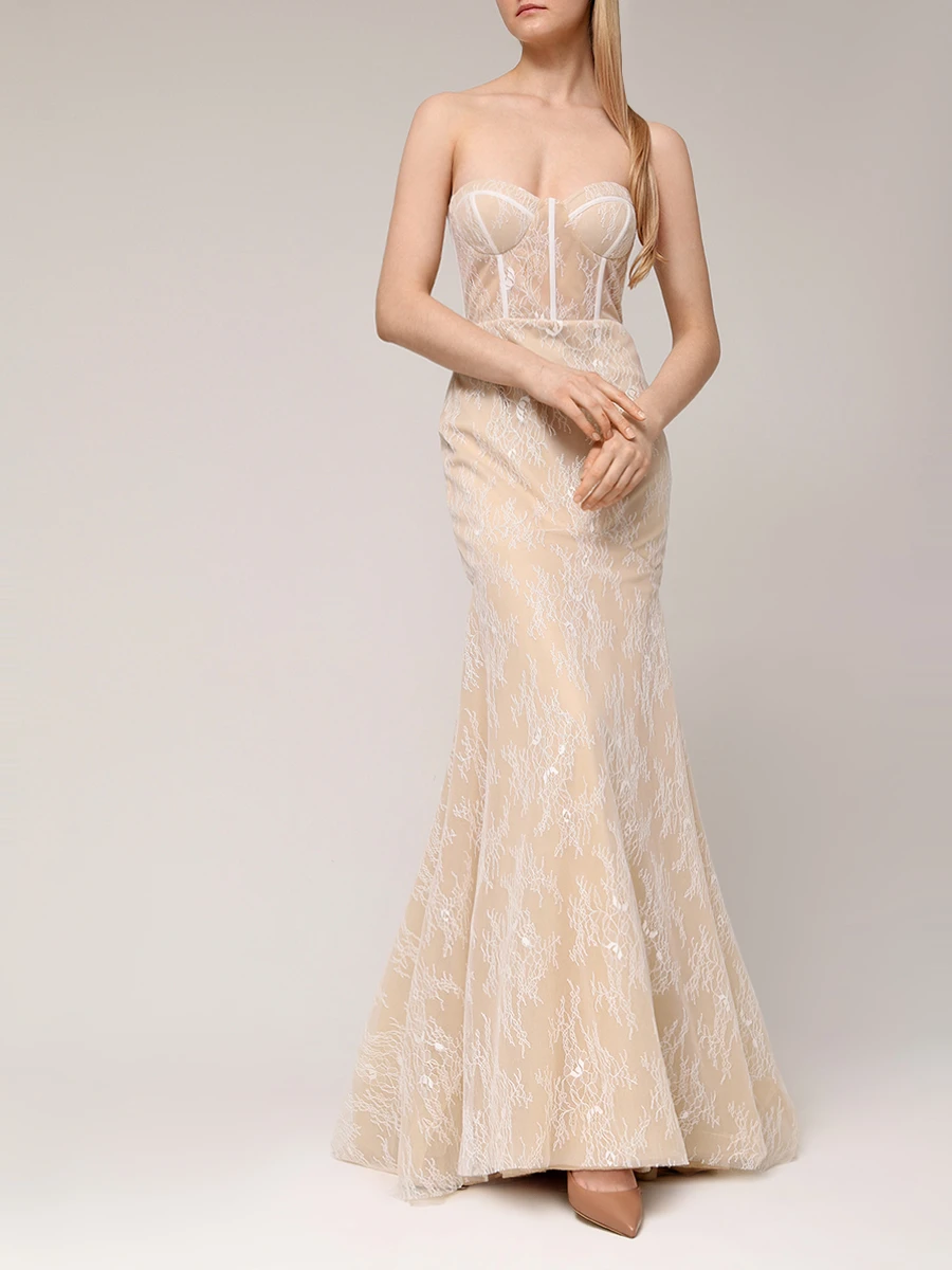 -Бежевое платье из изящного кружева от LEI LUI. -Модель приталенного кроя с открытыми плечами и спиной, корсетным лифом, формованными чашками, которые поддерживают грудь и обеспечивают комфортную посадку, расклешенным подолом со шлейфом и застежкой на потайную молнию. -Классические линии кроя платья идеально обрисовывают женственный силуэт.