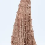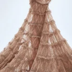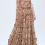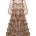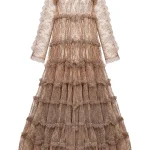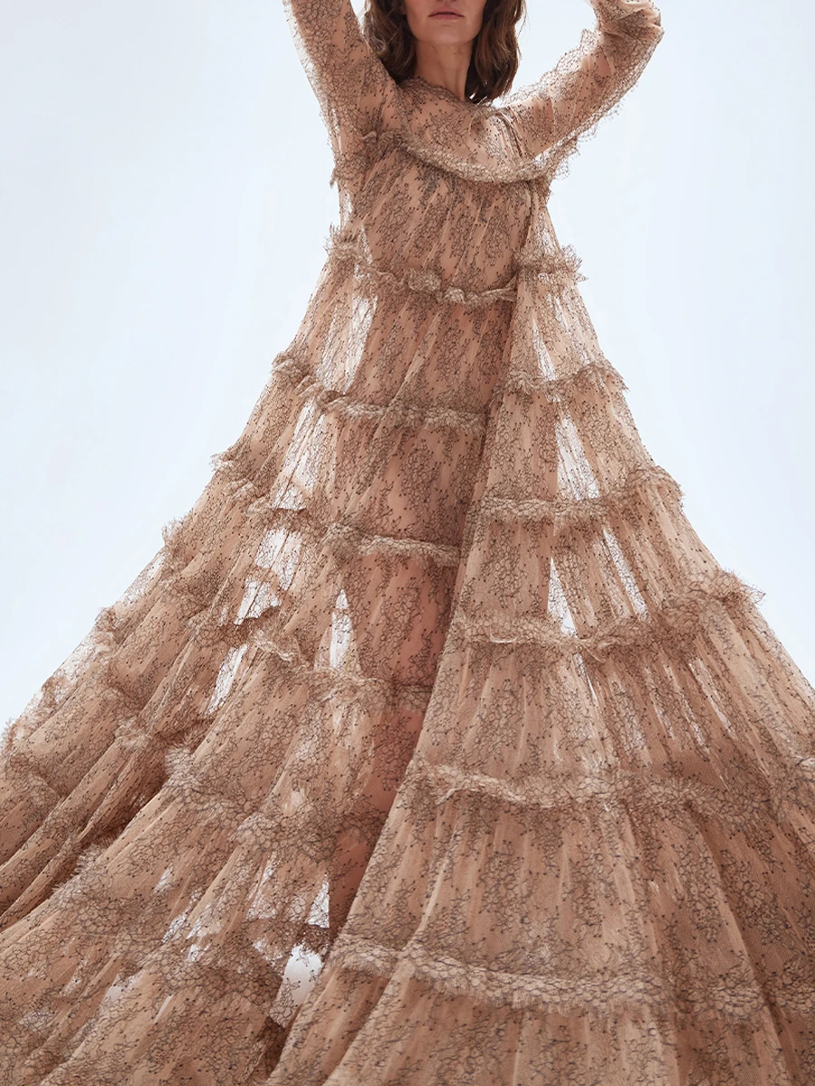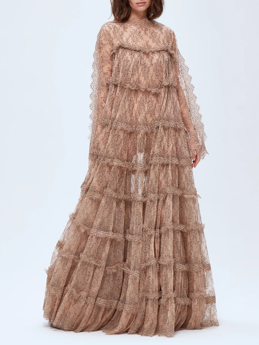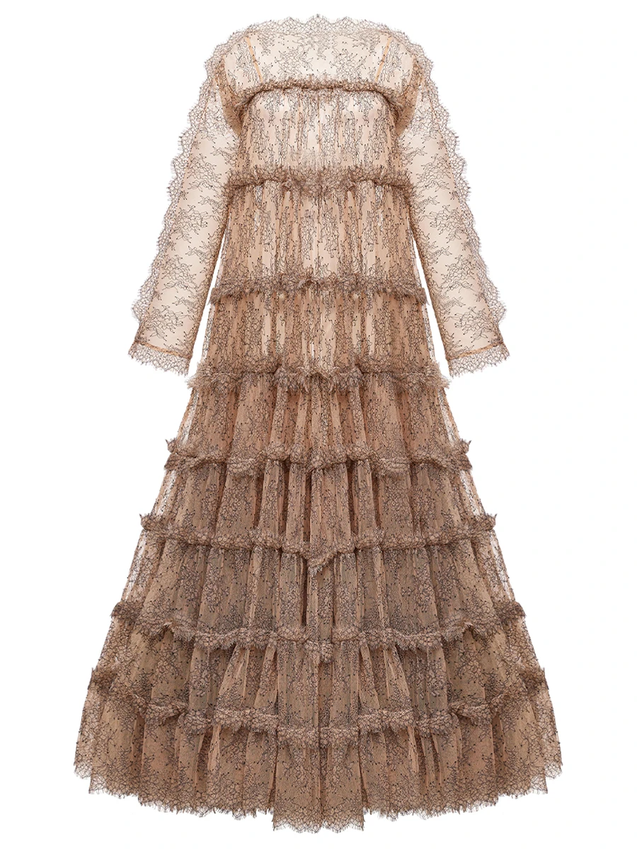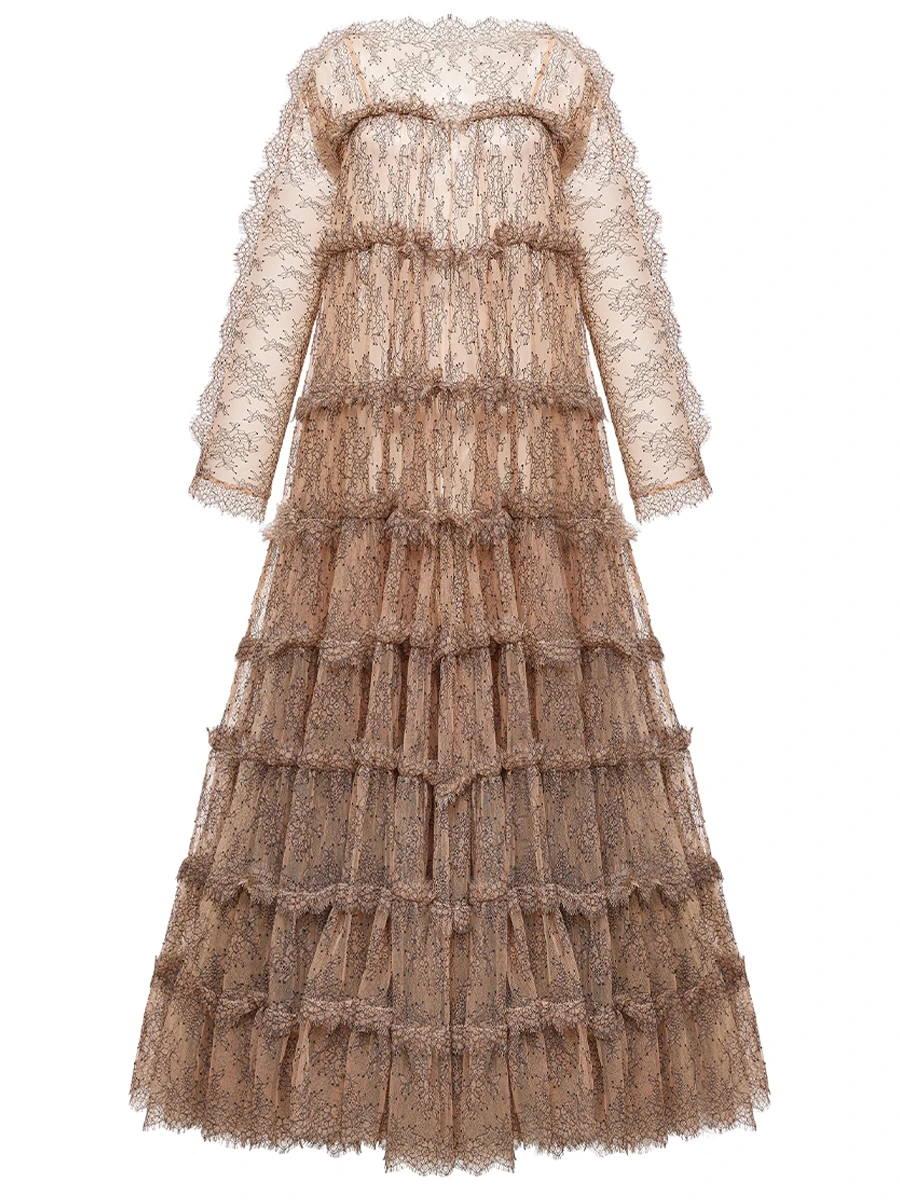 -Бежевое полупрозрачное платье из нежного кружева шантильи от MAISON ESVE. -Объемная многослойная модель с длинными рукавами и круглым вырезом горловины. -Платье идеально подходит для воздушных и женственных образов, а кружево придает образу романтичность и легкость.