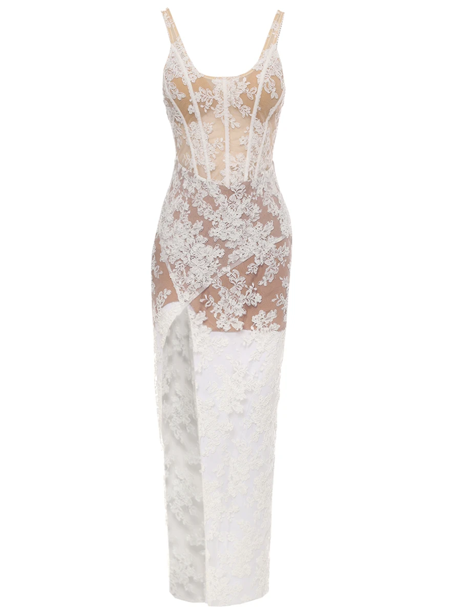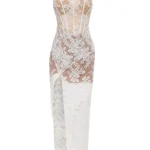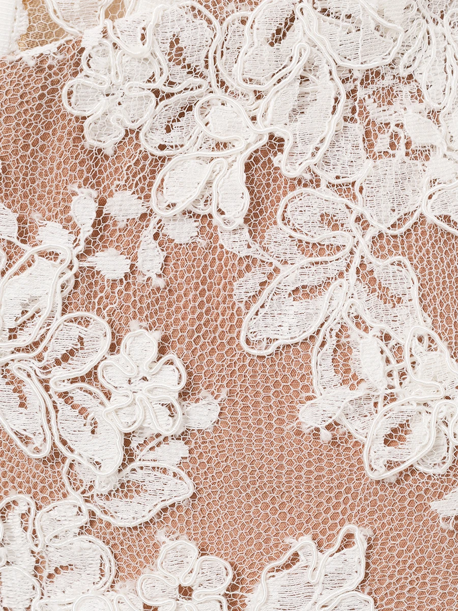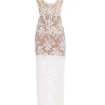 -Кремовое платье из нежного цветочного кружева от MASHA UMANSKAYA. -Модель облегающего кроя с широкими бретелями, глубоким вырезом на груди и спине, высоким разрезом спереди и завязками сзади. -Изящное кружево придает образу романтичность и легкость.
