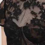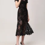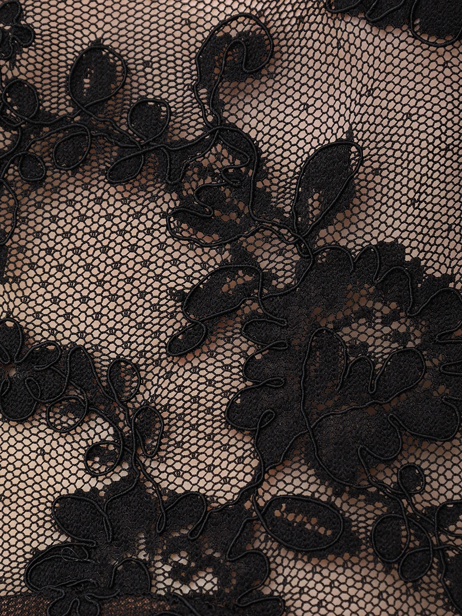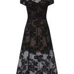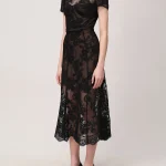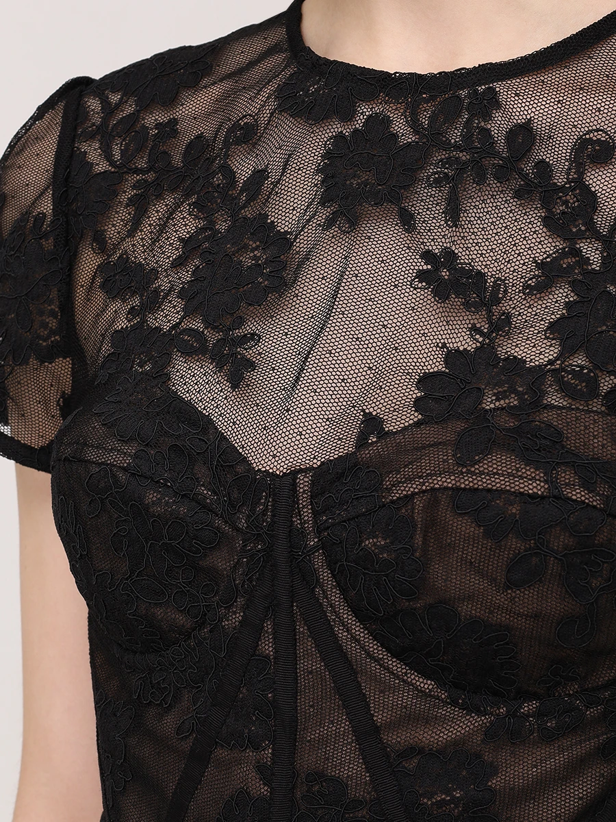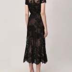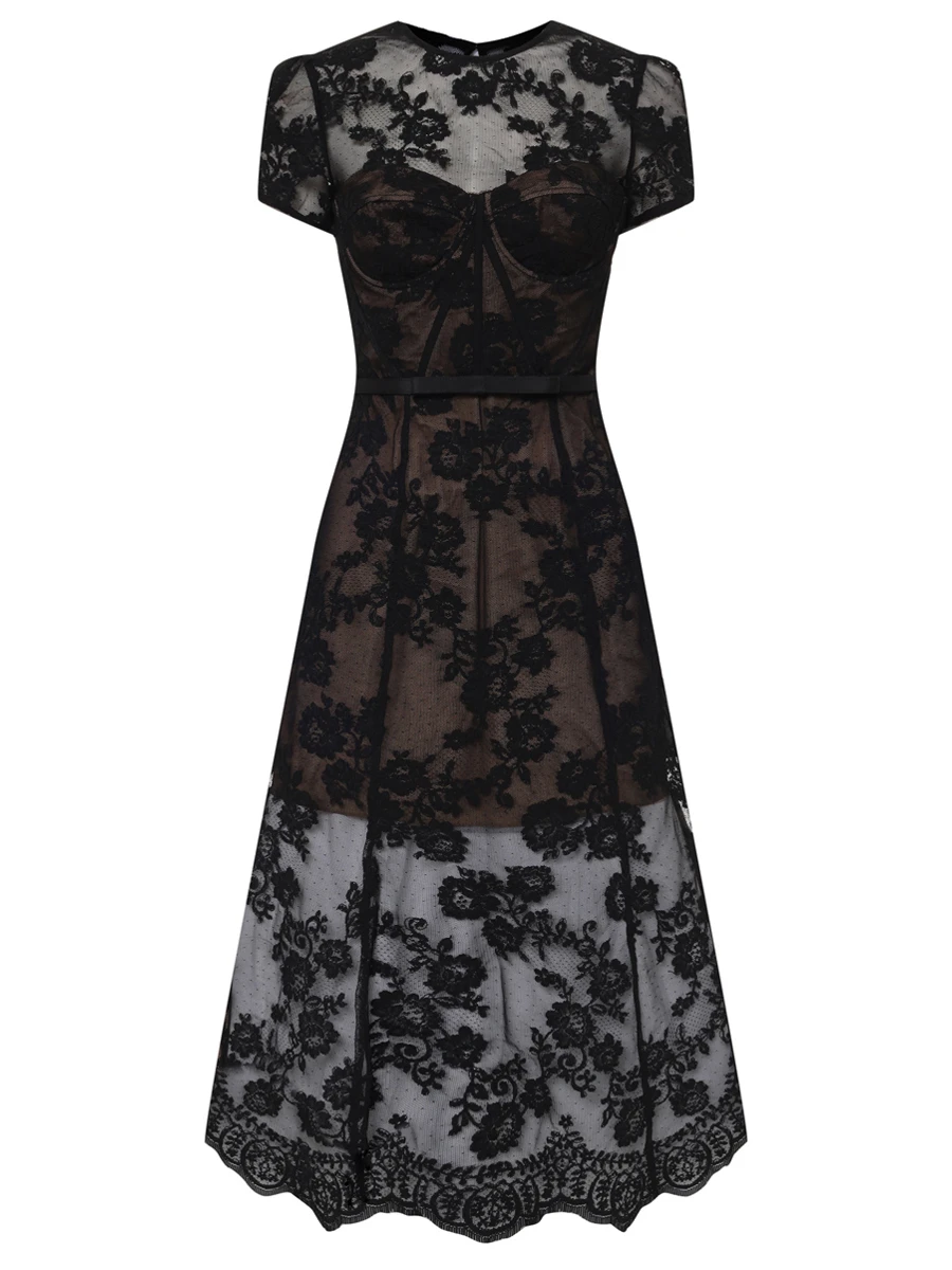 -Черное платье-миди из полупрозрачного кружева купажированного состава от SELF-PORTRAIT. -Модель с акцентом кроя на талии, юбкой А-силуэта, короткими рукавами, круглым вырезом горловины, вырезом на спине с застежкой на пуговицу. -Снизу предусмотрено базовое мини-платье с очерченными чашками лифа.