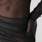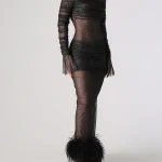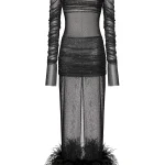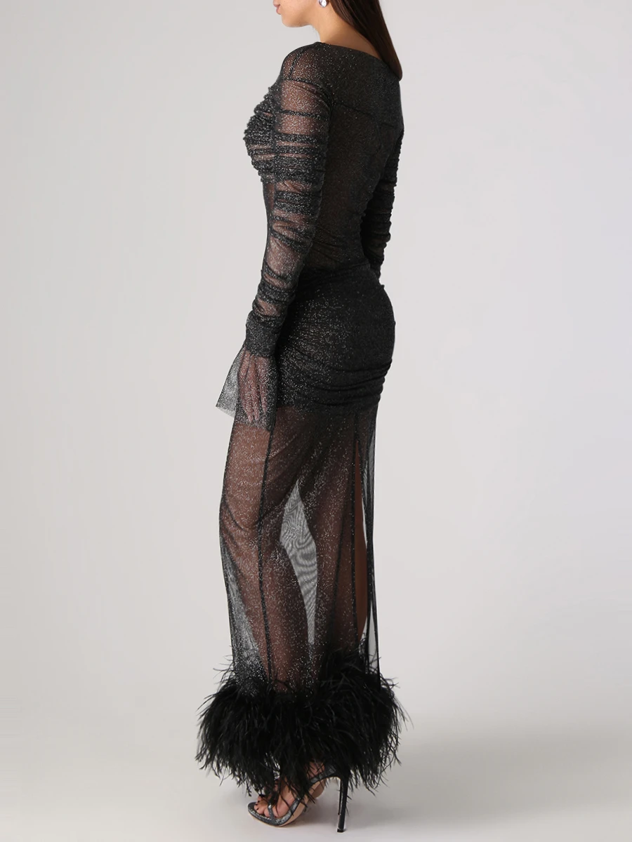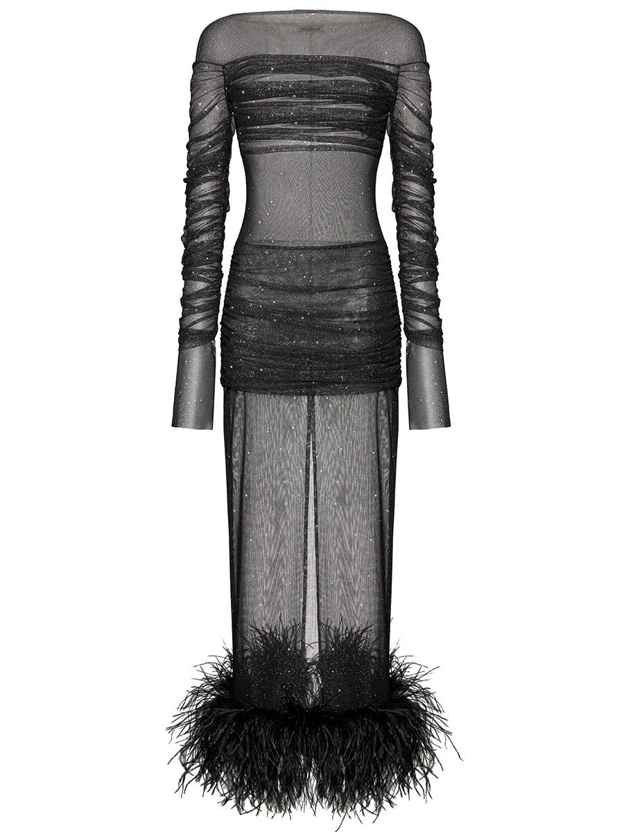 -Черное полупрозрачное платье-макси из эластичного тюля с легким блеском от SOULESSENCE. -Приталенная модель с изящной драпировкой по рукавам, линии груди и бедрам. -По низу изделия выполнена отделка из высококачественных перьев страуса. -Смелое платье эффектно подчеркивает изящное женское тело, огибая бедра и выделяя талию. -Босоножки на высоком каблуке и сдержанная бижутерия дополнят вечерний образ.