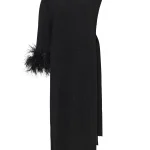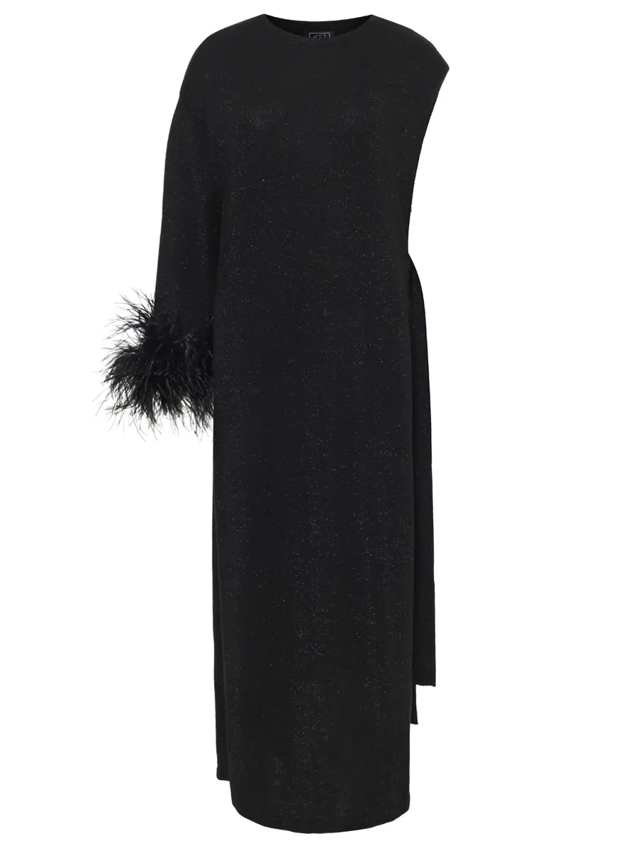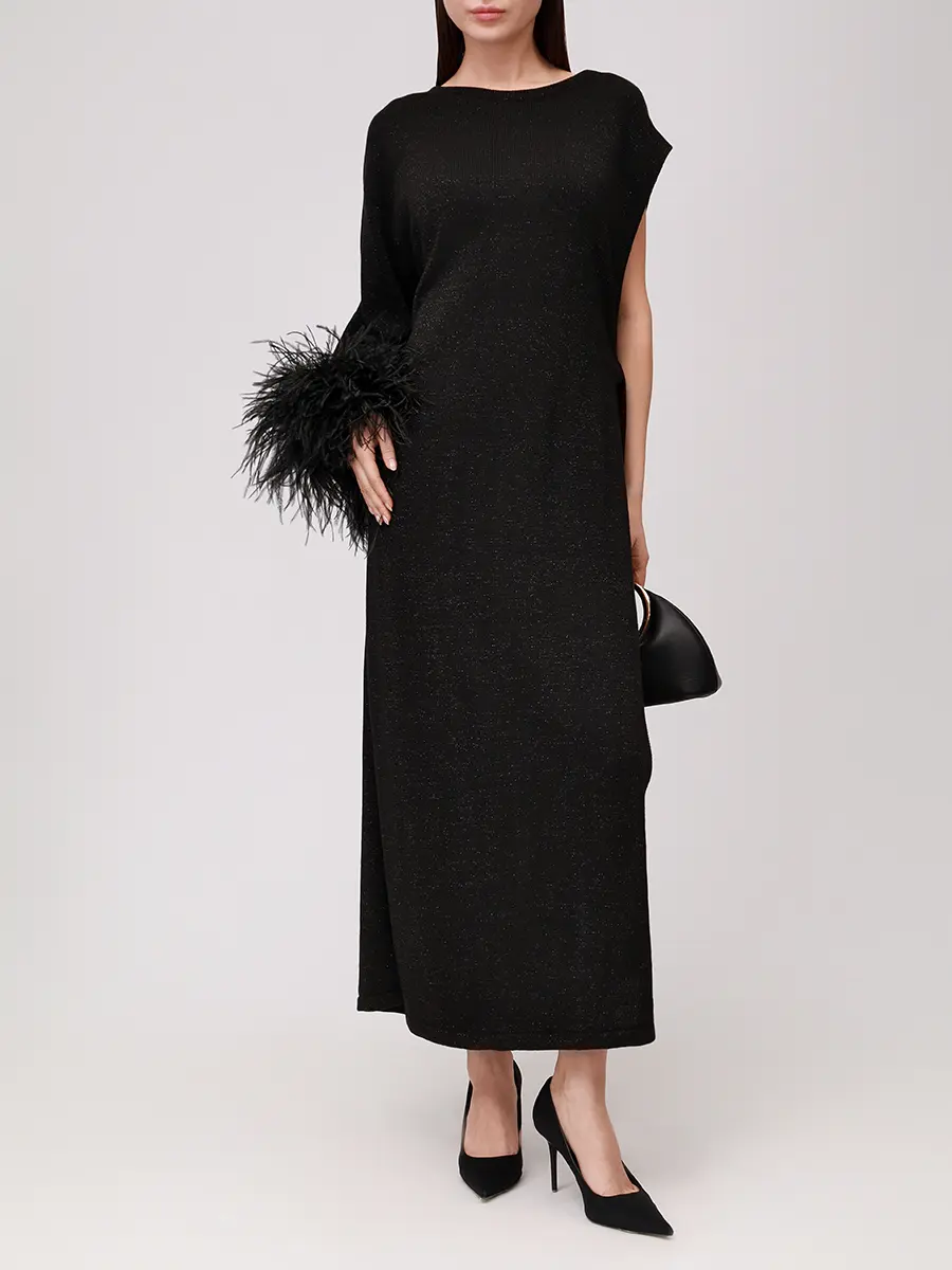-Черное платье из натурального хлопка с добавлением акрила от KSI KSI. -Ассиметричная модель с кроем по фигуре, длинным рукавом, декорированным по низу перьями, круглым вырезом горловины, глубоким разрезом сбоку с фиксацией лентами. -Платье-накидка уместно дополнит особые мероприятия. -Изделие подойдет на размер 42/46.