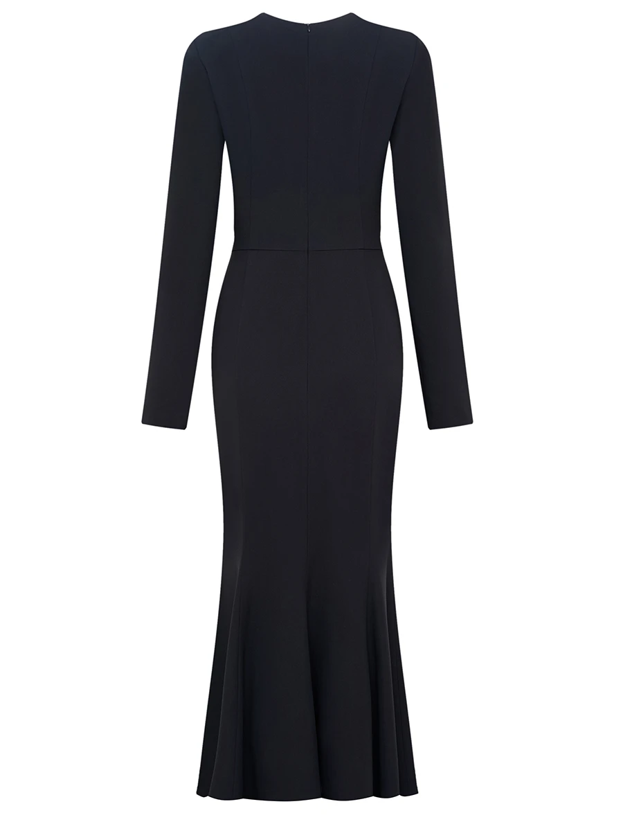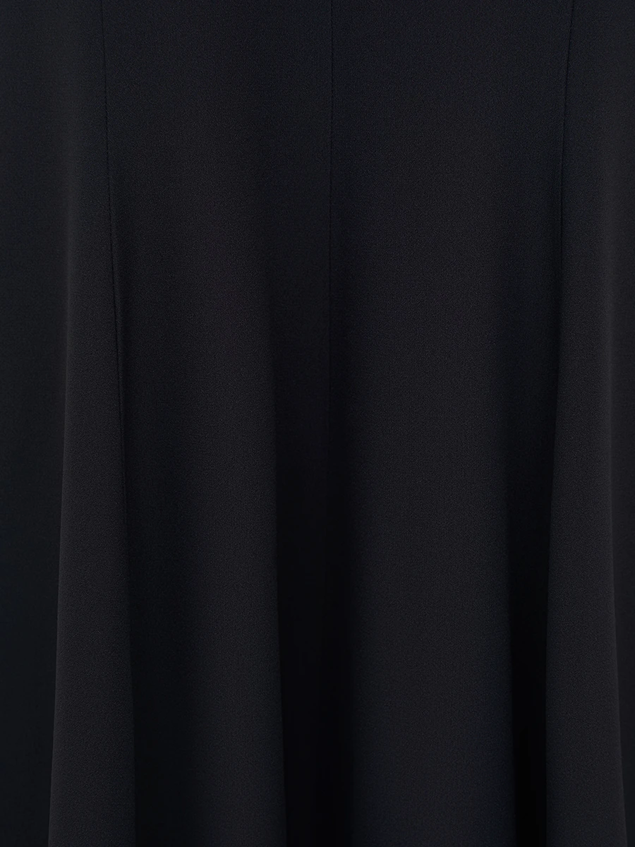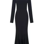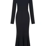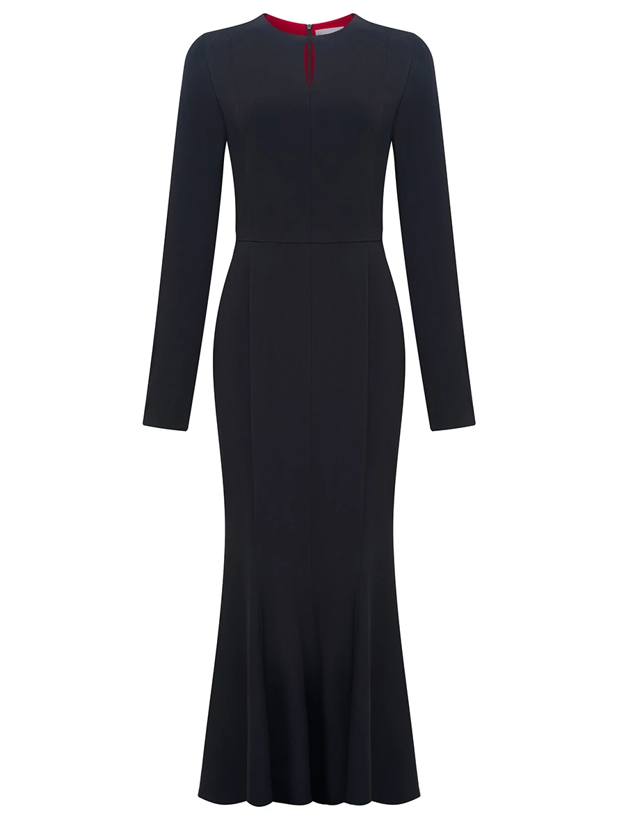 -Платье черного цвета от LORER. -Приталенный силуэт, длина миди, длинные рукава, юбка годе, вырез-капля, контрастная алая подкладка, застежка на потайную молнию на спинке.