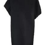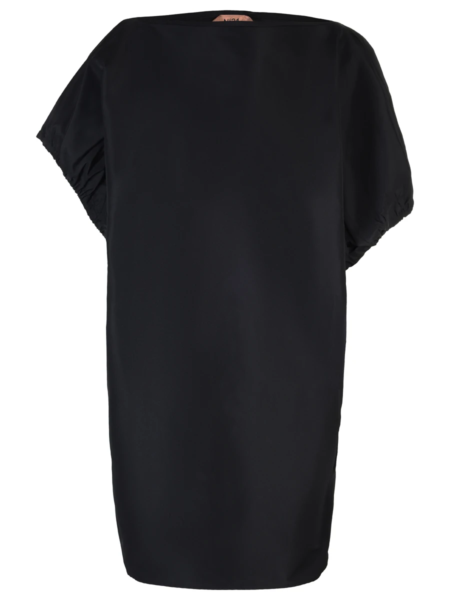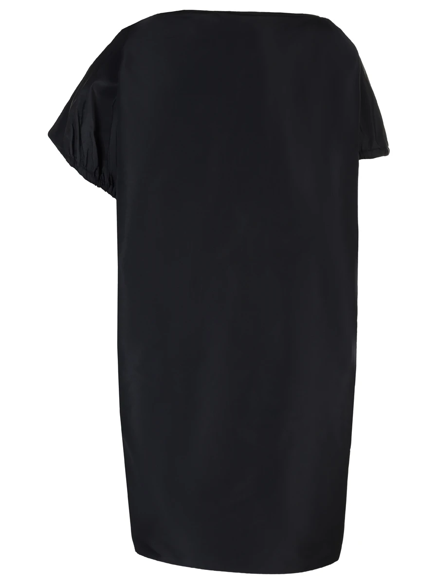 -Черное ассиметричное платье от №21 -Модель свободного кроя с короткими рукавами, вырезом-лодочкой. -Платье из плотного, нерастяжимого и держащего форму материала. За счет этого оно неповторимо садится на фигуру, выглядит нестандартно и эффектно.