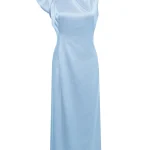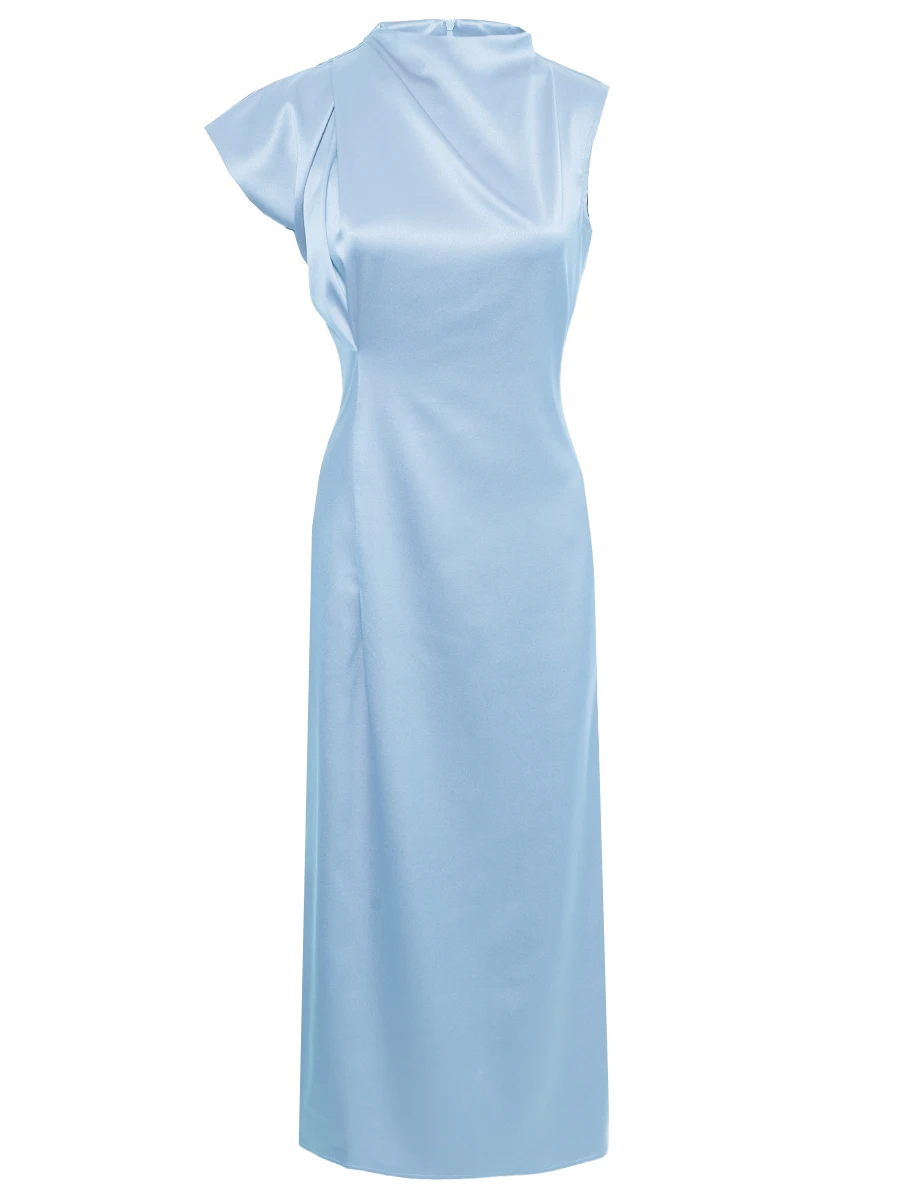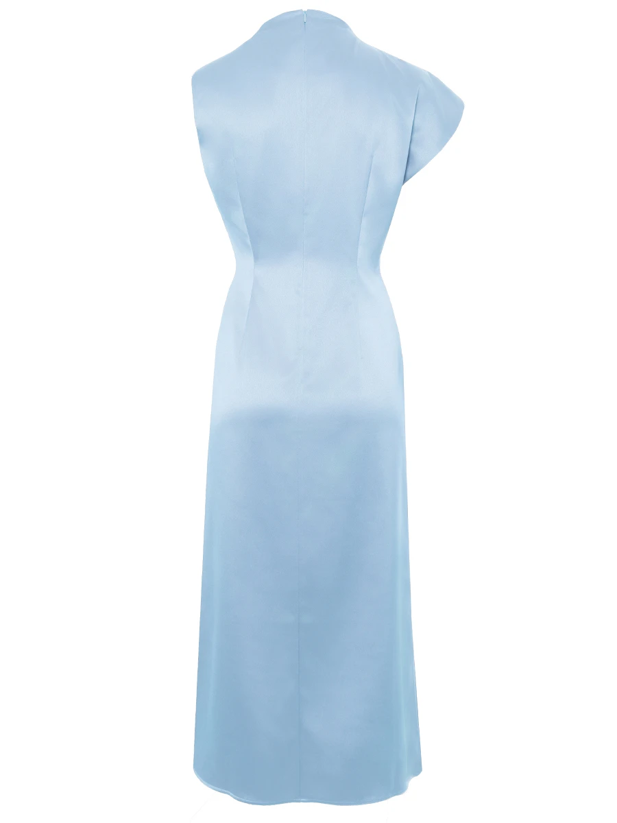 -Асимметричное атласное голубое платье купажированного состава от BORNIN_22. -Оригинальная модель прилегающего силуэта с одним коротким рукавом, драпировкой, застежкой на потайную молнию на спинке. -Платье дополнит вечерние образы.