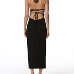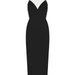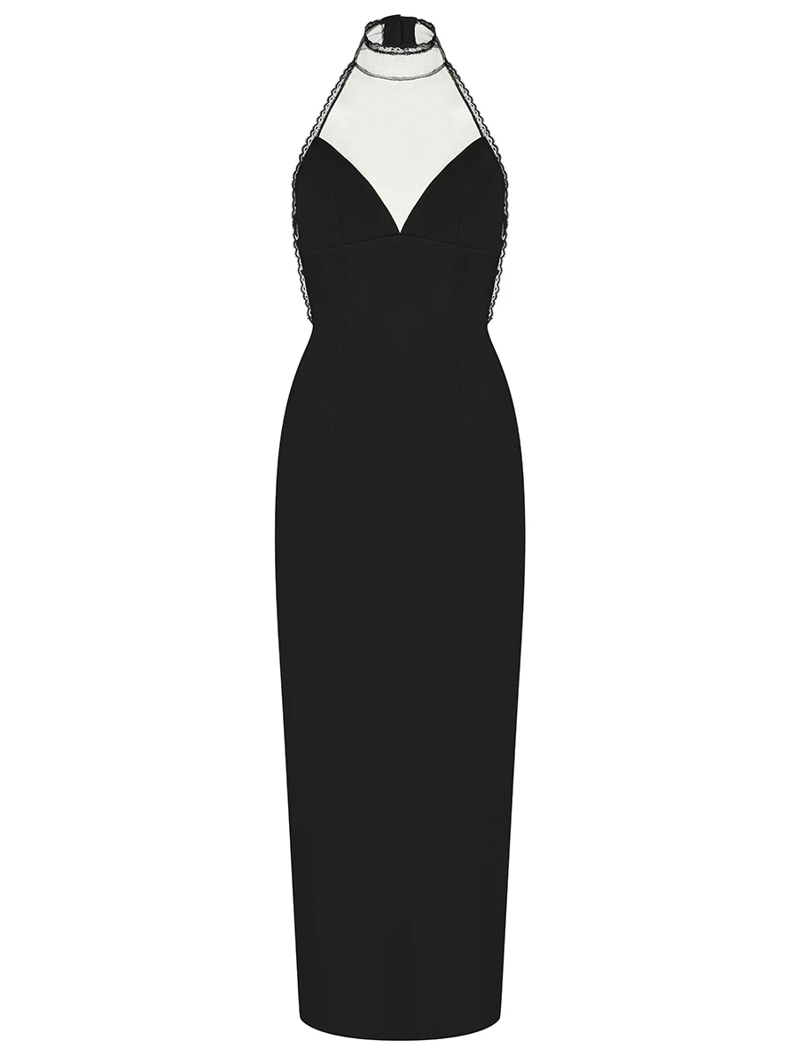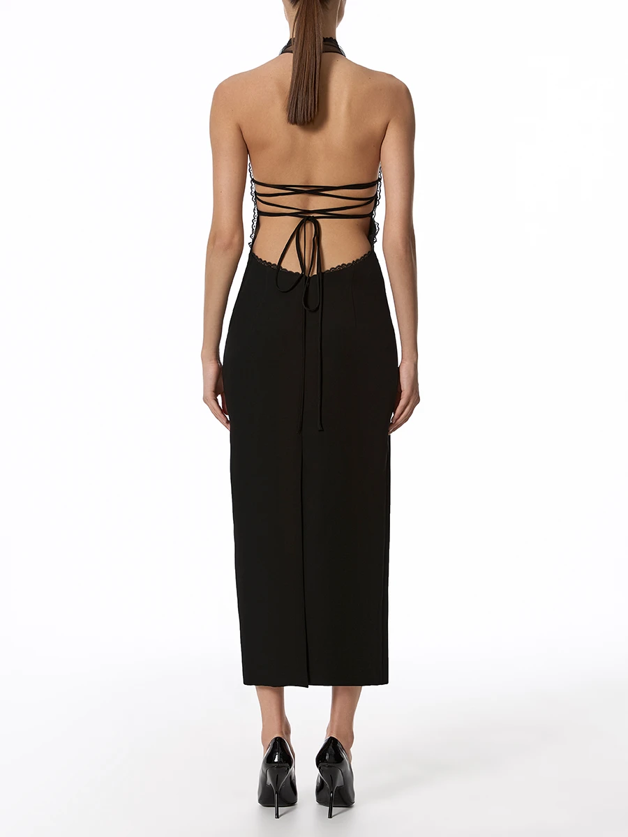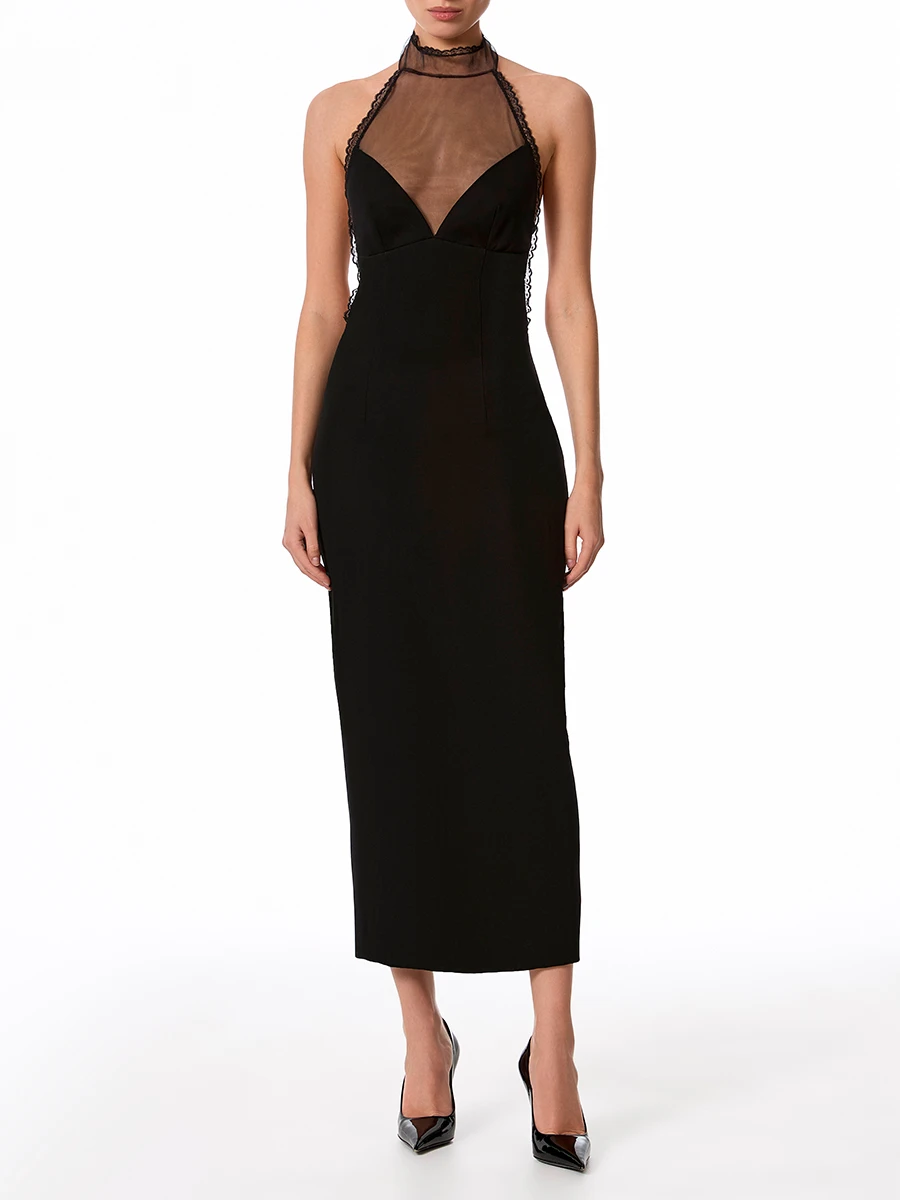 -Черное платье из креповой ткани от CHRISTINA MIRALD. -Модель приталенного кроя с открытыми плечами и спиной, сеткой на груди, чокером, шнуровкой на спине и отделкой изящным кружевом в тон, которое придает образу романтичность и легкость. -Высокая шлица сзади позволяет комфортно передвигаться и сидеть.