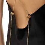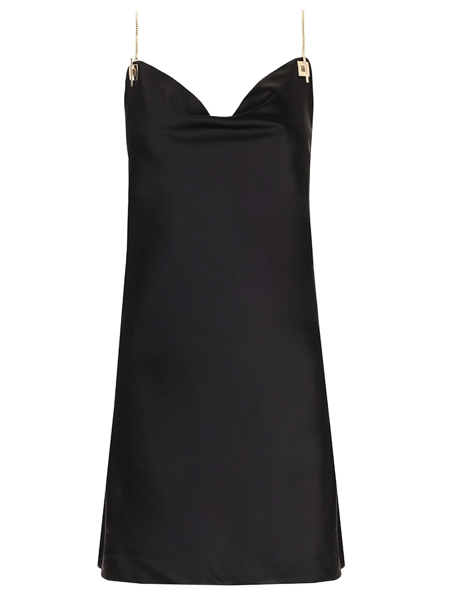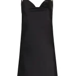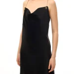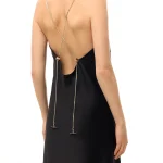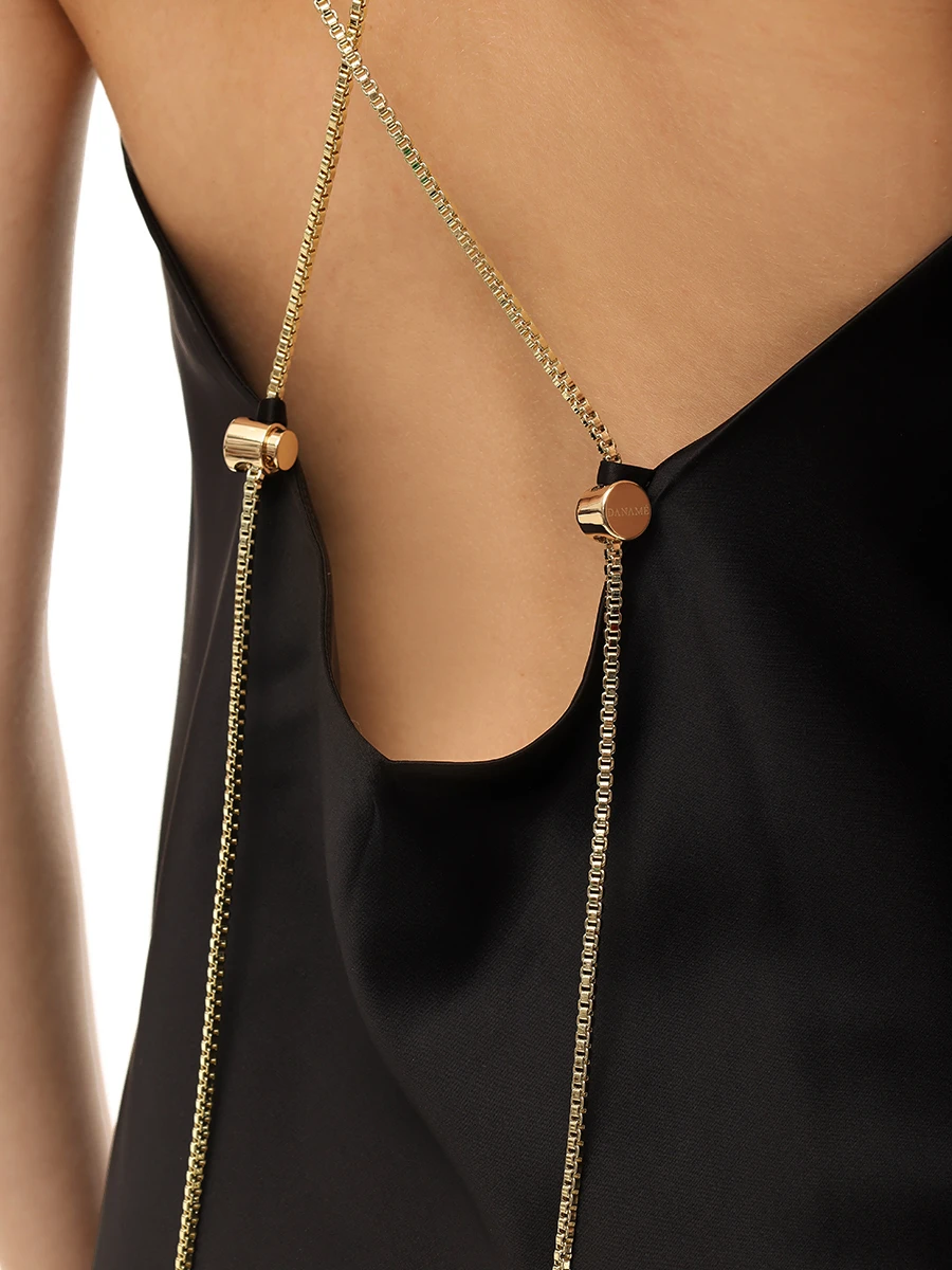 -Черное мини-платье из атласного искусственного шелка от DANAME. -Модель с акцентом кроя на талии, полуприлегающей юбкой, узкими бретелями-цепочками в золоте на плечах, которые перекрещиваются на спине, драпировкой-качели в зоне декольте и сзади. -Золотистая металлофурнитура органично контрастирует с красным цветом, создавая яркий вечерний образ.