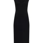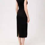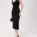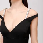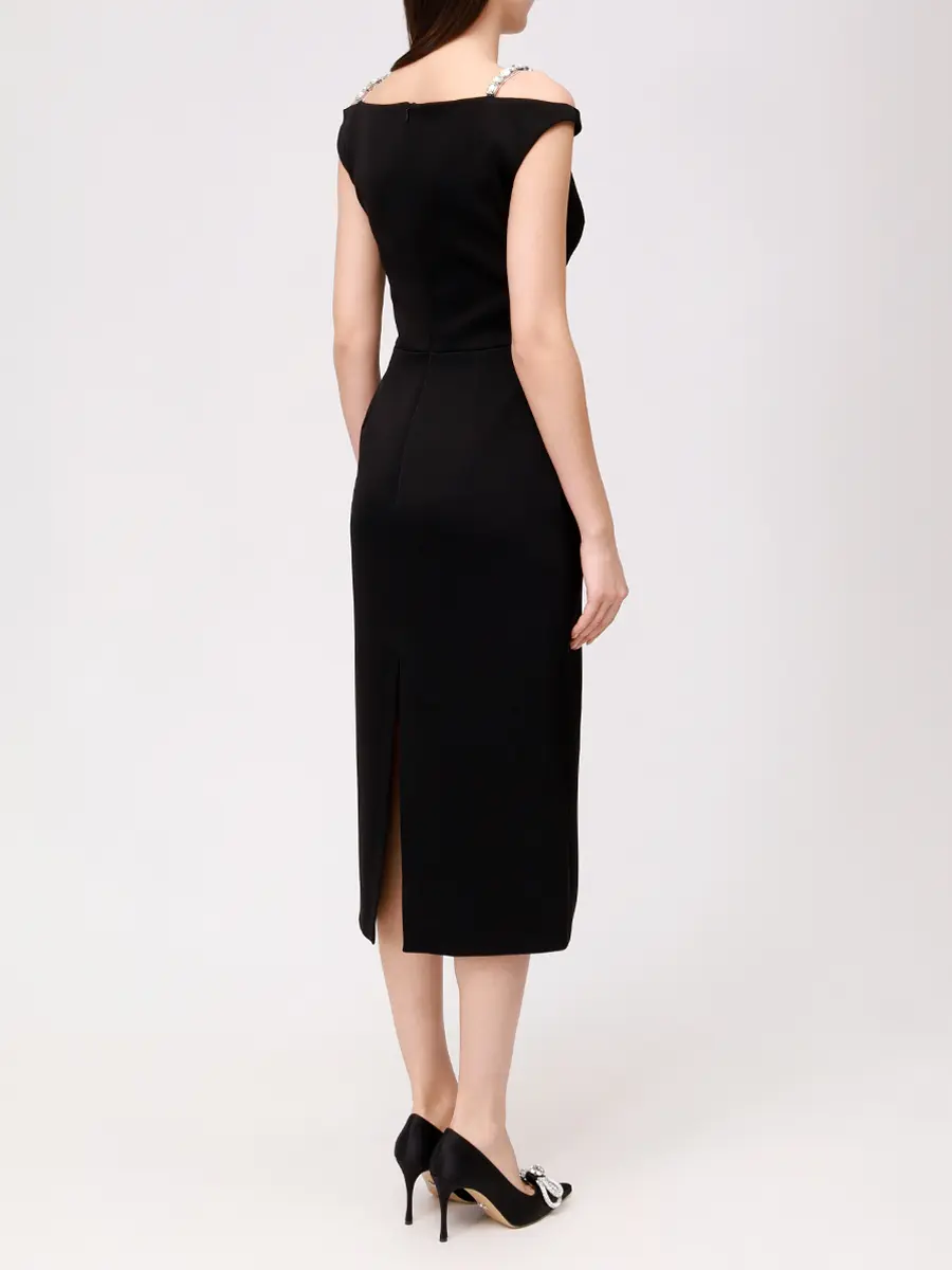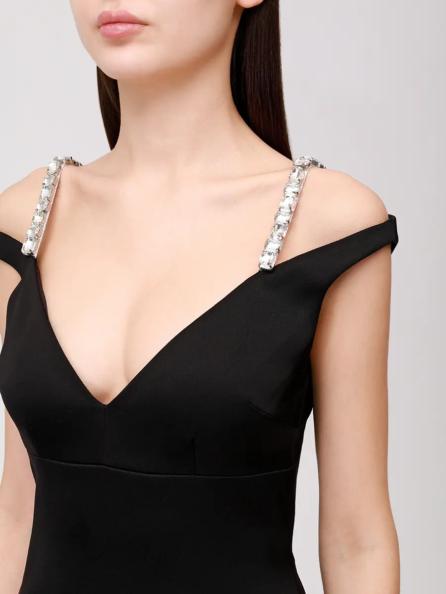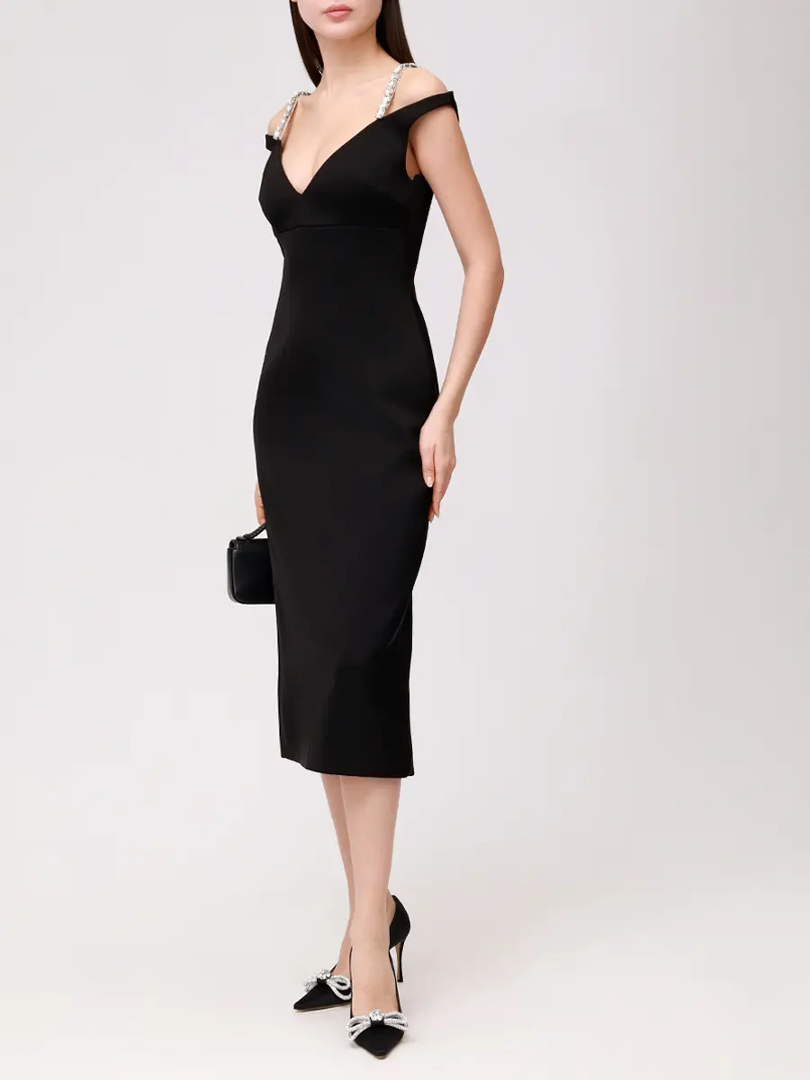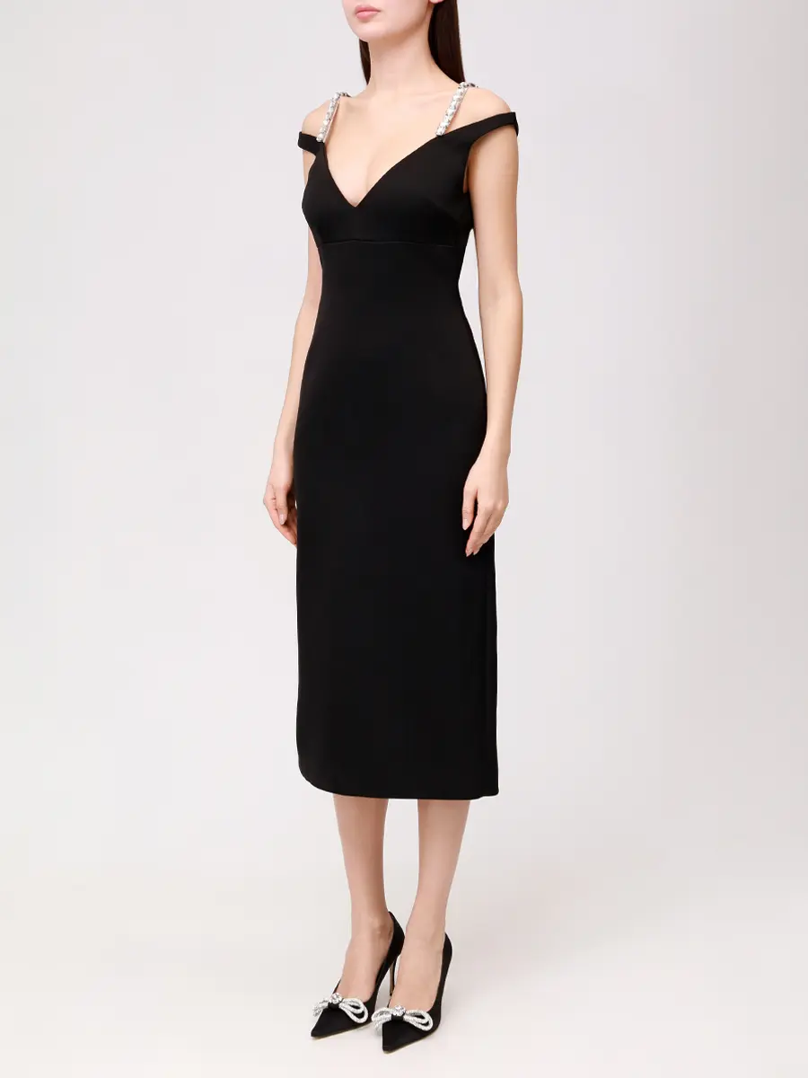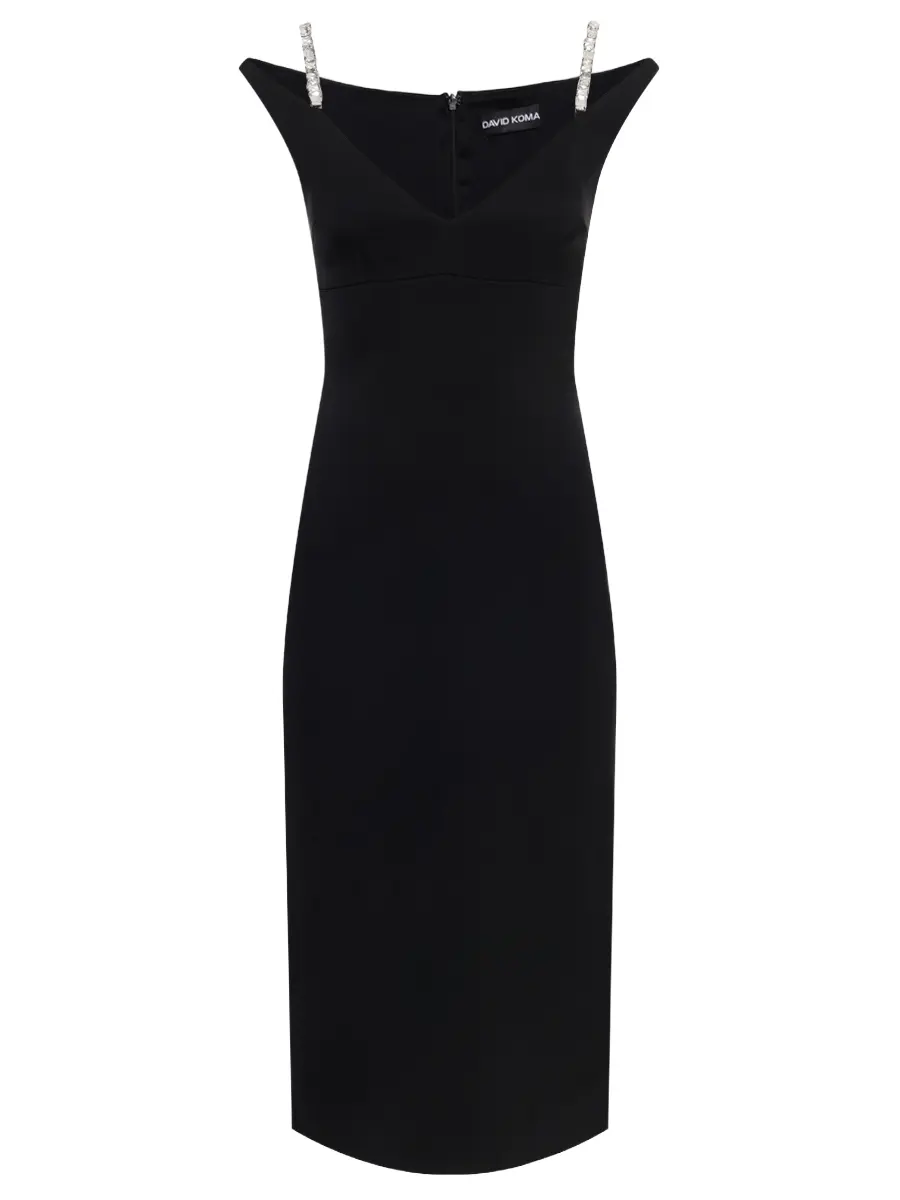 -Черное платье-миди купажированного состава от DAVID KOMA. -Модель с акцентом кроя на талии и бедрах, глубоким V-образным вырезом декольте, бретелями с декором крупными кристаллами. -Высокая шлица сзади обеспечивает комфортный шаг. -Застежка на потайную молнию не отвлекает от чистоты линий кроя.