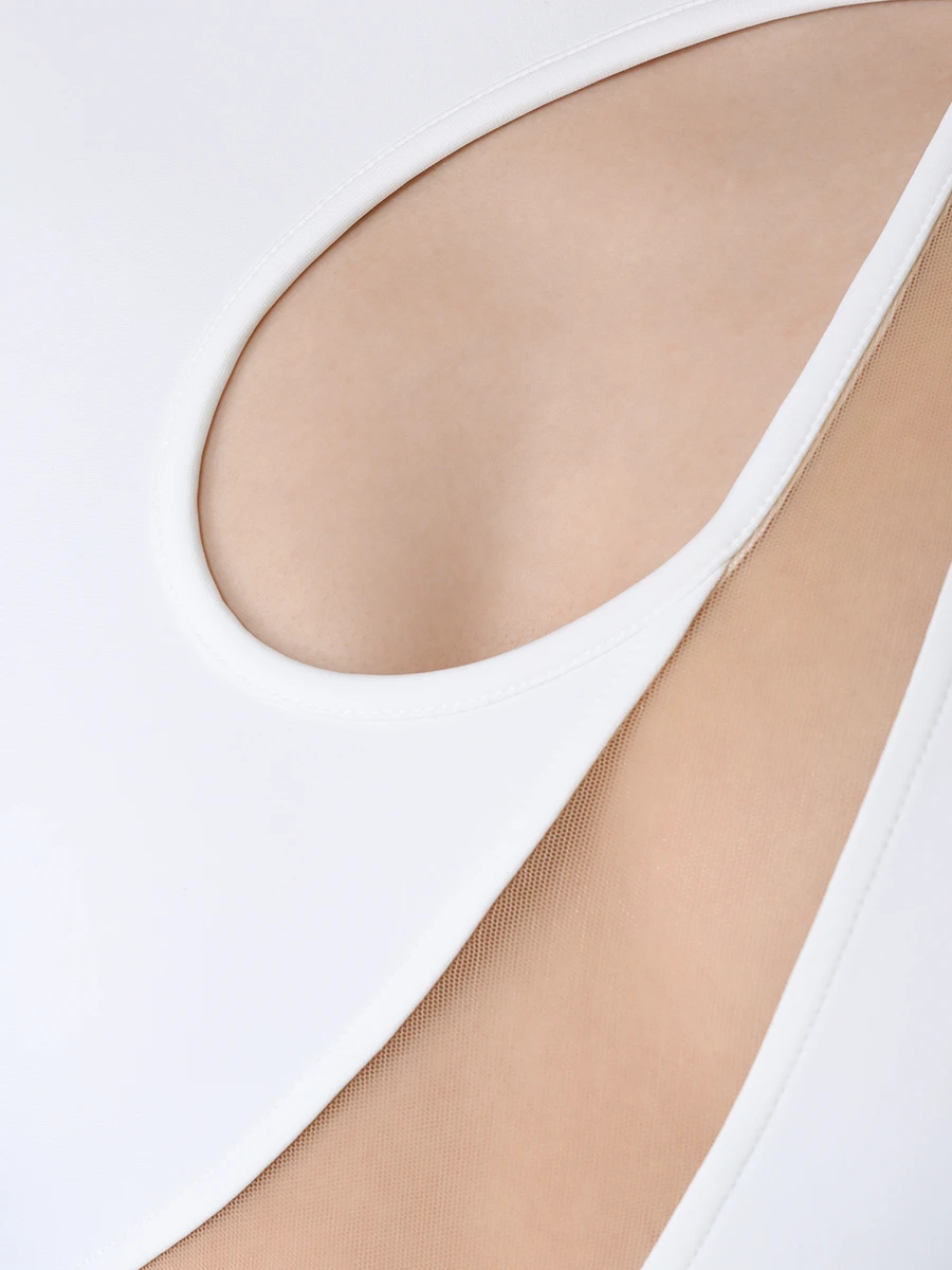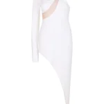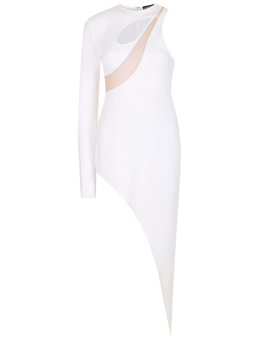 -Белое мини-платье купажированного состава от DAVID KOMA. -Модель на одно плечо облегающего кроя с асимметричной длиной подола, круглым вырезом горловины, застежкой на потайную молнию сзади, вставками из прозрачной сетки на декольте.