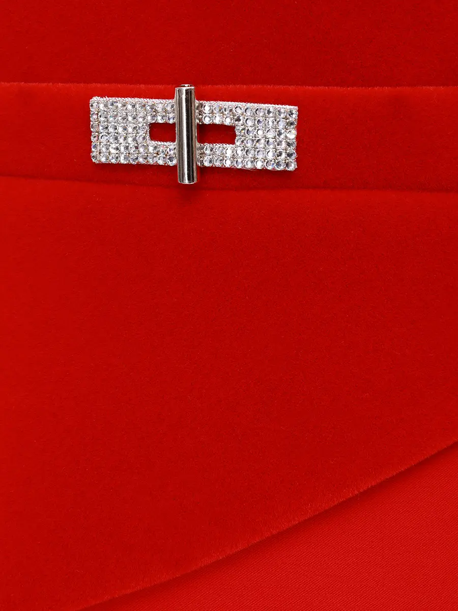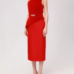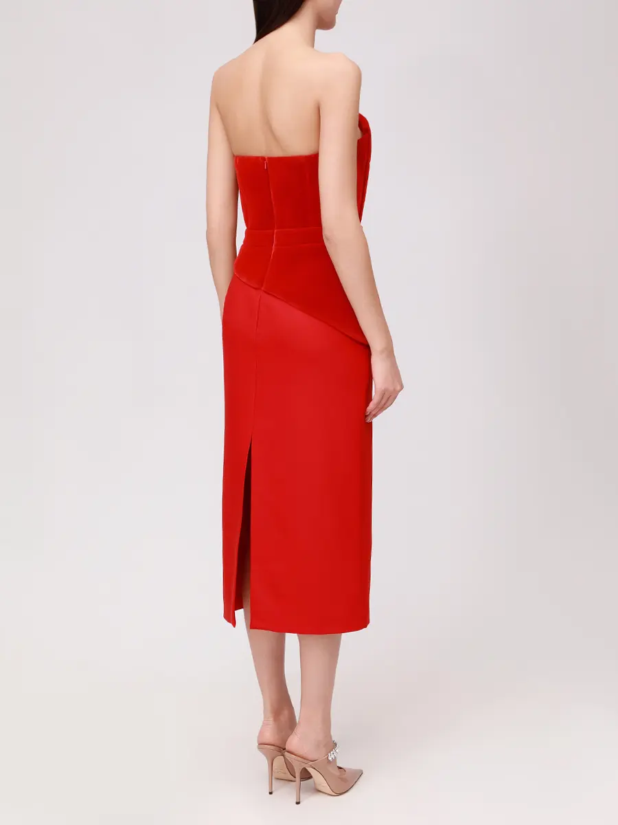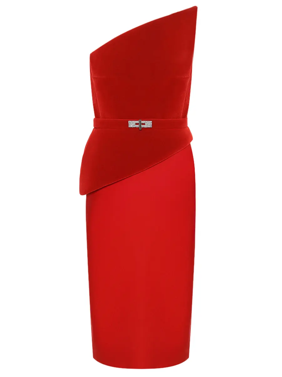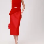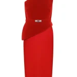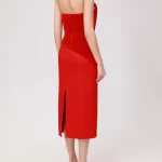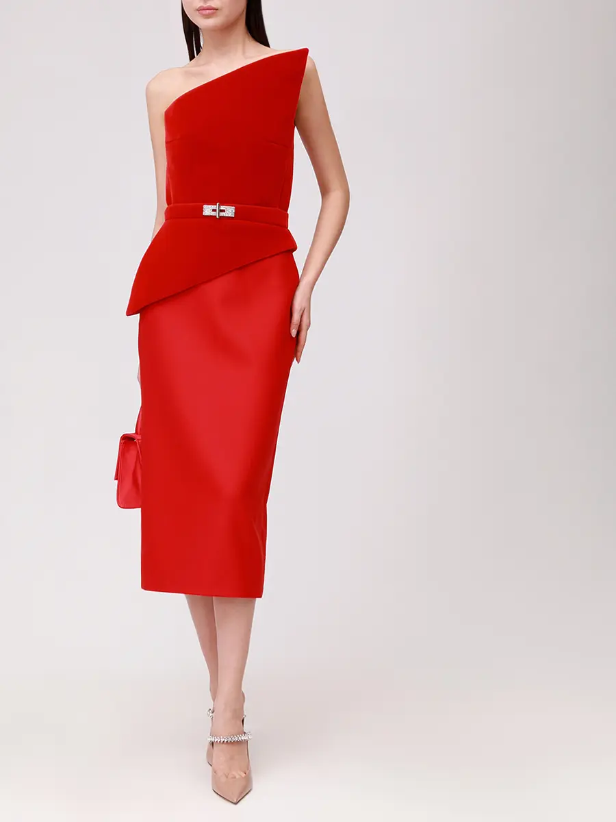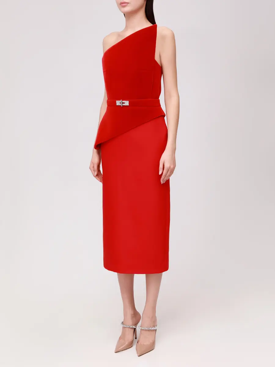-Красное платье-миди купажированного состава от DAVID KOMA. -Модель приталенного кроя с прямой юбкой, пряжкой со стразами спереди, деталями с диагональным кроем, открытой спиной. -Высокая шлица сзади обеспечивает комфортный шаг. -Застежка на потайную молнию не отвлекает от чистоты линий кроя.