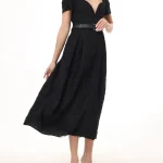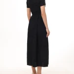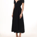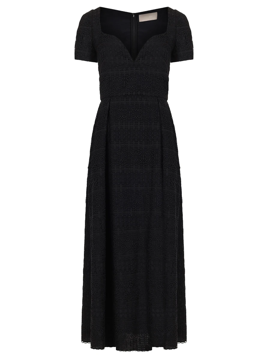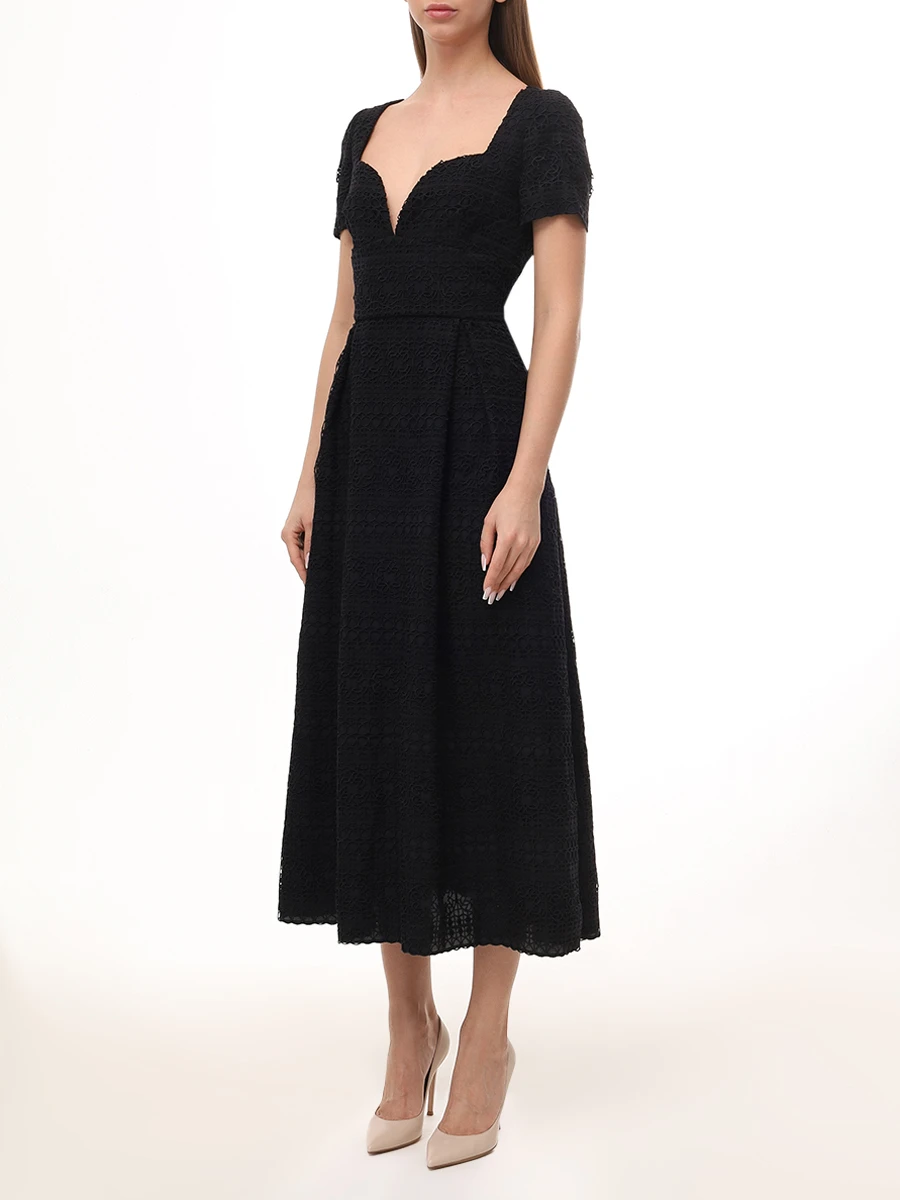 -Черное платье-миди от ELIE SAAB. -Модель приталенного кроя с короткими рукавами, расклешенной юбкой, глубоким сердцевидным вырезом декольте, застежкой на потайную молнию сзади.
