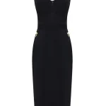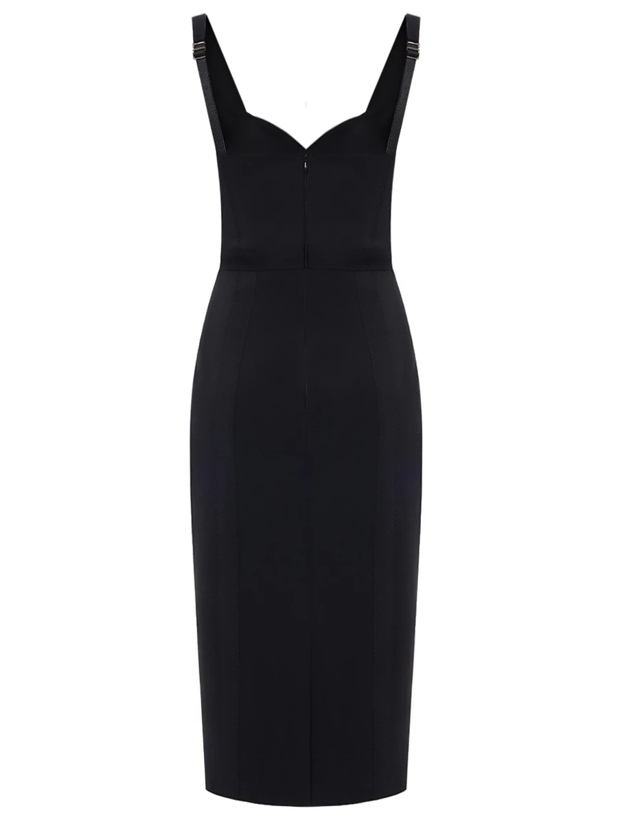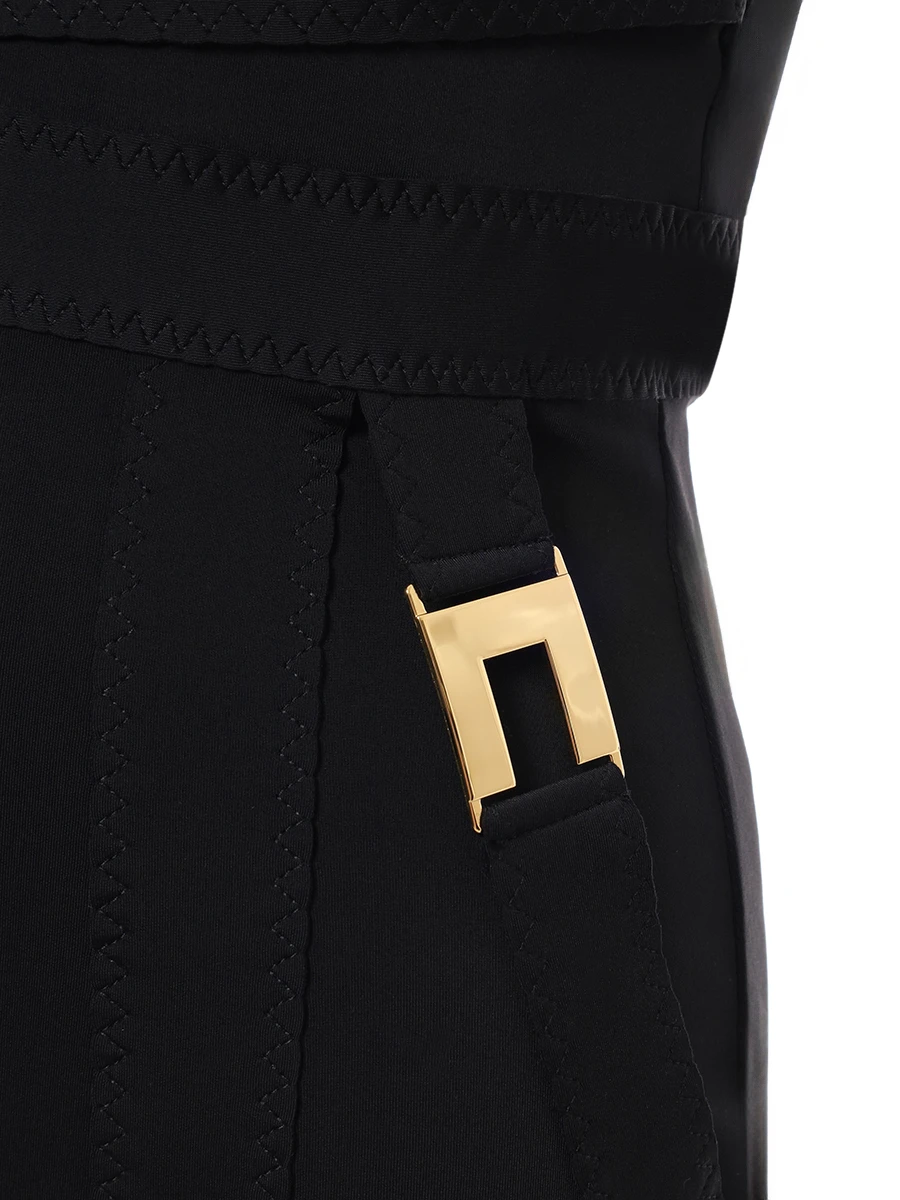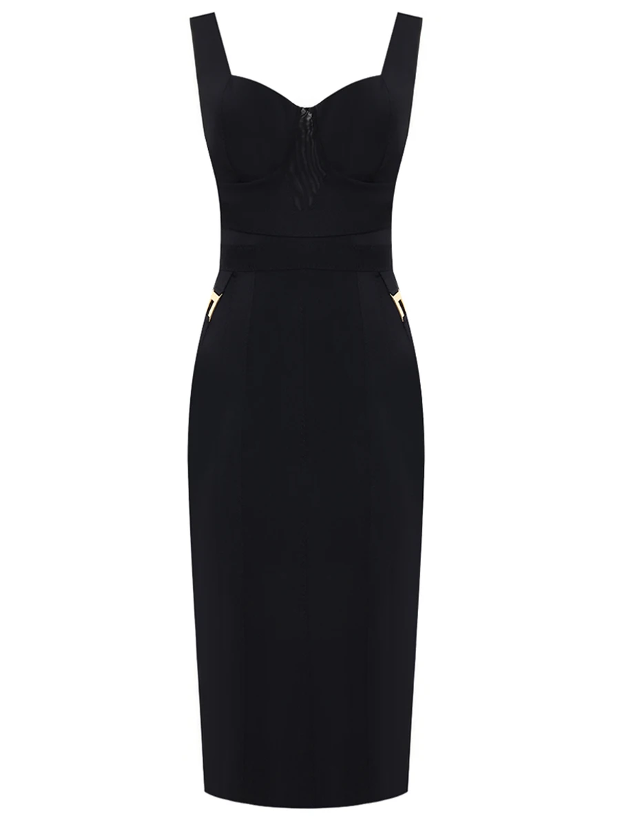 -Черное платье-футляр от ELISABETTA FRANCHI. -Модель облегающего кроя без рукавов с фигурным вырезом декольте, золотистой на потанйю молнию на спинке и вставками из тюля. -Лаконичное платье, в котором нет ничего лишнего уместно дополнит коктейльные или вечерние мероприятия.