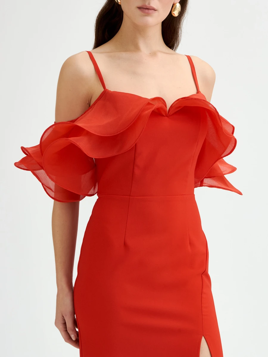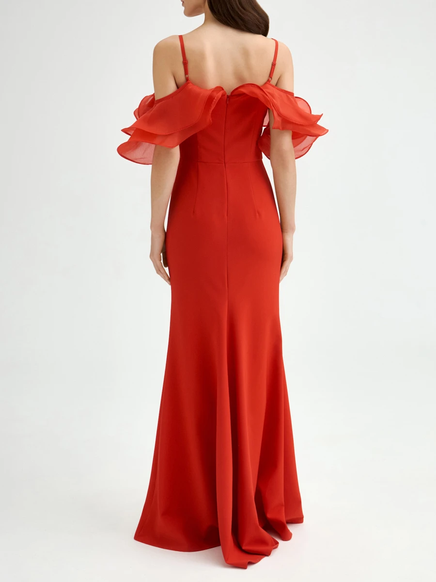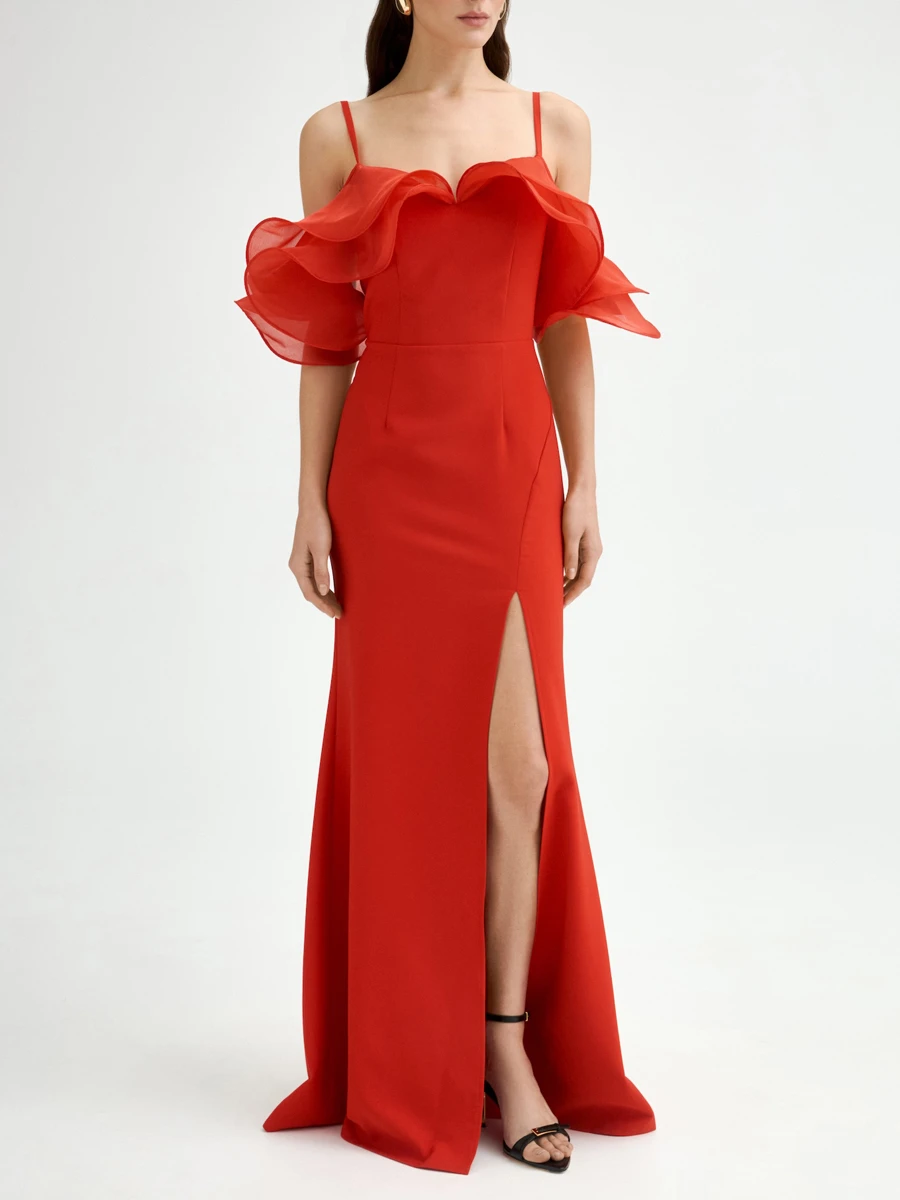 -Красное платье-макси от EMILIA DELL’ORO. -Модель с узкими бретелями с роскошными воланами из органзы и юбкой силуэта-годе с высоким разрезом выглядит очень элегантно и привлекает внимание. -Силуэт в пол, воланы, нежно прикрывающие руки, создают незабываемый образ, идеально подходящий для самого торжественного события. Размер XXS соответствует 40 российскому размеру, ОГ 80, ОТ 62, ОБ 86. Размер XS соответствует 42 российскому размеру, ОГ 84, ОТ 66, ОБ 90. Размер S соответствует 44 российскому размеру, ОГ 88, ОТ 70, ОБ 94. Размер M соответствует 46 российскому размеру, ОГ 92, ОТ 74, ОБ 98. Размер L соответствует 48 российскому размеру, ОГ 96, ОТ 78, ОБ 102. Размер XL соответствует 50 российскому размеру, ОГ 100, ОТ 82, ОБ 106. Размер XXL соответствует 52 российскому размеру, ОГ 104, ОТ 86, ОБ 110. Размер XXXL соответствует 54 российскому размеру, ОГ 108, ОТ 90, ОБ 114.