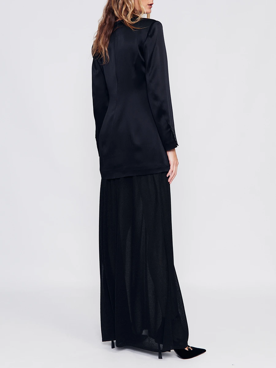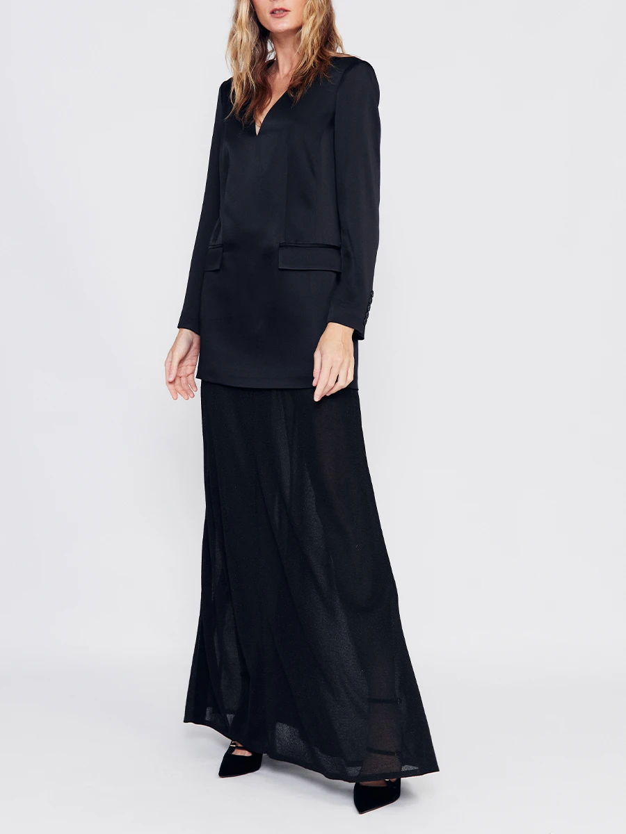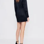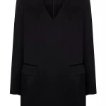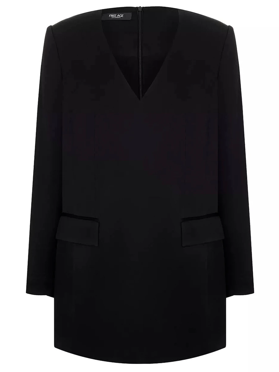 -Черное платье-мини из ацетатного шелка и вискозы от FREE AGE. -Модель прямого кроя с длинными рукавами, V-образным декольте, прорезными карманами с клапанами. -Платье идеально подойдет как для деловых встреч, так и для вечерних мероприятий. -Модель также можно носить в качестве туники с брюками или юбками.