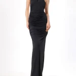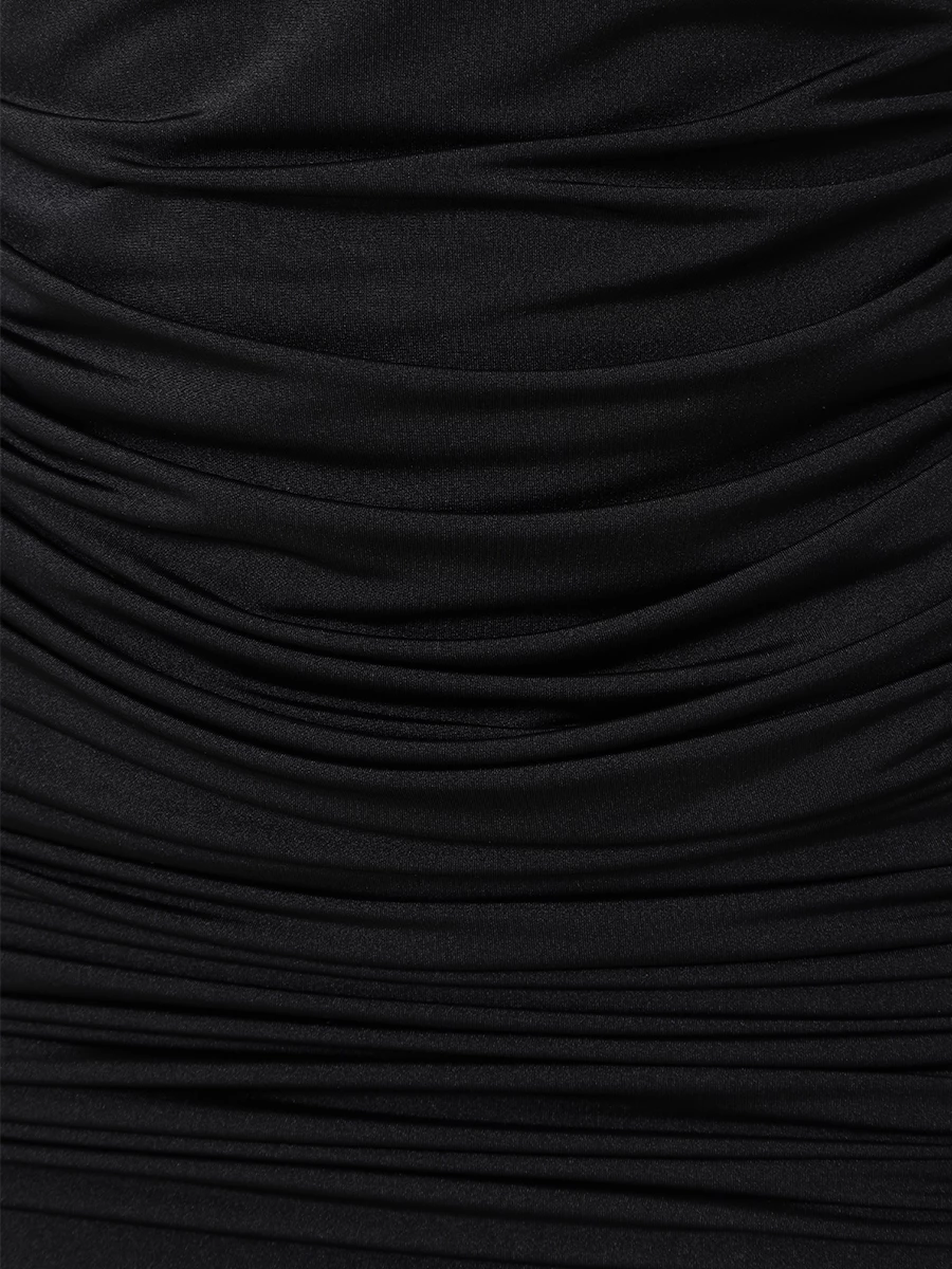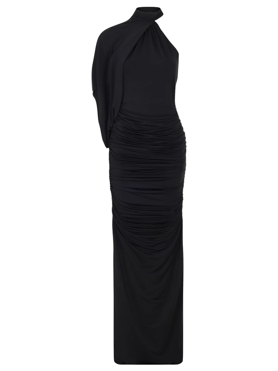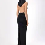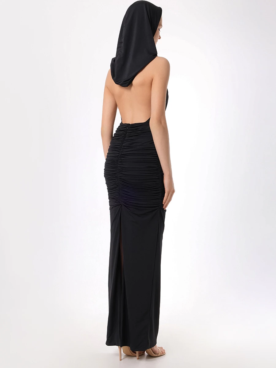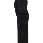 -Эффектное черное платье-макси от GIUSEPPE DI MORABITO. -Модель с акцентом на талии и бедрах, многочисленными драпировками, кроем американская пройма, открытой спинкой и застежкой на потайную молнию. -Платье дополнено асимметричной деталью, которую можно стилизовать в образе как капюшон или накидку на одно плечо.