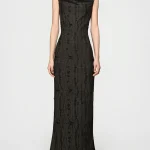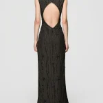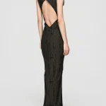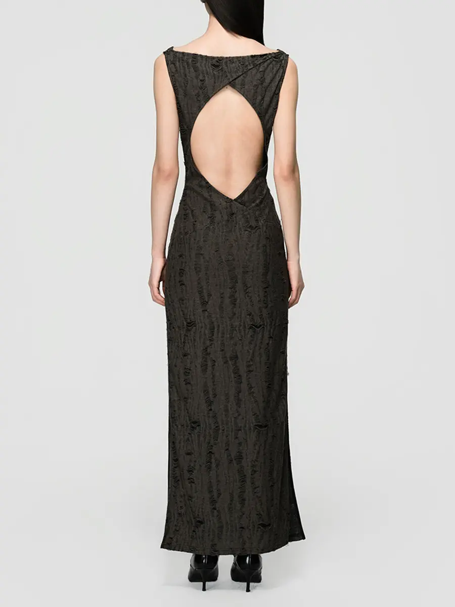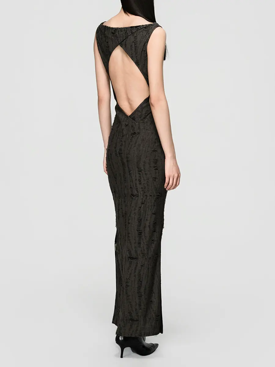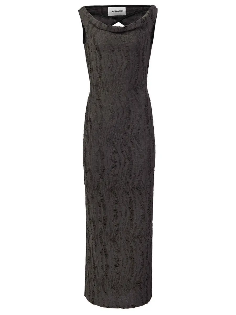 -Серое платье-макси купажированного состава от BERHASM. -Модель облегающего кроя с округлым вырезом горловины и вырезом на спинке. -Платье Grunge Babe плавно струится благодаря своей легкой ткани и расслабленному силуэту. -Едва заметная текстура и свободные линии делают изделие идеальным для непринужденных вечеров или прогулок по галереям Обхват груди 39 см Обхват талии 30,5 см Обхват подола 44 см Обхват бёдер 39,5 см Длина юбки 143,5 см