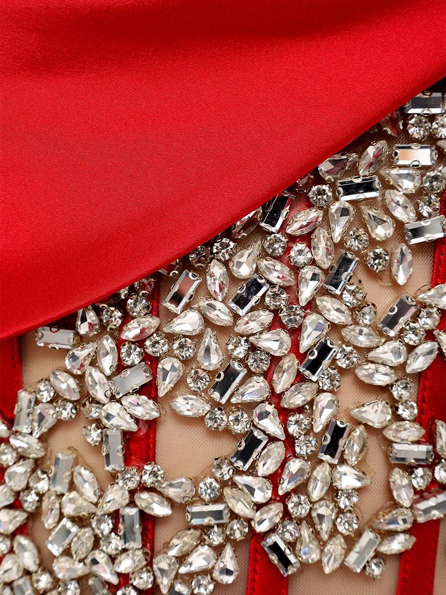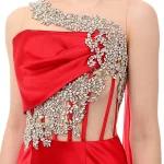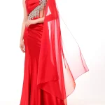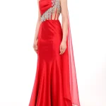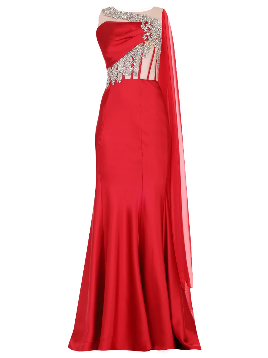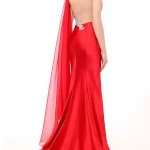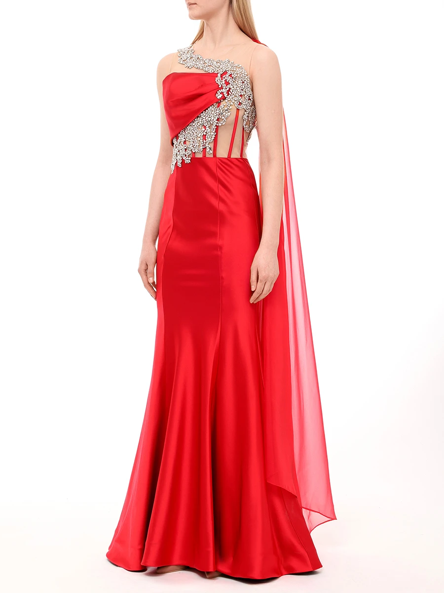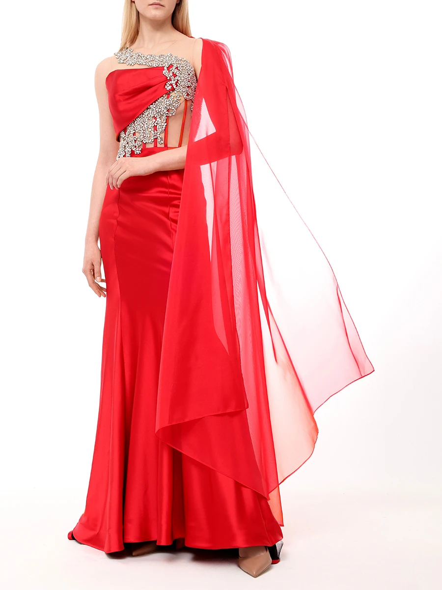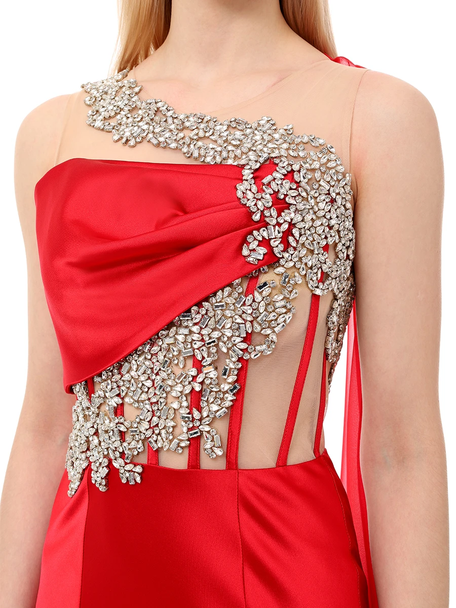 -Красное платье от LEI LUI. -Модель приталенного кроя с корсетным лифом, который поддерживает грудь и обеспечивает комфортную посадку, спинкой из сетки, имитирующей открытую спину, круглым вырезом горловины, юбкой-годе со шлейфом, застежкой на потайную молнию сбоку и декором из кристаллов. -Платье дополнено легким палантином, который закрепляется на плече с помощью кнопок.
