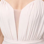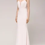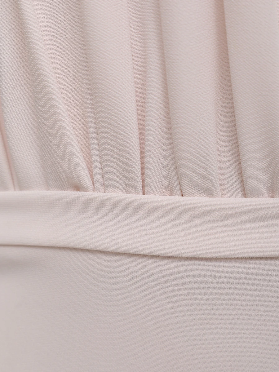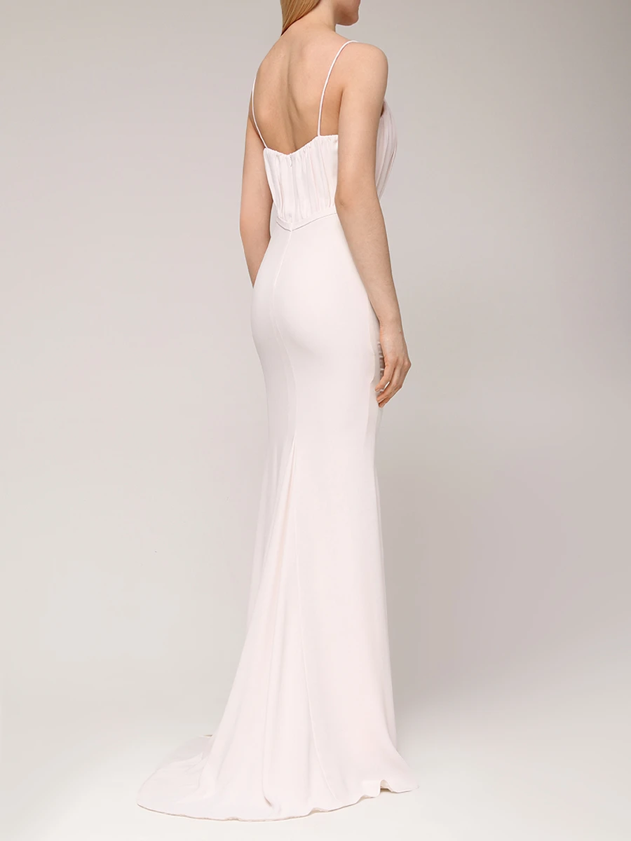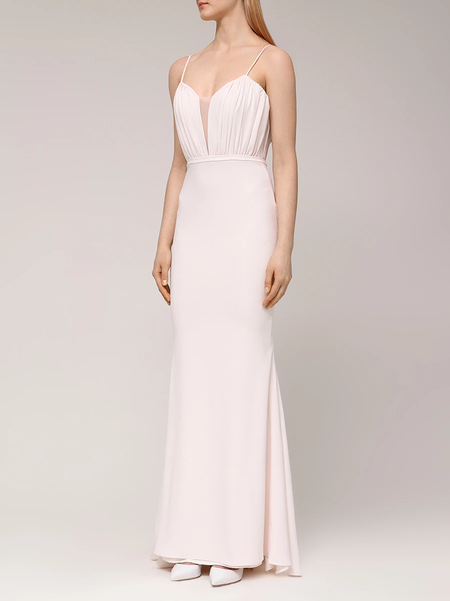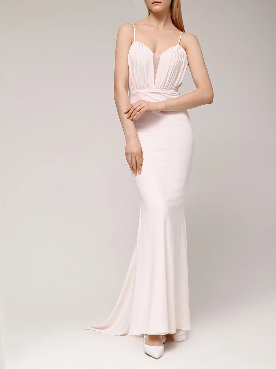 -Нежно-розовое платье от LEI LUI. -Модель приталенного кроя с драпировками на лифе, тонкими бретелями, глубоким вырезом декольте, закрытым вставкой из сетки, облегающей юбкой со шлейфом, застежкой на потайную молнию. -Классические линии кроя платья идеально обрисовывают женственный силуэт.