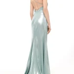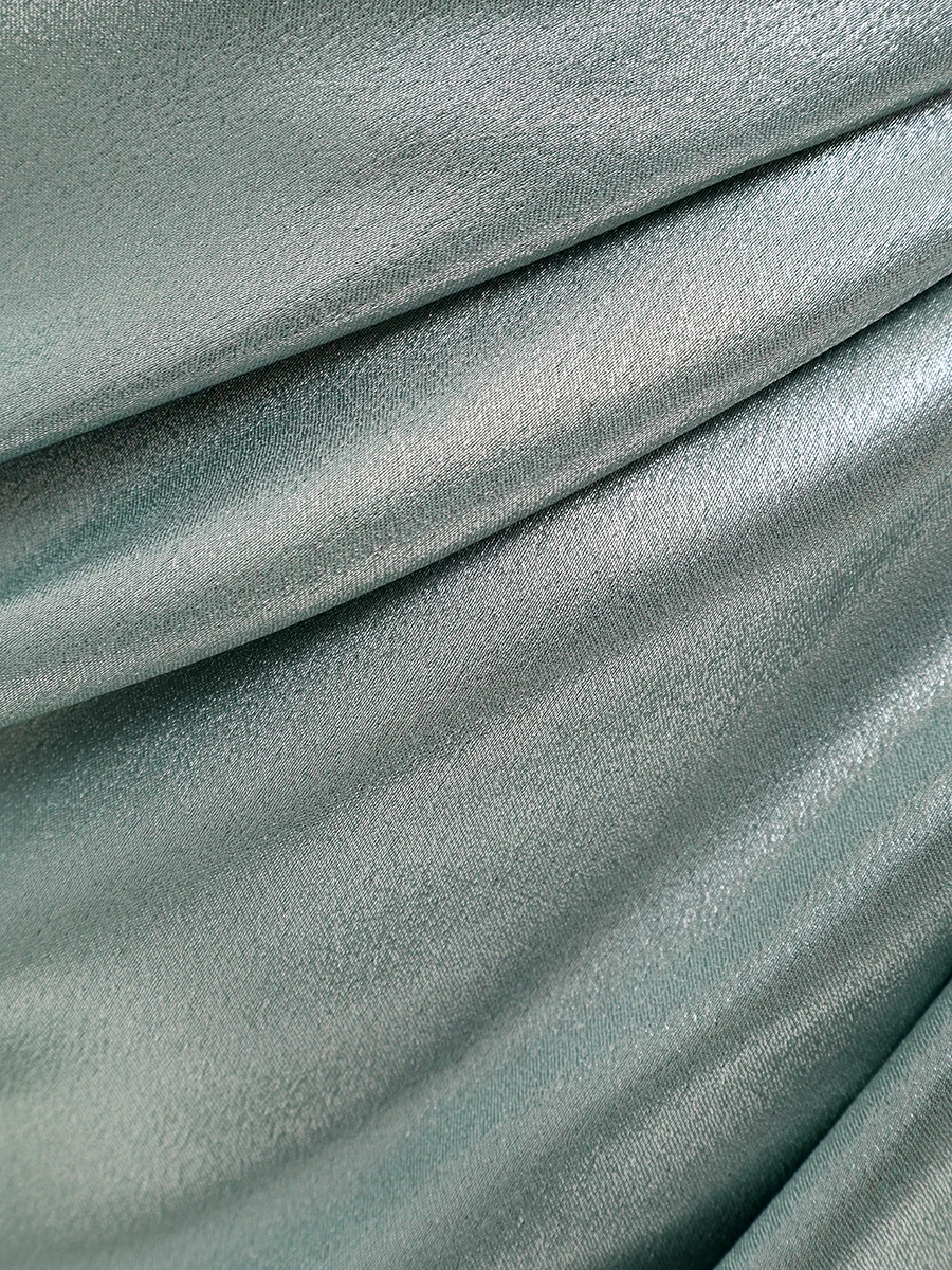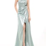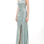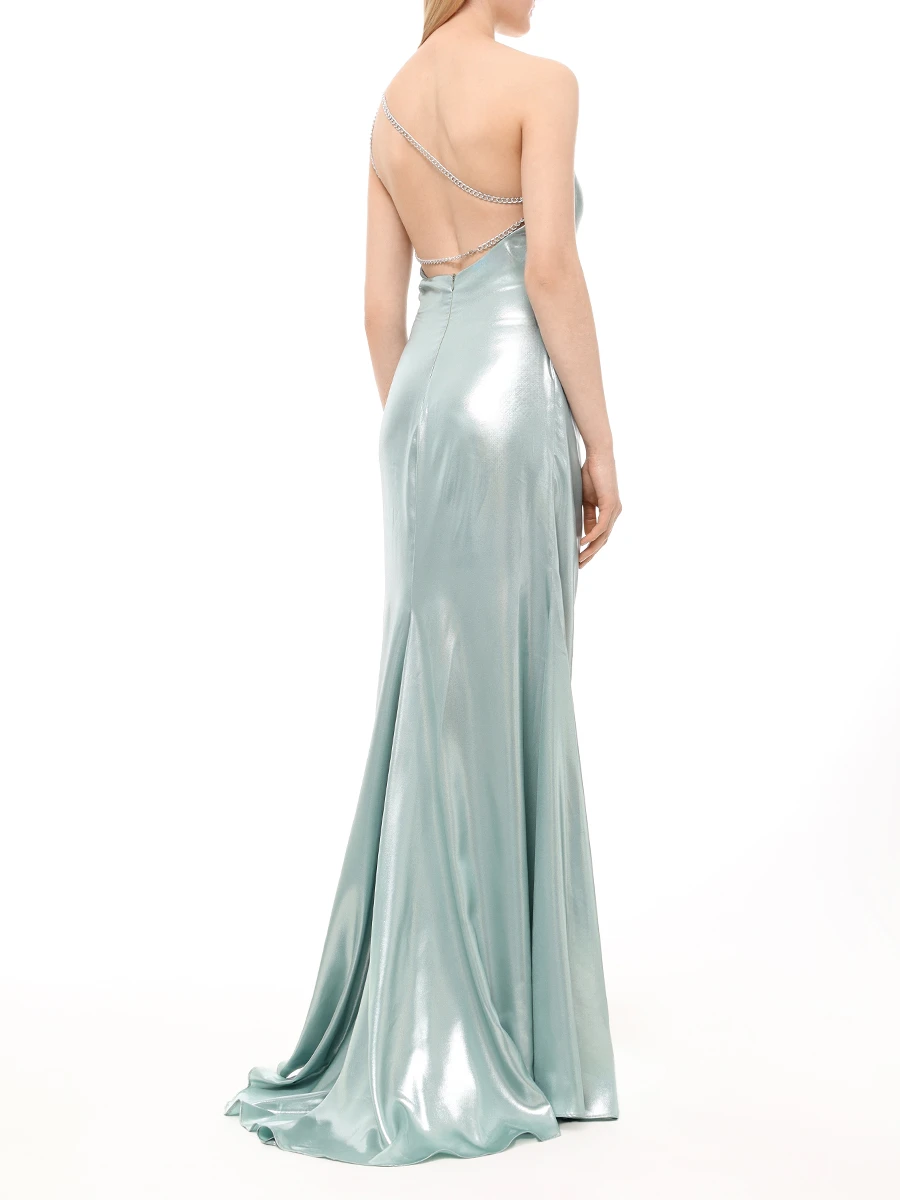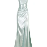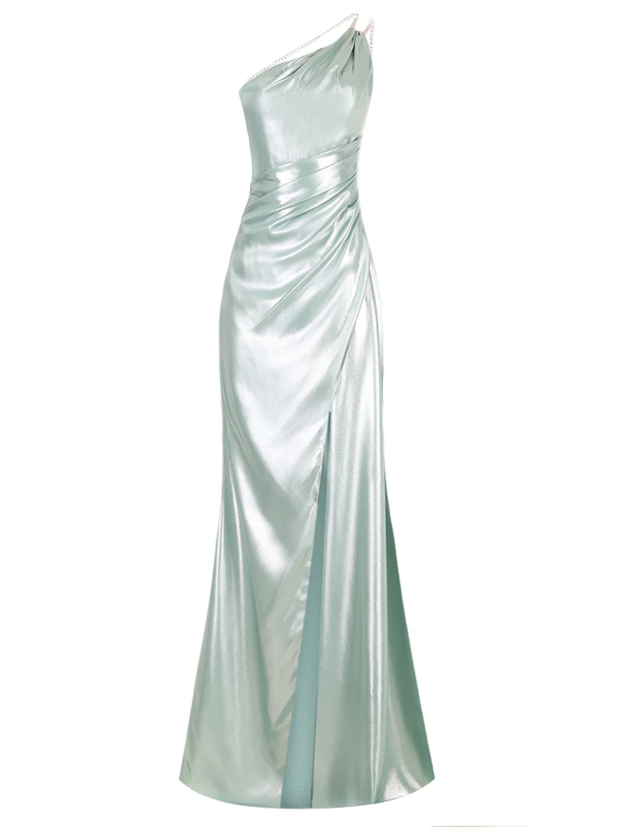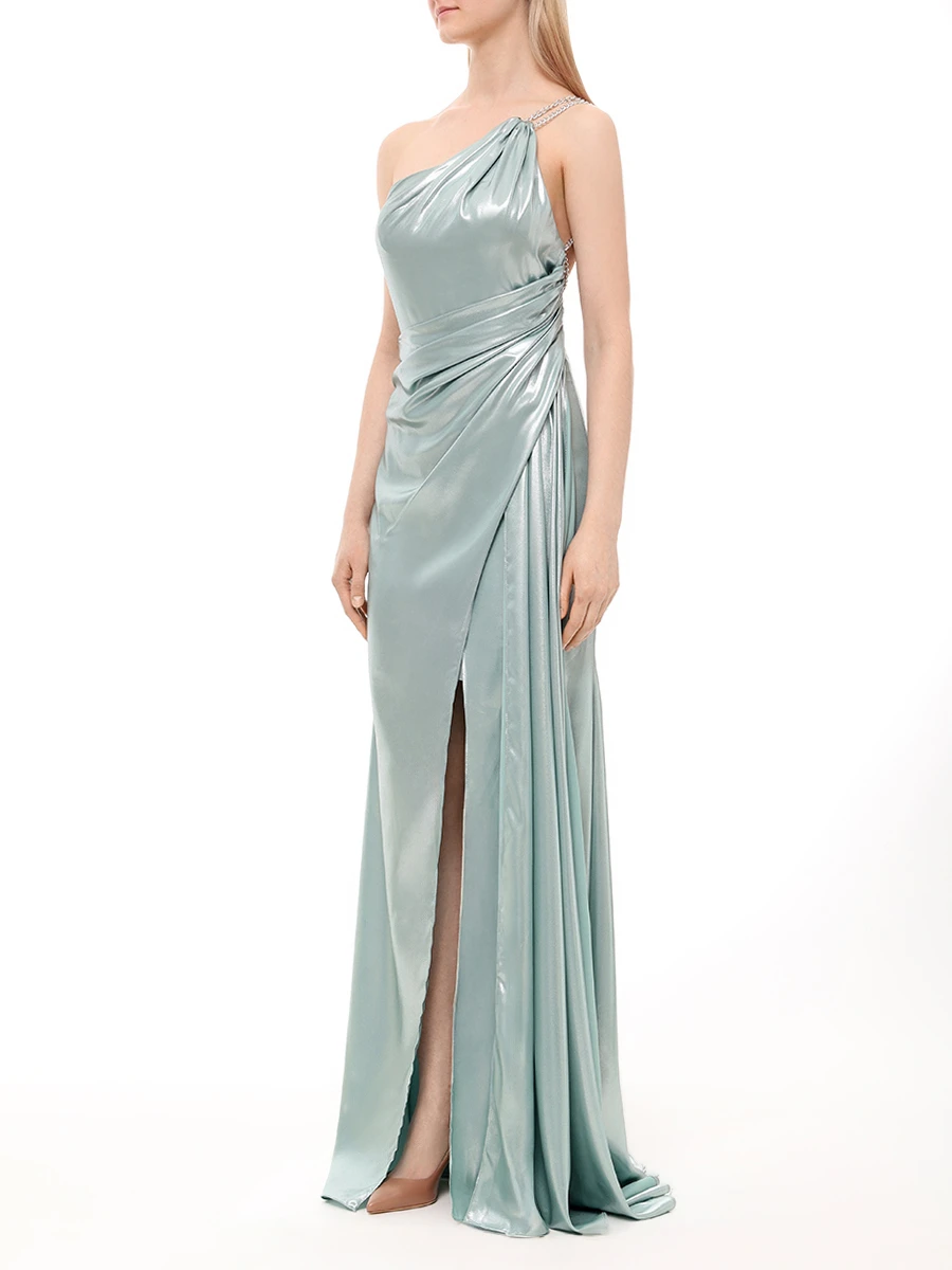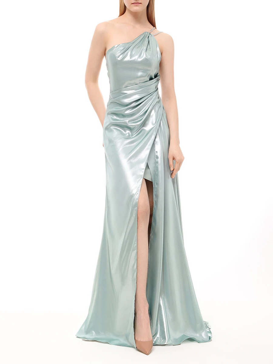 -Платье в мятном оттенке от LEI LUI. -Модель приталенного кроя на одно плечо с расклешенным подолом, драпировками, застежкой на потайную молнию, бретелями-цепочками, шлейфом и высоким разрезом на бедре. -Вечерний образ дополнят базовые туфли-лодочки или босоножки на высоком каблуке.