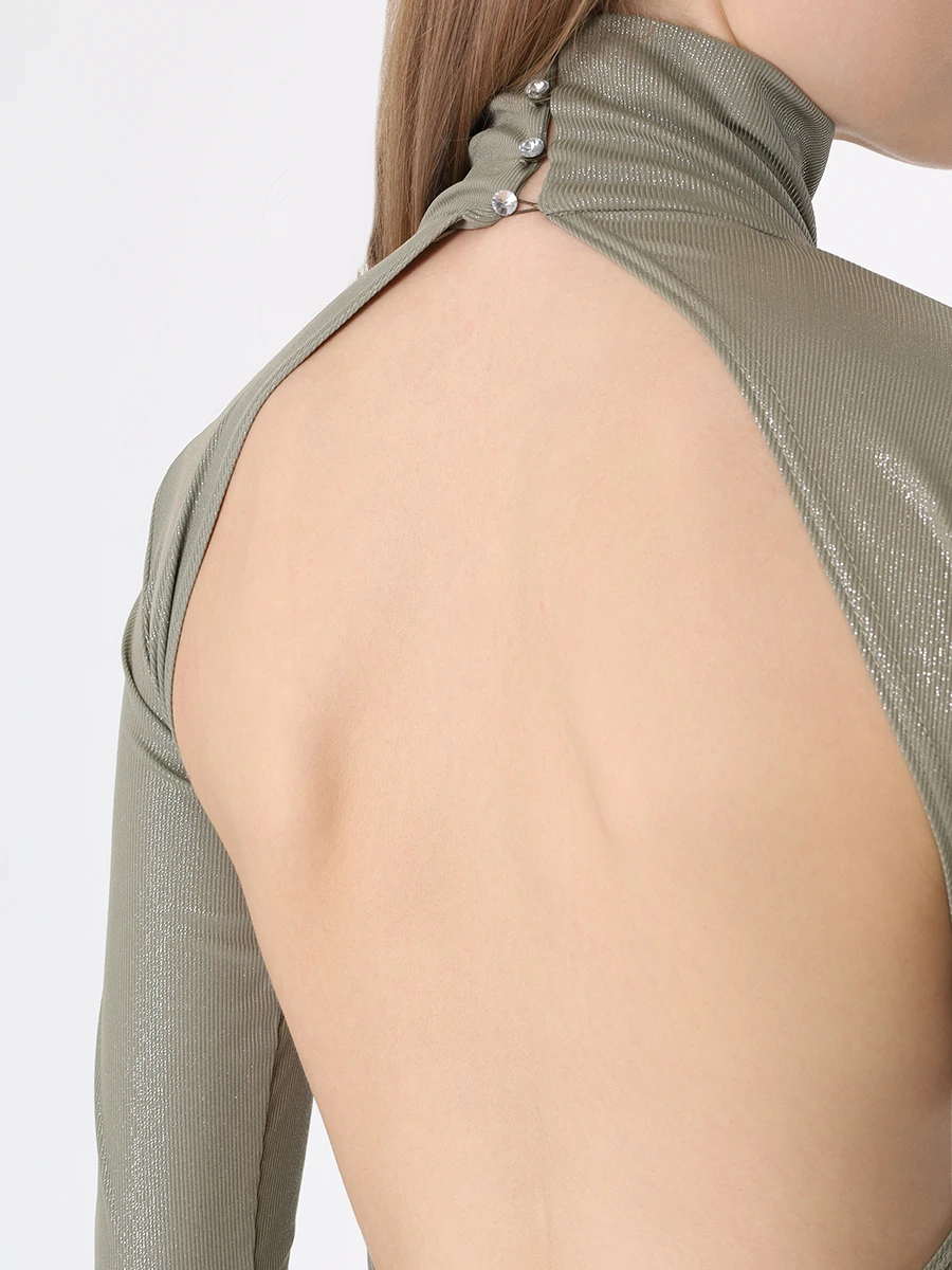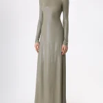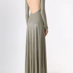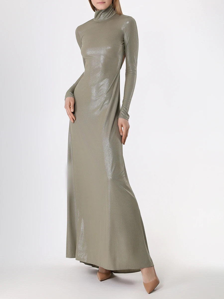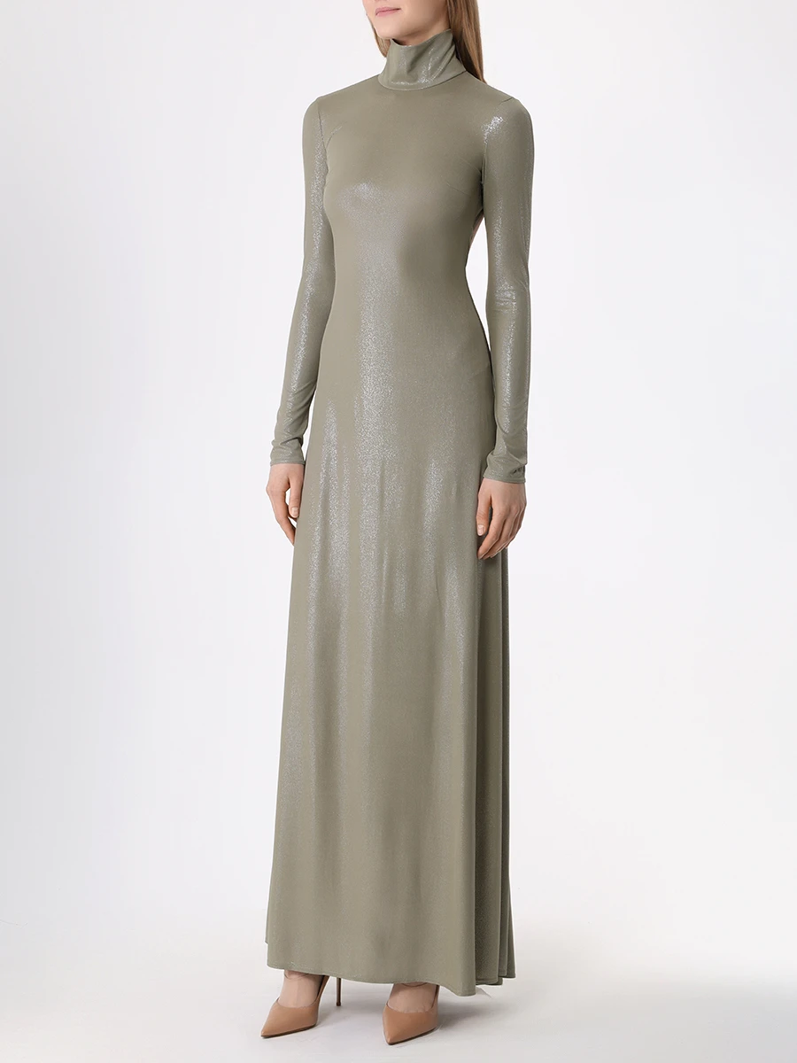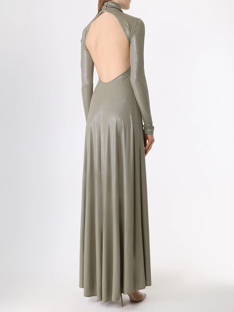 -Светло-зеленое платье-макси из смесовой вискозы от LIKE YANA. -Модель в пол приталенного кроя с длинными рукавами, высоким воротником, расклешенной юбкой, в которой ткань драпируется крупными волнами-складками, открытой спиной.