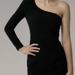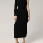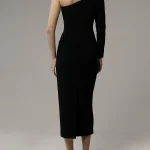 -Черное платье-миди от LOST GENOME. -Модель облегающего кроя с фигурной линией декольте, открывающей ключицы, одним узким рукавом с потайной молнией, шлицей и застежкой на потайную молнию на спине. -Платье выполнено из триацетатного полотна, которое по своим свойствам похоже на плотный шелк, поэтому изделие почти не мнется и не теряет внешний вид со временем, также за ним легко ухаживать.