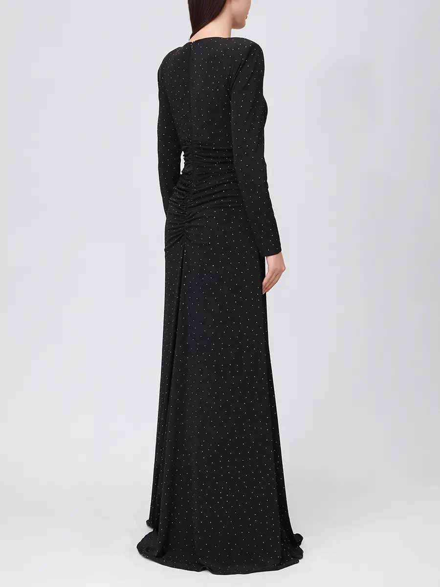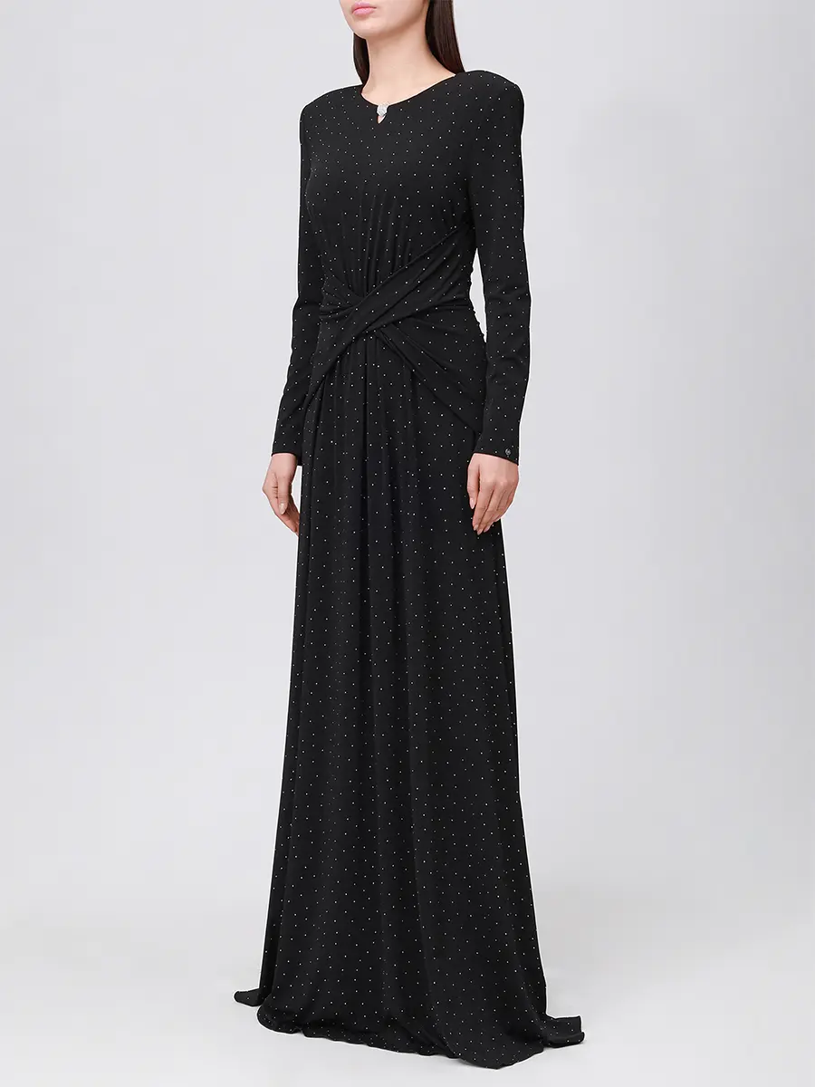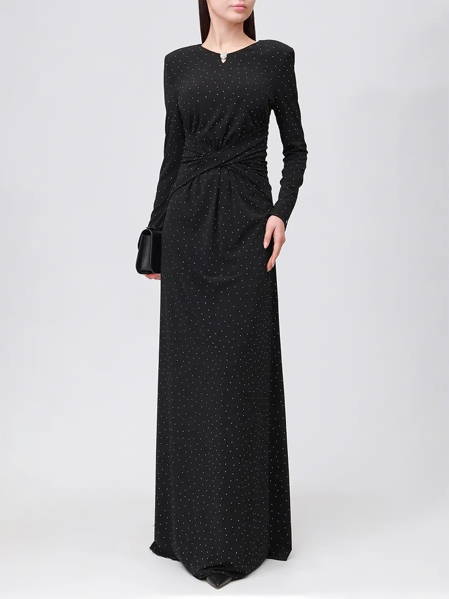 -Черное платье-макси от NISSA. -Модель приталенного силуэта с длинными рукавами и деликатным округлым вырезом на груди, драпировкой на талии и застежкой на молнию на спинке. -Полотно полностью расшито мелкими кристаллами, и их рассеянное сияние делает фактуру живой, будто мерцающей изнутри. -Лаконичное платье, в котором нет ничего лишнего уместно дополнит коктейльные или вечерние мероприятия.