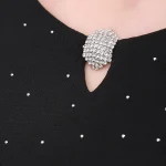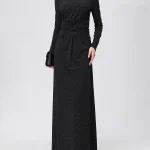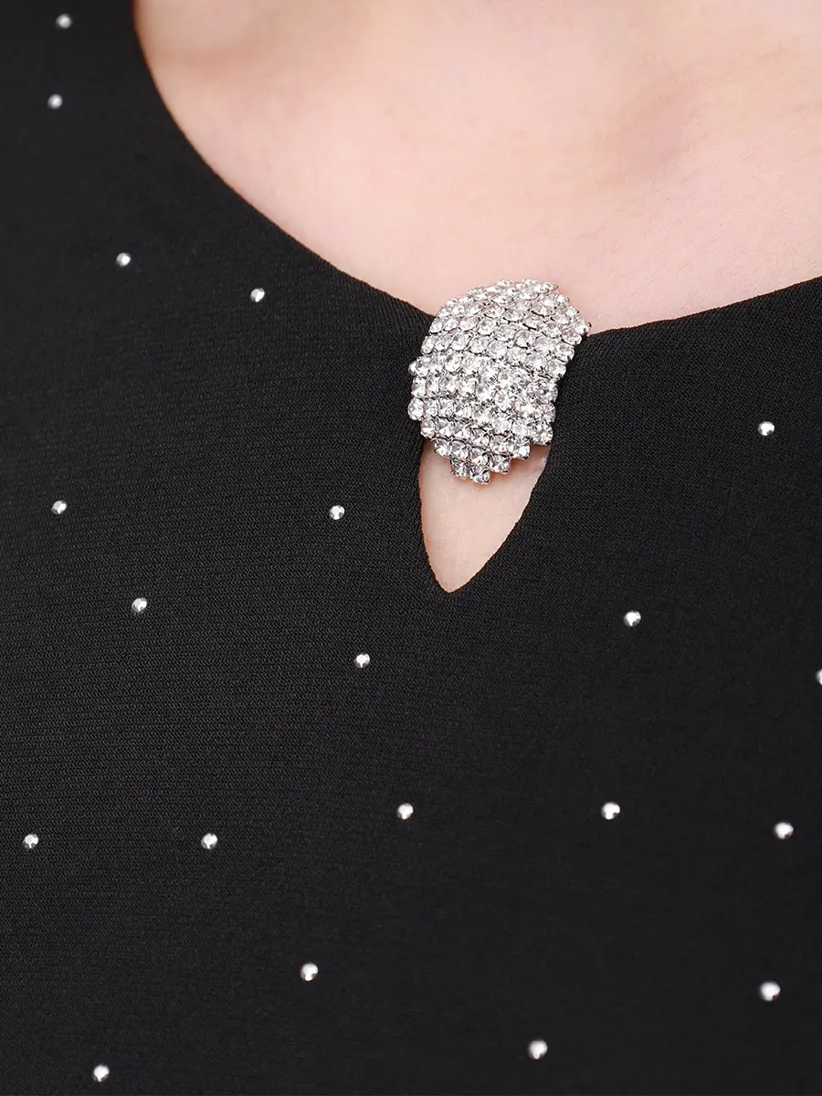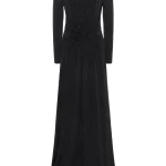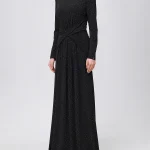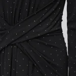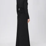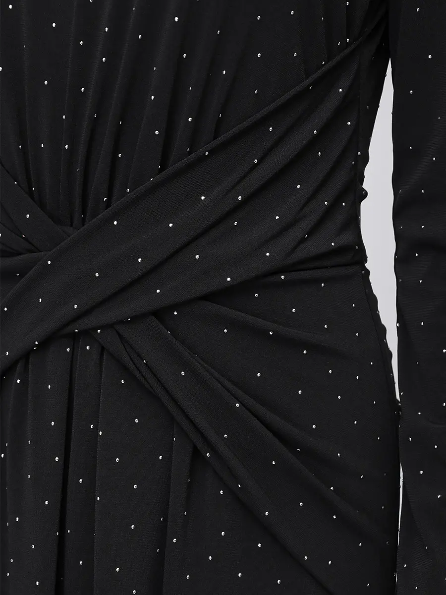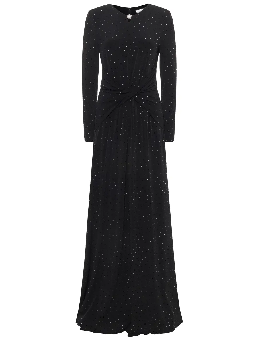 -Черное платье-макси от NISSA. -Модель приталенного силуэта с длинными рукавами и деликатным округлым вырезом на груди, драпировкой на талии и застежкой на молнию на спинке. -Полотно полностью расшито мелкими кристаллами, и их рассеянное сияние делает фактуру живой, будто мерцающей изнутри. -Лаконичное платье, в котором нет ничего лишнего уместно дополнит коктейльные или вечерние мероприятия.